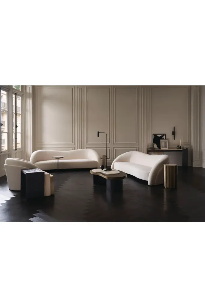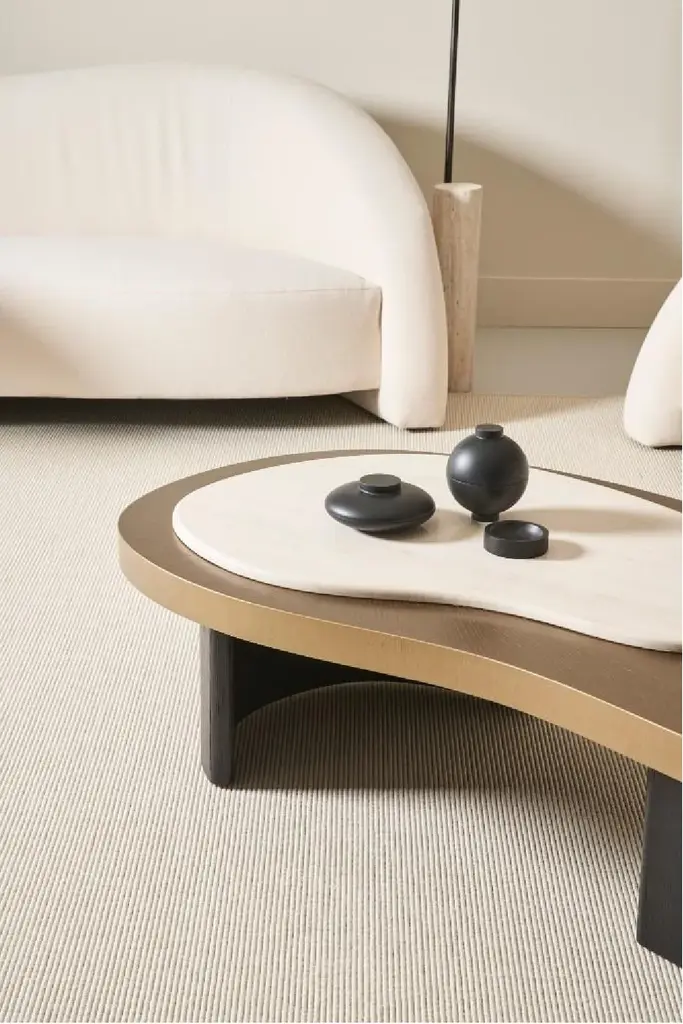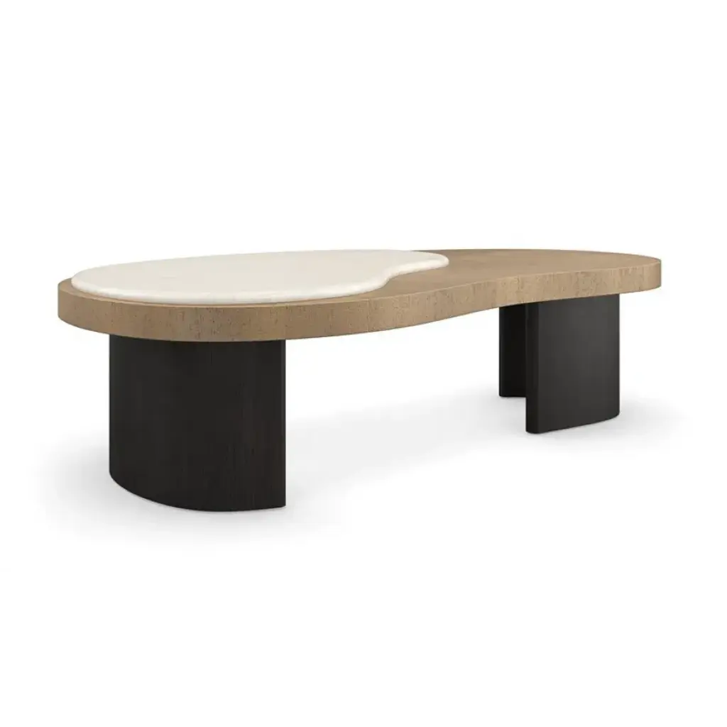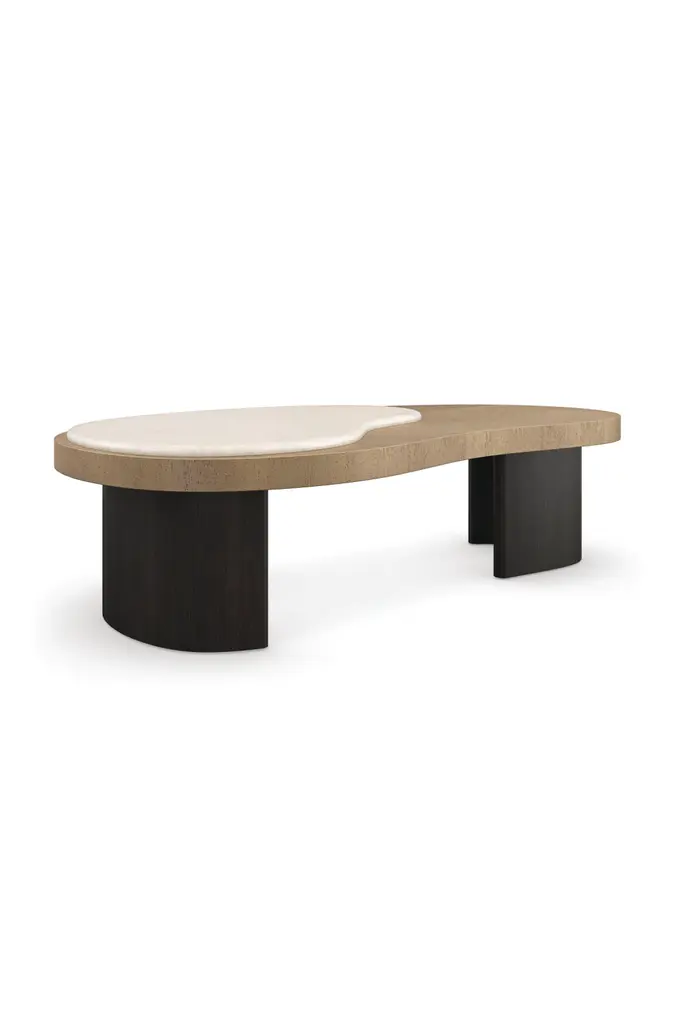 An artistic expression of modern elegance, this cocktail table adds interest and fluidity to living interiors. Its sleek design is comprised of an asymmetrical top crafted from radiating quarter sawn oak in Lucent Bronze, accentuated by a kidney-shaped stone section for added depth and striking contrast. A curved pedestal base in a dramatic Cinder finish naturally mimics its sense of movement.