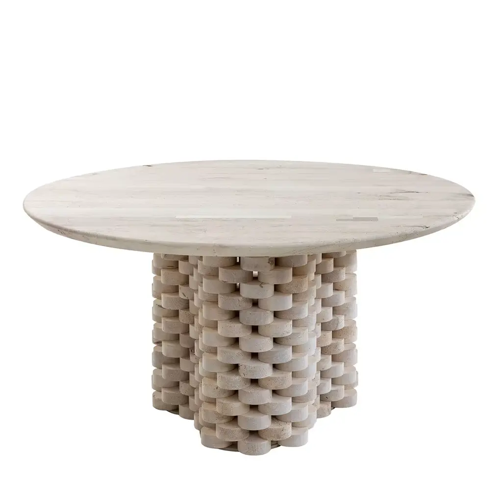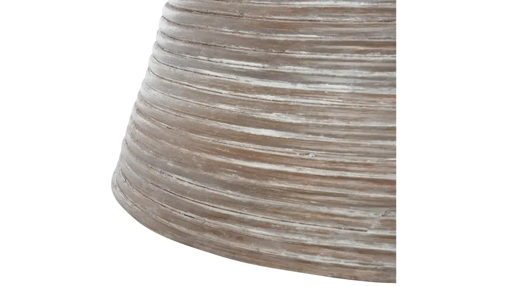 This pedestal style Cristina Rattan coffee table boasts an expertly sculpted silhouette for a sense of balance and rhythm in any decor. Mansel's subtle spiral striations evoke images of tree rings, softening its sharp modern look with a touch of organic artistry.