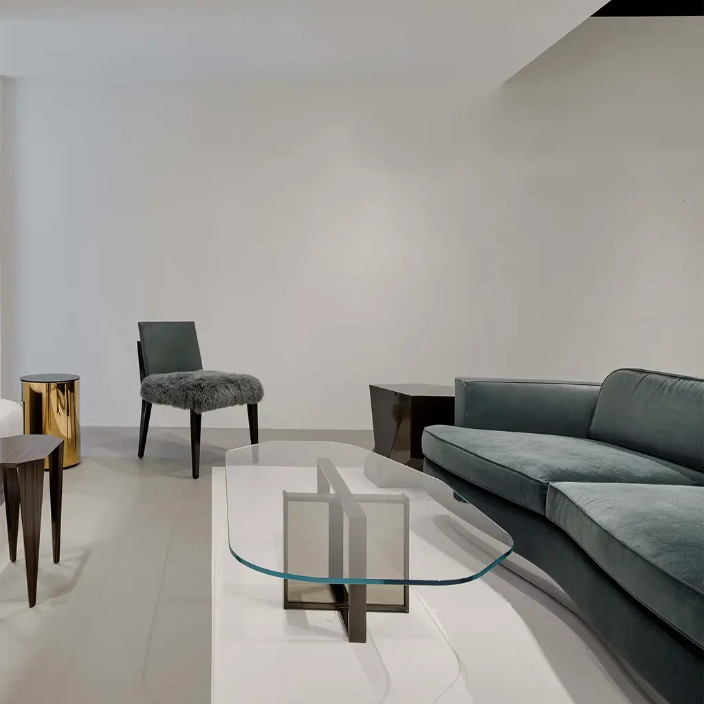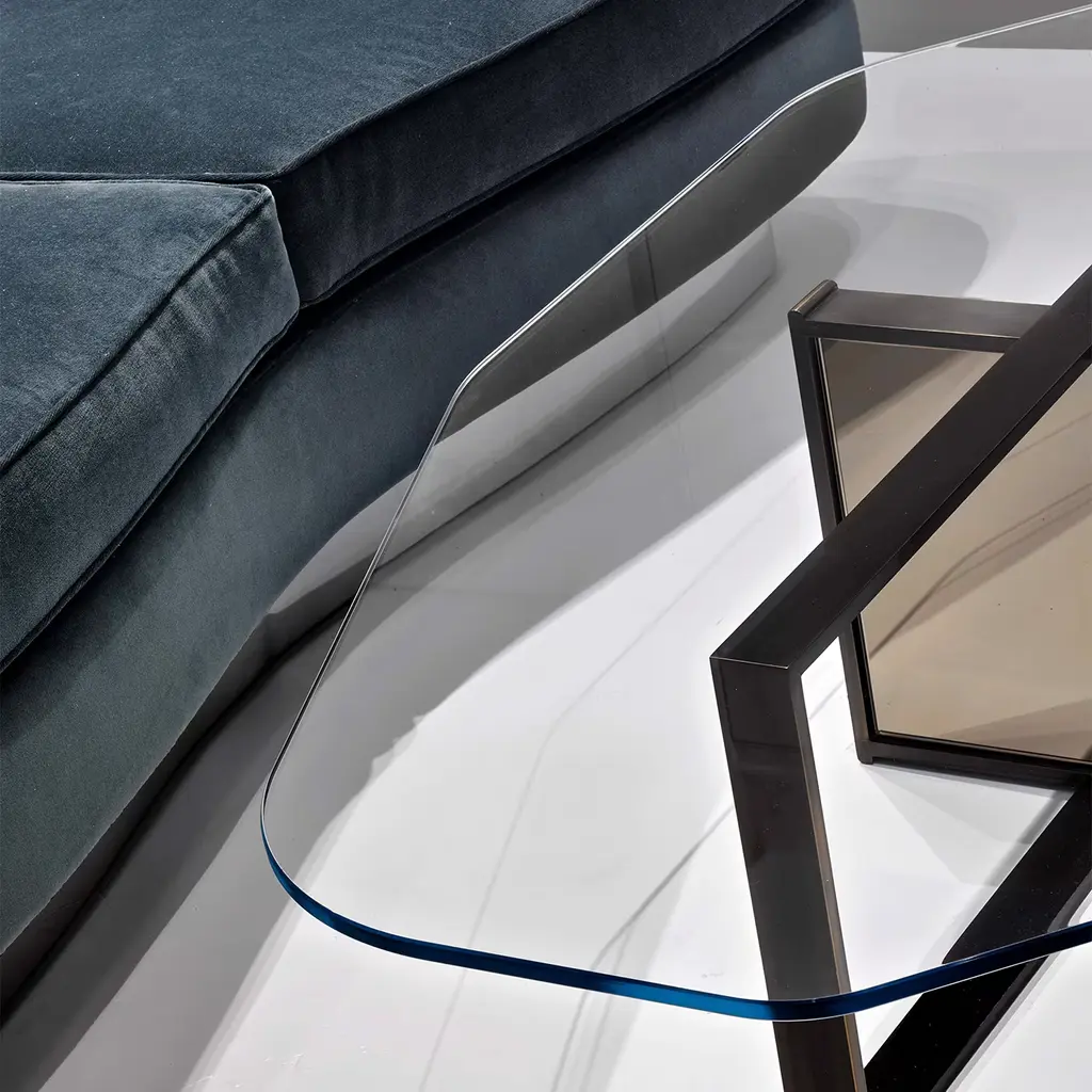 With its irregular tempered glass top and its bronze and cast glass base, the Cross Bar Table is akin to a vintage piece of jewelry, it accessorizes any space. Part of the Cubist Collection, the Cross Bar Table's irregularly shaped top follows the theme of the collection of distorting the traditional and creating new forms. Smoke glass base with stainless steel frame in a dark bronze finish.