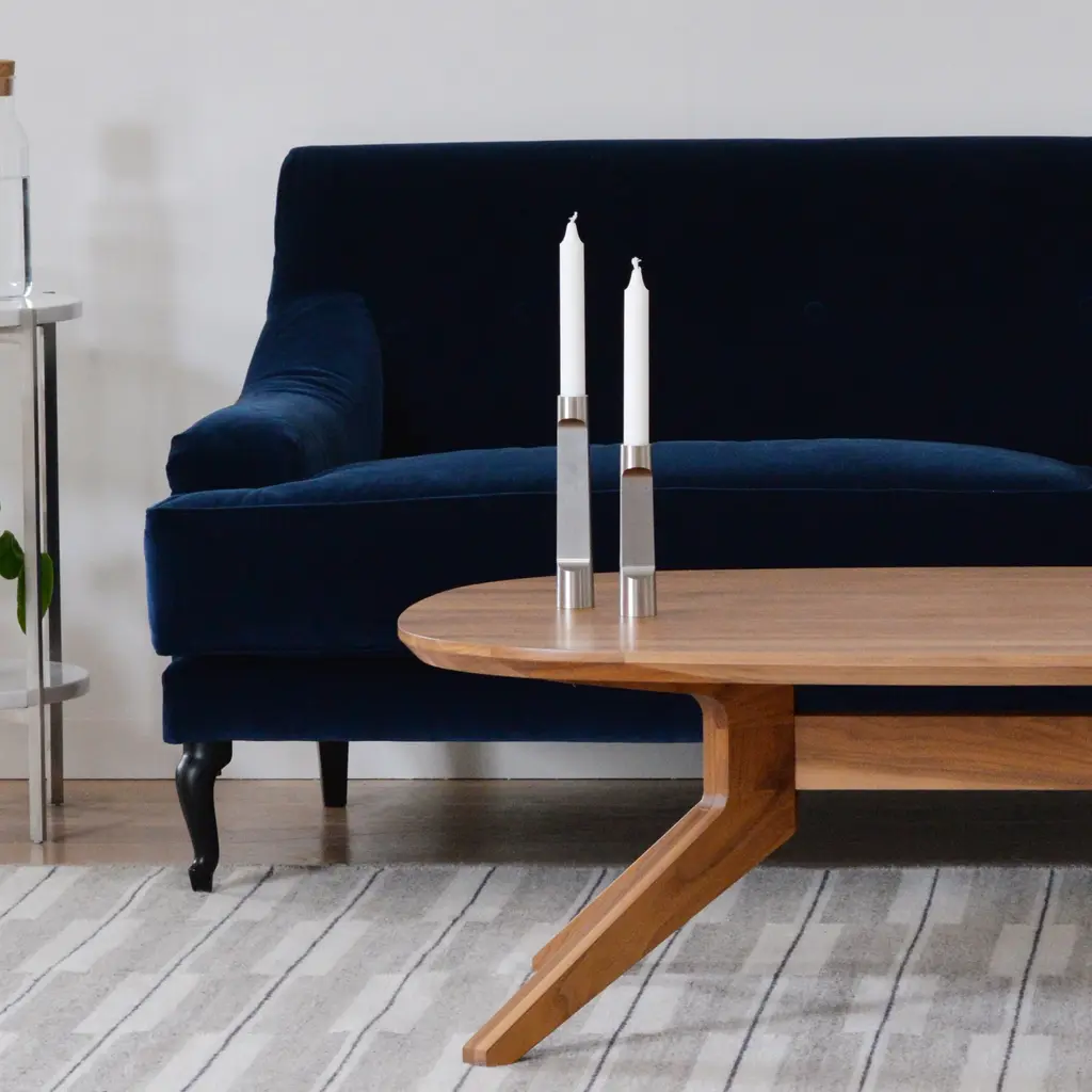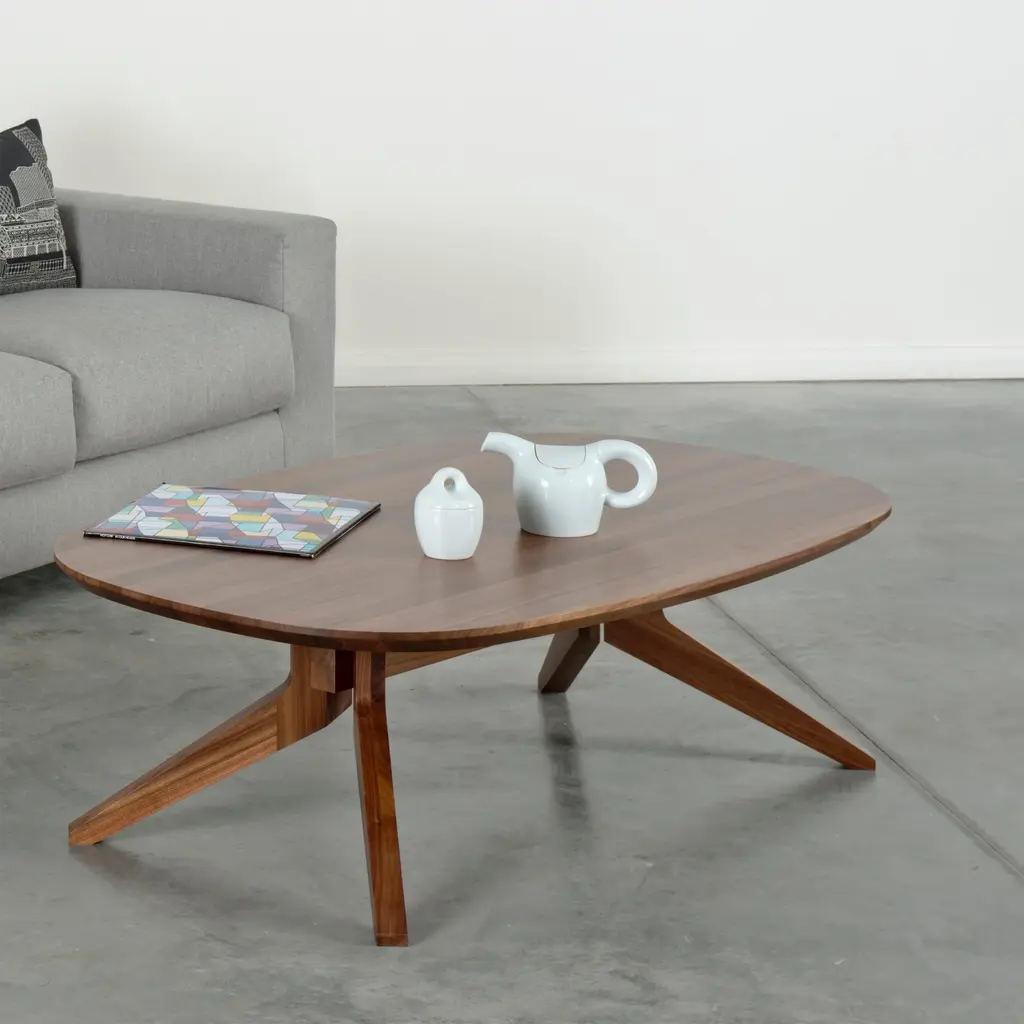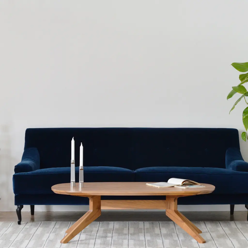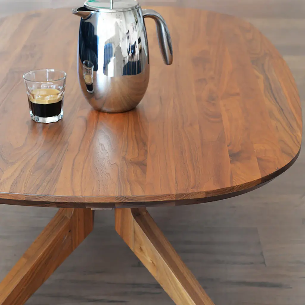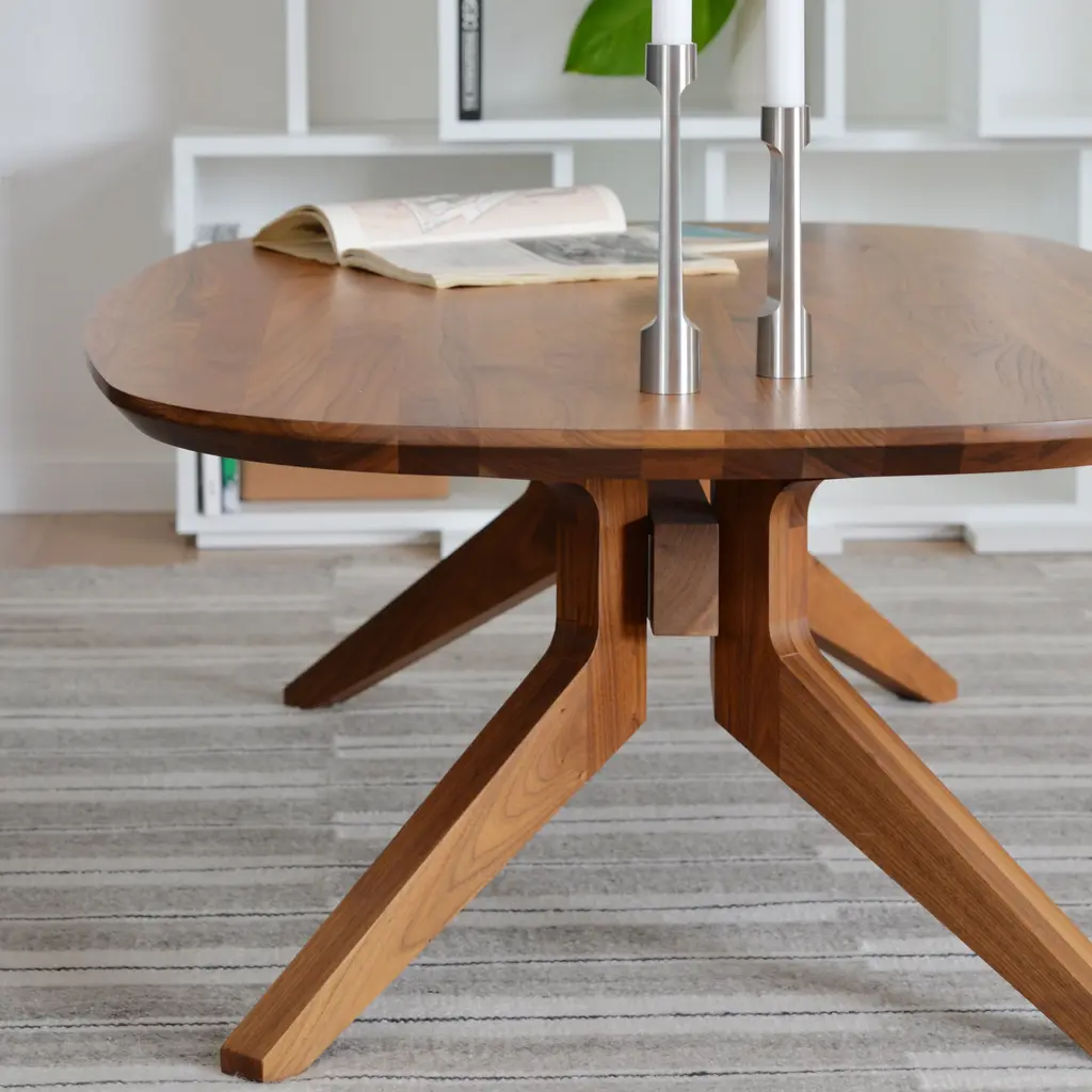 With an elongated rounded surface, Matthew Hilton augments his Cross series with an oval coffee table with a distinctive trestle-style base and angled legs. Fashioned in solid oak or walnut with a veneered top, the clear lacquer finish enhances the warmth of the wood while assuring low-maintenance care for this timeless piece.