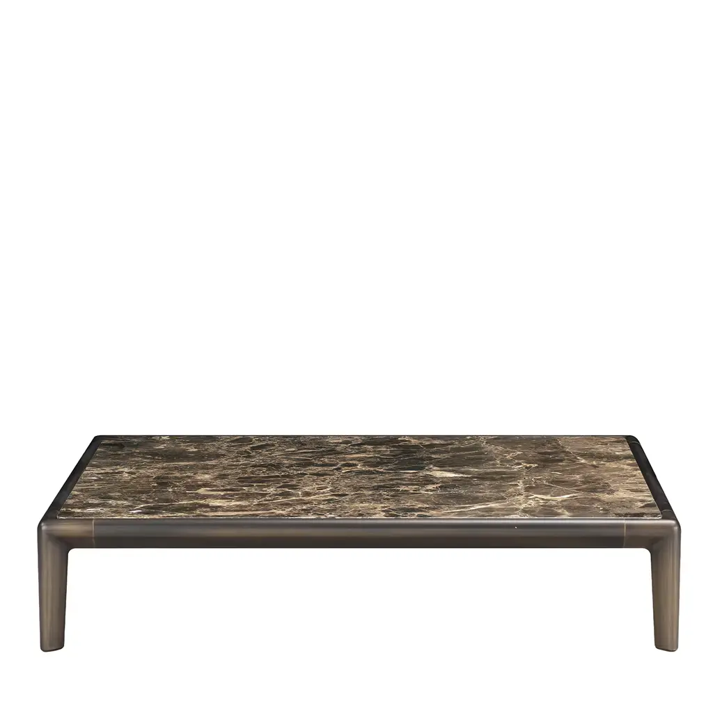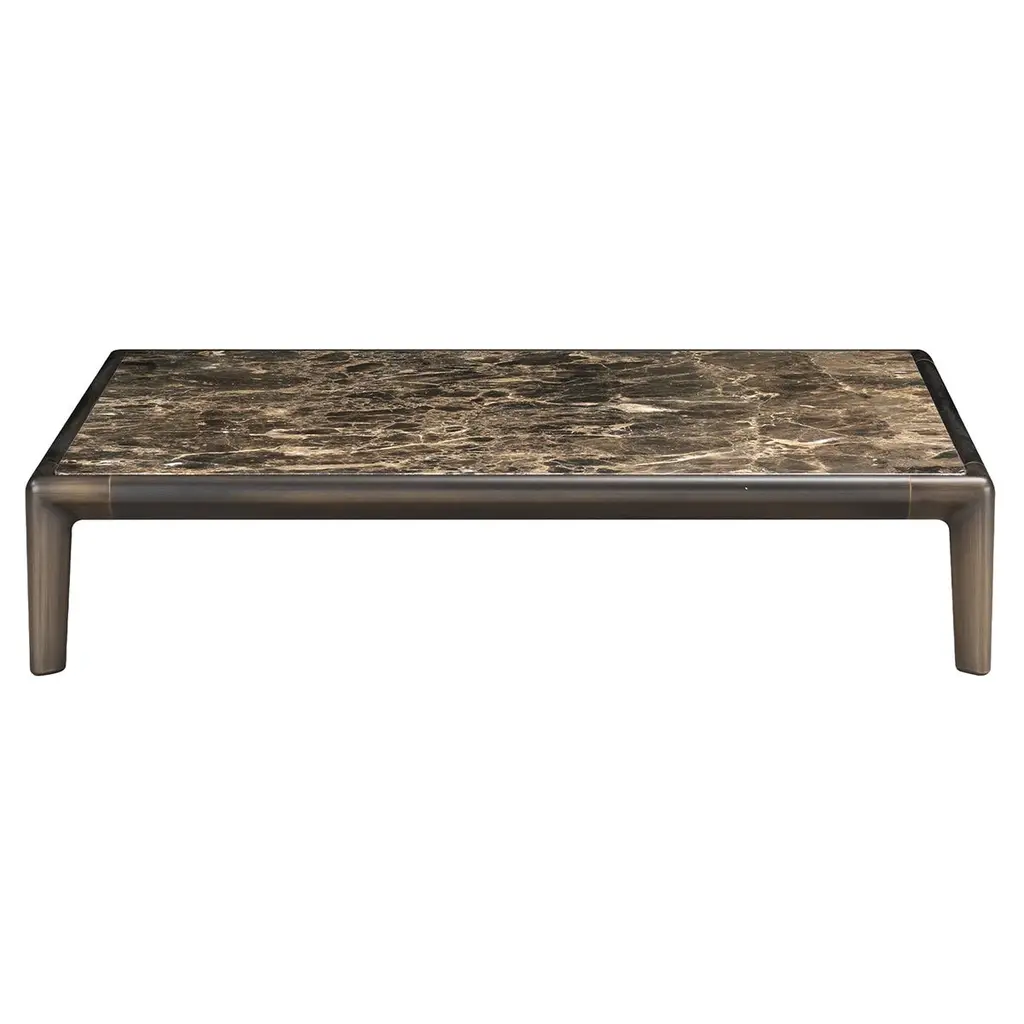 Imbuing a contemporary setting with romantic and sophisticated allure, this coffee table is distinguished by a stupendous use of first-rate materials. Resting on a sleek and clean base with four short legs handcrafted of smoked Teak wood, the top is fashioned of precious Capraia marble, showcasing gorgeous natural veining.