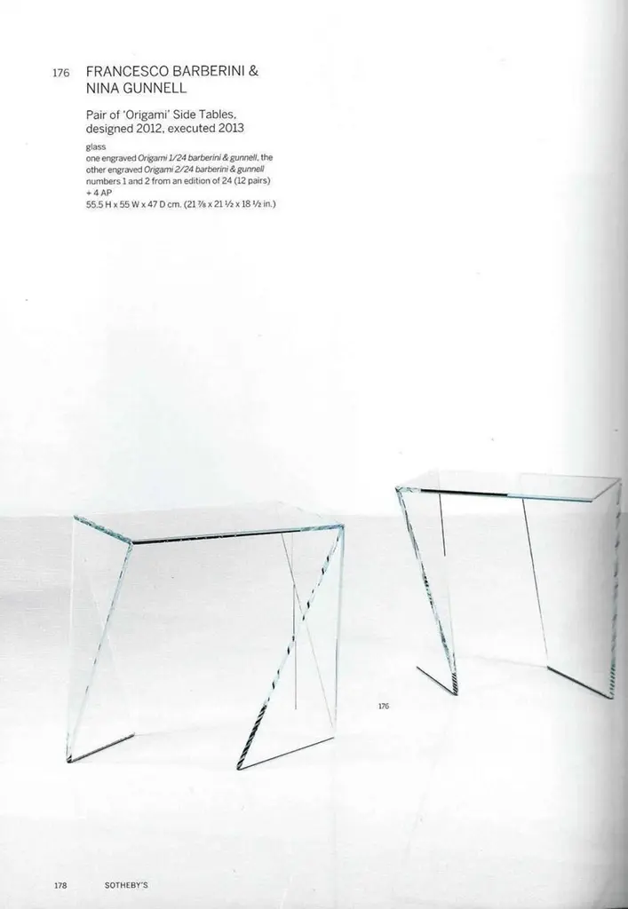 The coffee table 'Origami' is made of extra-clear crystal glass. Each sheet of extra-clear crystal glass is cut and ground with extreme precision, then the sheets are assembled by hand, having to fit together perfectly, the gluing operation requires extreme precision and experience. The final result is spectacular, the sloping edges of the glass create wonderful reflections and crystalline transparencies. The first 'Origami' coffee table was presented by Sotheby's for the auction on 4 November 2015.Coffee table dimension: W 140 x D 70 x H 34 cm. Dimensions are customizable.Limited Edition of 30.Each table is hand signed by the artists (engraved), 100% handmade in Italy and comes with a “Certificate of Authenticity”.The inspiration for origami came from the observation of a simple piece of paper which, being folded a few times according to an antique Japanese technique, transforms into complex and delicate figures of innate fascination and beauty: The origami.The idea starts off with the concept of taking advantage of the resistance of glass appreciating its optical lightness with the intent to unveil the similarity between the complex art of origami and the workmanship of glass showing its magic transparency.Both, paper with its light sense of touch and opacity and glass with its physical heaviness and transparency present contrary features but have also a strong attribute in common: The concept of lightness. The tables origami were created as a result of this theory.The artworks by Barberini & Gunnell are regularly shown at international art fairs, such as PAD London, PAD Genève, PAD Monaco, Salon Art + Design New York, ArtMiami.IMPORTANT INFORMATION REGARDING SHIPPING:Please contact us for an independent shipping quote as we provide high quality shipping at competitive prices due to our frequency of shipping, relations with international shipping companies and the possibility to organize directly from Italy.We take care of the entire customs procedure and paperwork. On request we organize a white glove delivery and installation of the artwork inside of the property of the client. All shipments are ALL-RISK insured.We carefully pack all artworks in strong wooden crates to ensure safe transport. This service is done directly in our atelier and is complimentary. All of our artworks travel with a shock watch system in order to monitorate rough handling by shippers and movers.