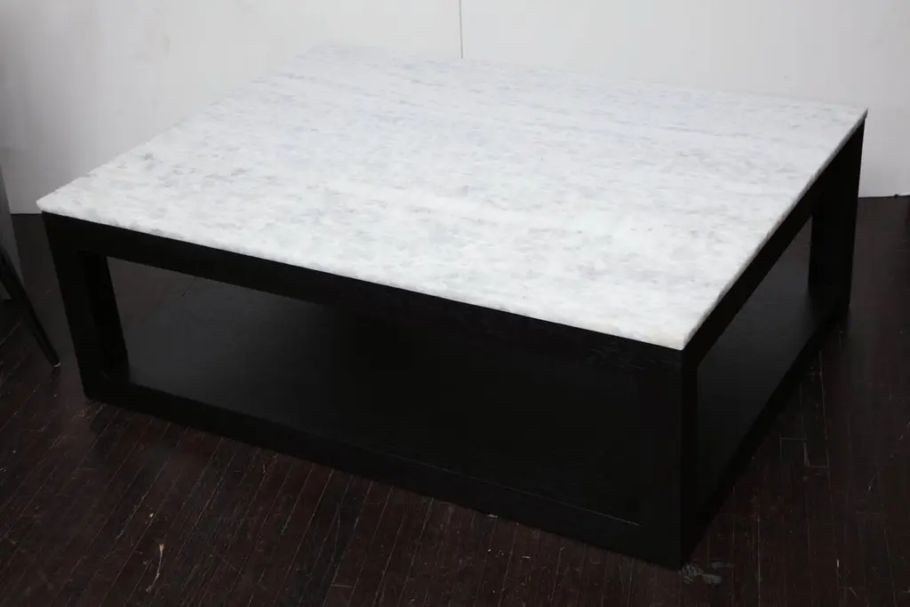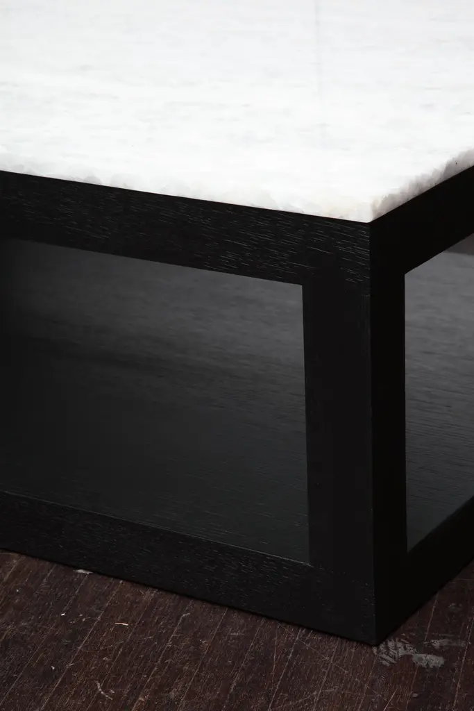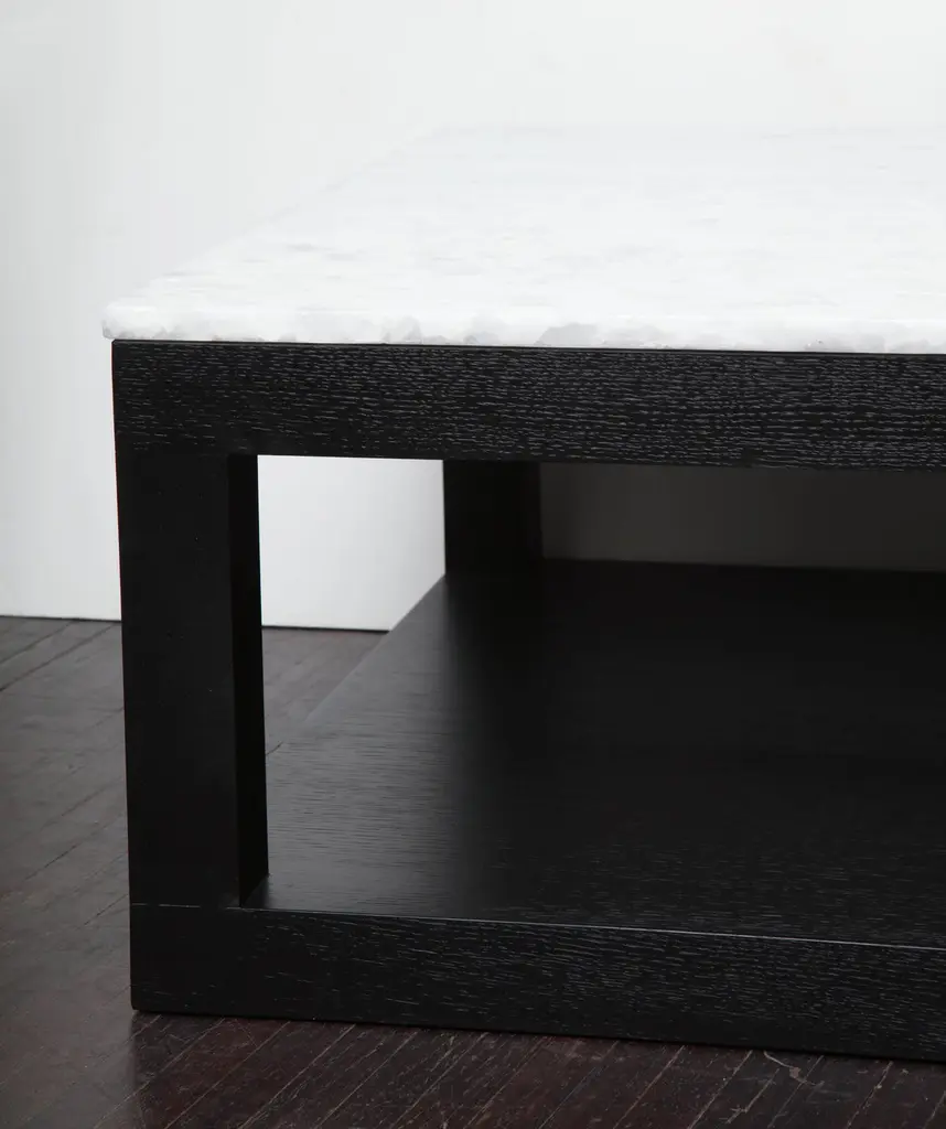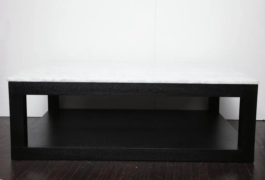 Custom crystallized quartz coffee table with ebonized wood base. Customization is available in different sizes, base finishes and quartz tops.