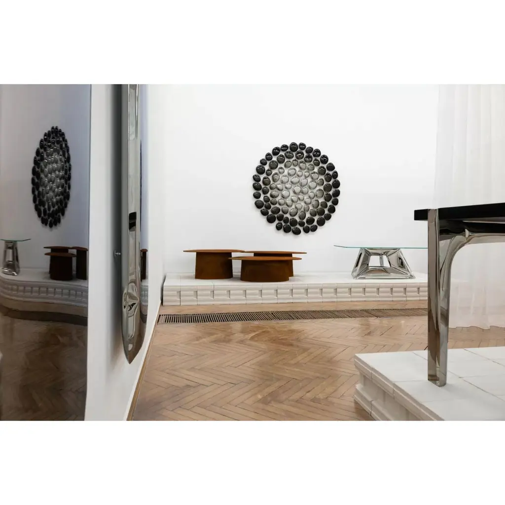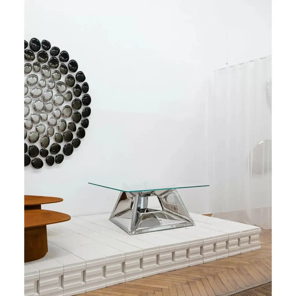 Crystals Coffee Table by ZietaDimensions: D 80 x W 130 x H 45 cm.Materials: Glass and polished stainless steel.Inspired by diamondsThe steel base of the CRYSTALS coffee table curves the surroundings in its mirrored surfaces like a kaleidoscope. The transparent glass top exposes the shapes of the parametrically designed base, reveals the purity of the form, and enhances the optical experience.Zietas main goal is to deliver uniqueness and customization in design and constructions while keeping the production, transport and warehousing innovatively efficient.This is how they imagine the future world: Light, durable structures of customized applications produced on demand out of one-of-a-kind parts, yet efficiently.They use computer controlled production process. Customized pattern, customized form, customized function, one-of-a-kind product and outstanding precision are what they deliver.You will find all of this philosophy reflected in the products. They research, they discover new possibilities, they play with forms and they deliver a beautiful, innovative, surprising outcome to people who love design and who care about the design development.They believe their work is a valuable contribution to the world of design not only by the unique beauty of the forms but most of all by opening ultra-innovative opportunities of forming and new paths for the world of future.
