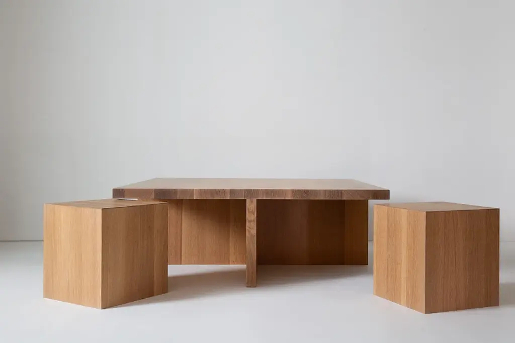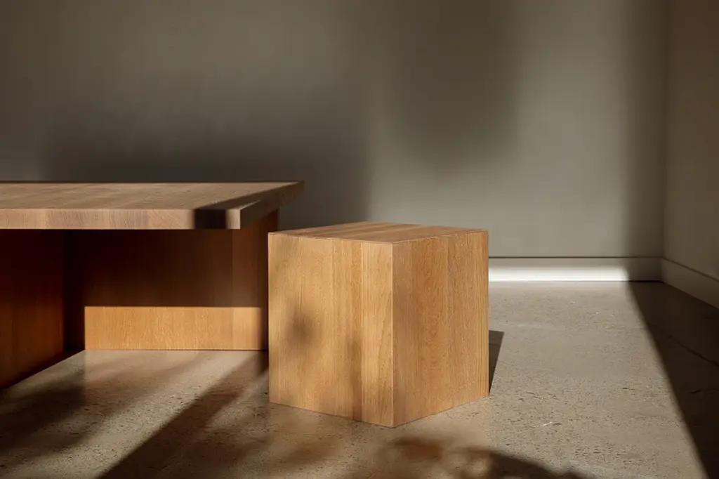 Made from solid Oak, the Cube + Void Table variations are studies in form and negative space. With different leg structures, the tables offer different profiles. Cube + Void Coffee Table Two has a simple, symmetrical X leg structure. The table is identical when viewed from any side. The Cubes can be configured around the table in various ways, inviting sculptural play with the form of each piece. Profoundly utilitarian, Cube + Void artfully explores the interplay between form and negative space. The collection is quiet yet striking, drawing on monumental forms that highlight scale and showcase the inherent beauty of the collection’s materials. Cube + Void is made from solid, domestic hardwood and finished with Kalon’s signature Bare Finish — a premium organic, natural oil-wax finish.