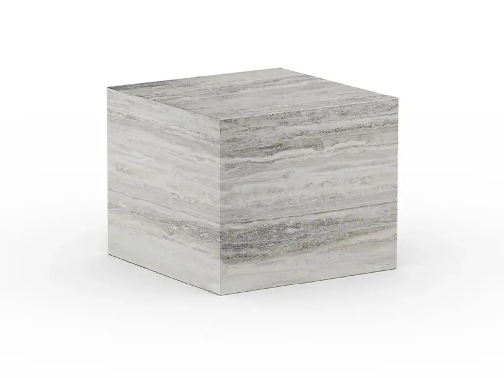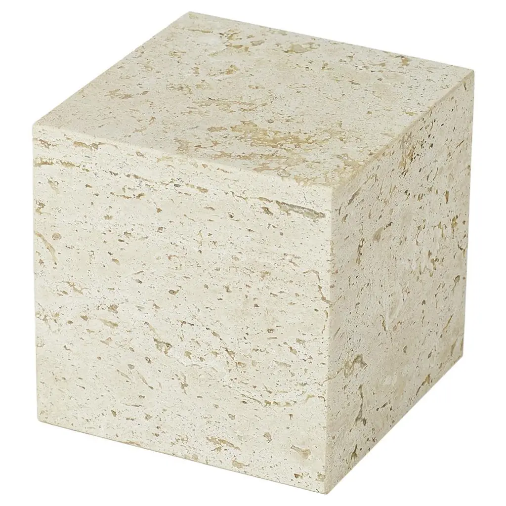 Cubism is a travertine stone slabs with felt bottom. The surface of the table is polished and untreated.Travertine is a natural stone material, which means that every slab varies in terms of vein pattern and color. Travertine has an open surface, which means that if water is left on the surface for a period, it can leave marks. Therefore, we recommend using coasters for items that can leave marks and stains.Please do not use cleaning products containing acid on the surface. It is recommended to use cleaning products intended for natural stone. For a more durable surface, an impregnating surface treatment can be applied using stone oil or stone treatment products.Extended exposure to the outdoors can lead to color changes and staining. During the winter season, we advise covering the tables with a waterproof cover or storing them indoors.Made from travertine stone, Cubism is all about embracing the qualities and beauty of the material, which for centuries has been used in classical architecture around the world. The natural stone has an irregular surface with small holes and imperfections, adding a tactile quality to the geometric shape.Cubism comes in two sizes and is suitable for many purposes, such as coffee tables, side tables and plinths to exhibit objects.