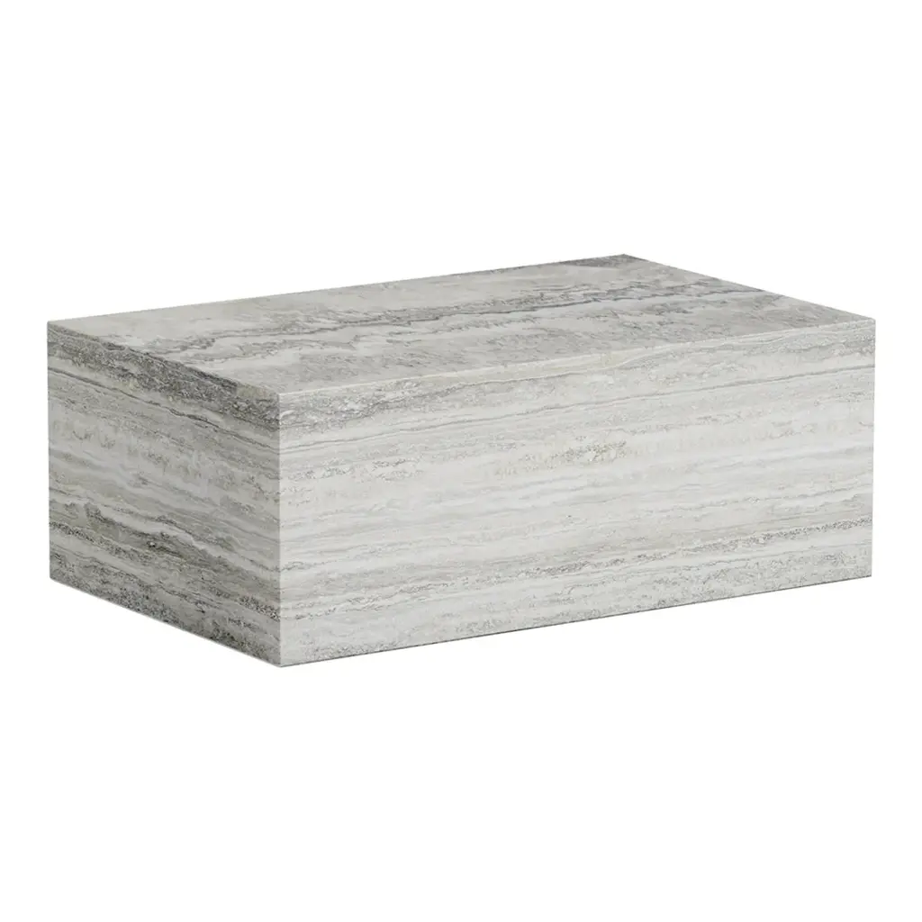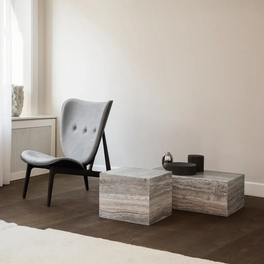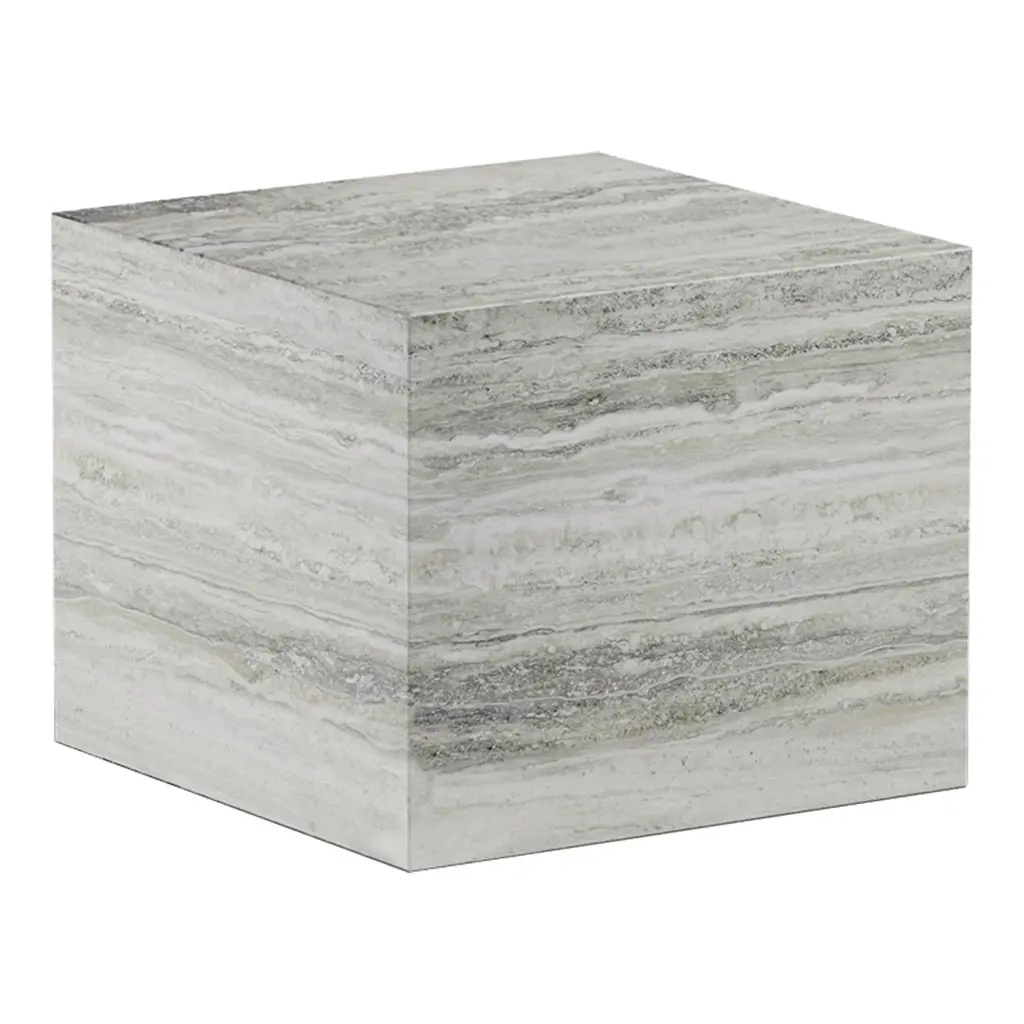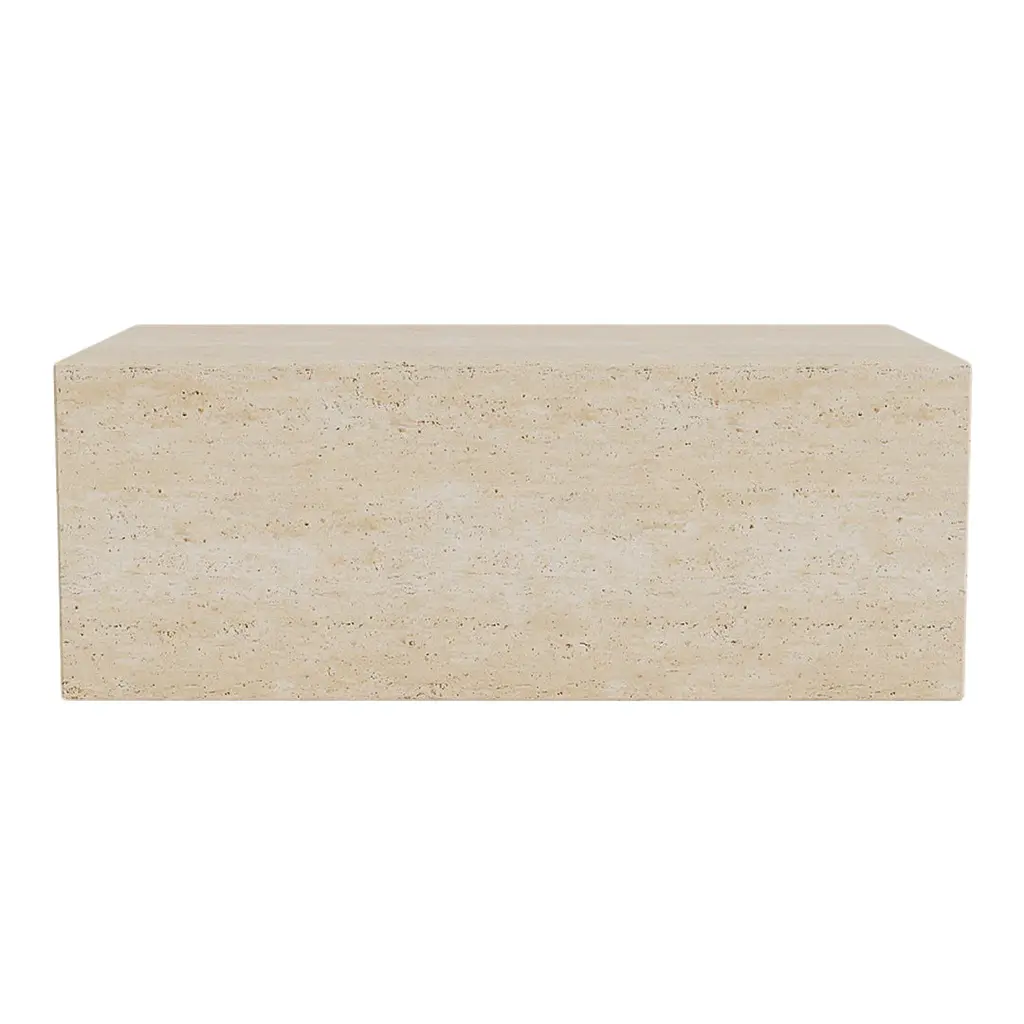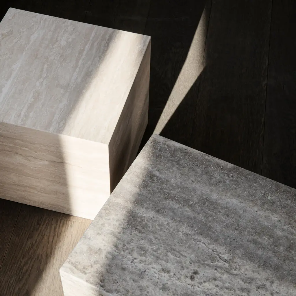 Made from travertine stone, Cubism is all about embracing the qualities and beauty of the material, which for centuries has been used in classical architecture around the world. The natural stone has a tactile surface with small holes and incorrections, adding a tactile quality to the geometric shape. Cubism comes in two sizes and is suitable for many purposes, such as coffee tables, side tables, podiums to exhibiting objects.