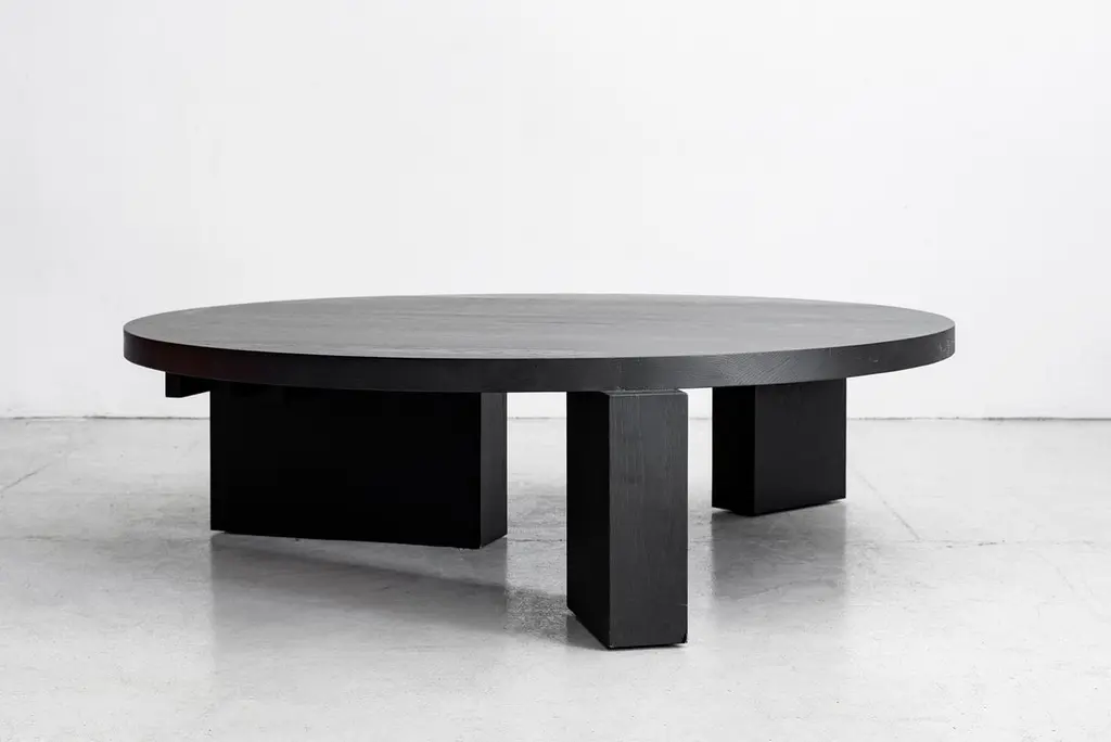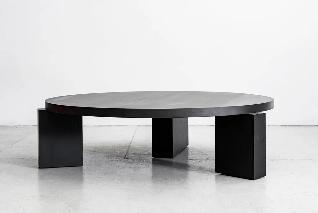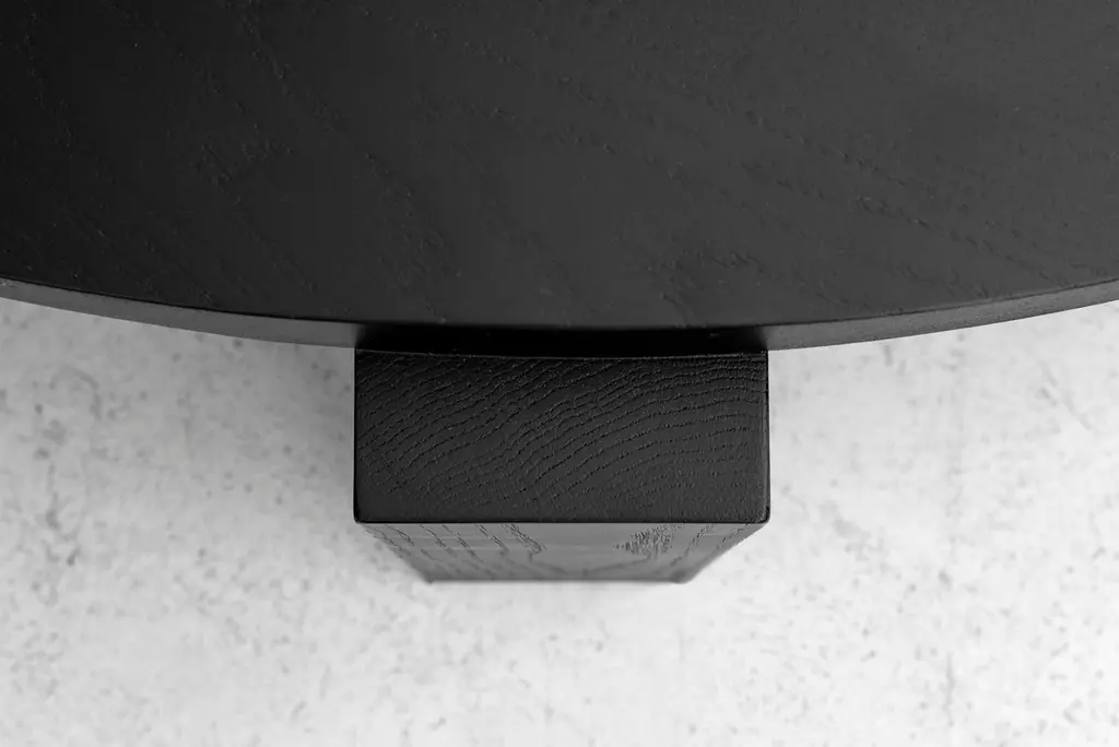 Geometric "Cubist" coffee table designed by Orange with large solid 48" diameter oak top with ebony finish. Three thick rectangular shaped legs contrast the oversized circular cantilevered top.Custom stain available.