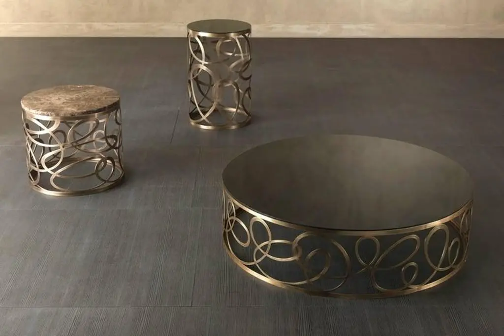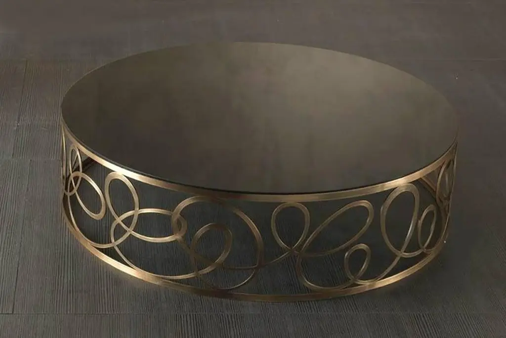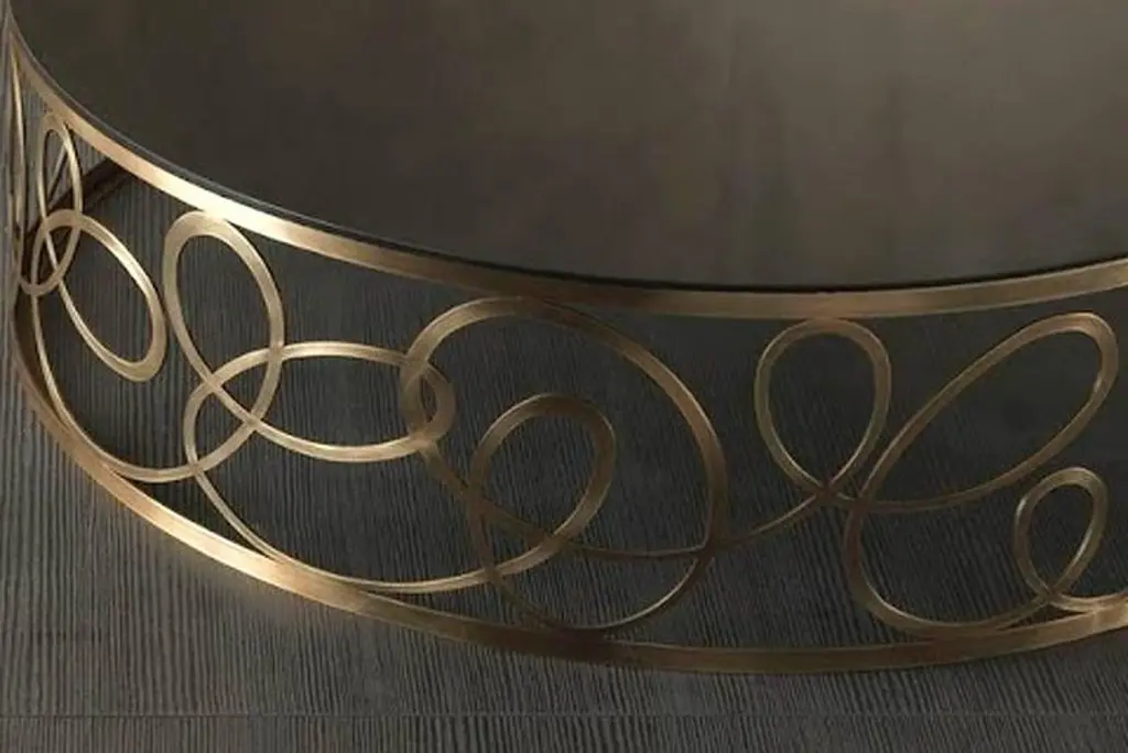 Coffee Table Curving Round with solid carved brass structure in bronzed finish. With round smocked glass top.Also available on request with marble top.Also available on request in Ø110cmxH32cm or in Ø50cmxH4,6cm or in Ø40cmxH65cm.