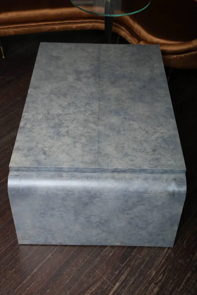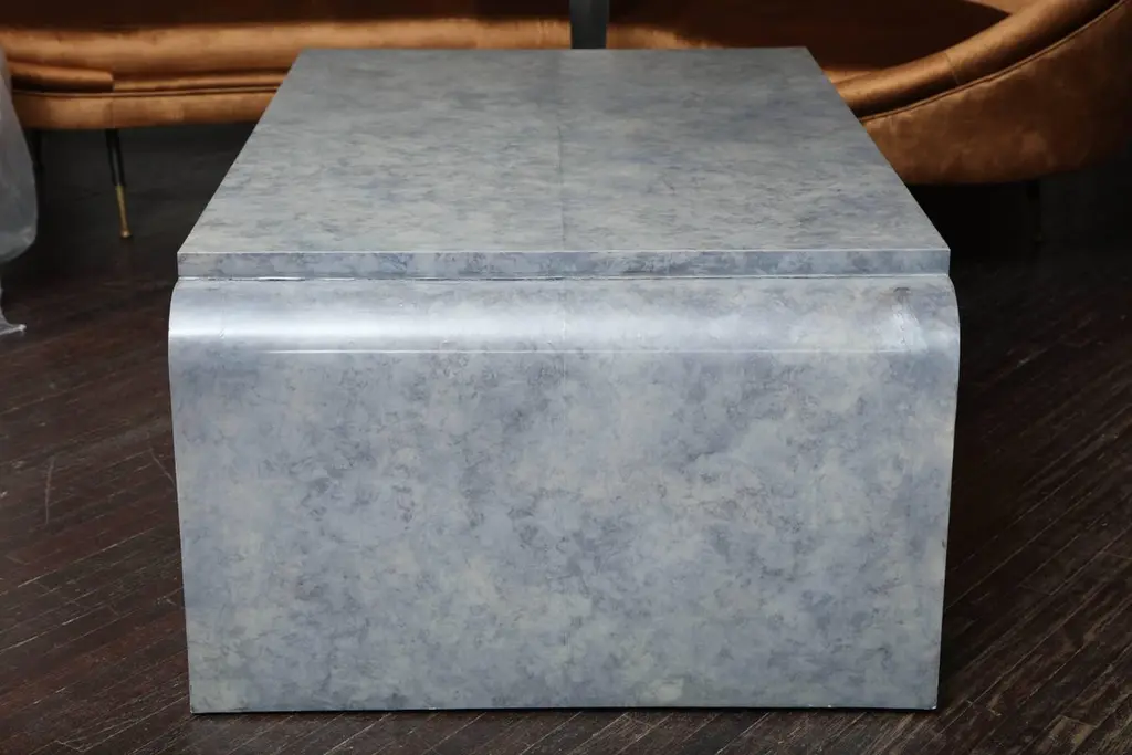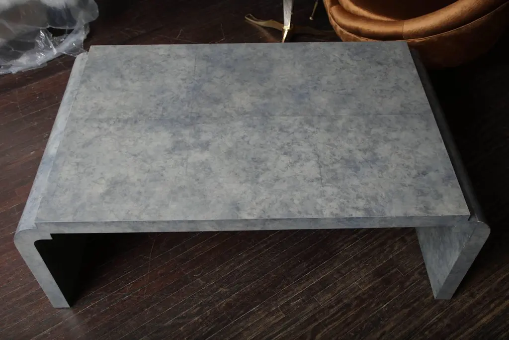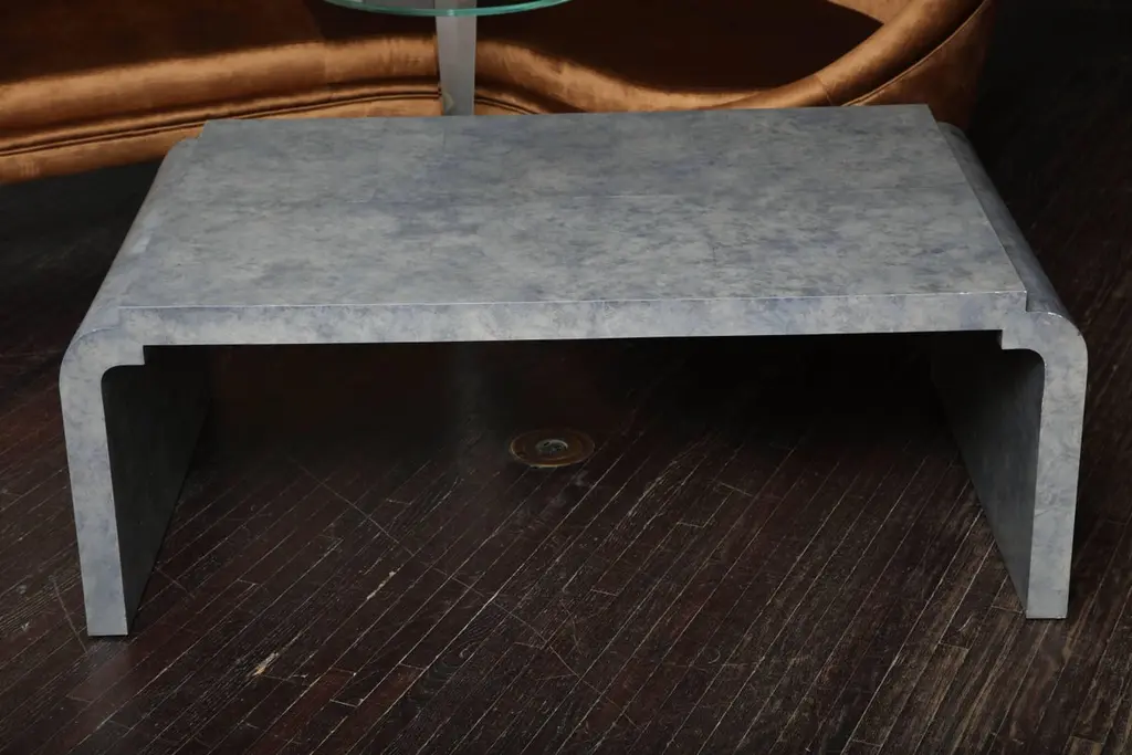 Amethyst-tinted goatskin cocktail table. Available for custom order in different sizes and colors.PRODUCTION TYPE: New & Custom(Current Production)PRODUCTION TIME: It will take 14-15 weeks to make this pieceIN THE STYLE OF: Mid-Century ModernPLACE OF ORIGIN: PhilippinesDATE OF MANUFACTURE: 2016PERIOD: 21st CenturyMATERIALS AND TECHNIQUES: Goatskin, WoodCONDITION: NewDIMENSIONS: H 18.25 in. x W 49.5 in. x D 29.5 in.(H 46.36 cm x W 125.73 cm x D 74.93 cm)