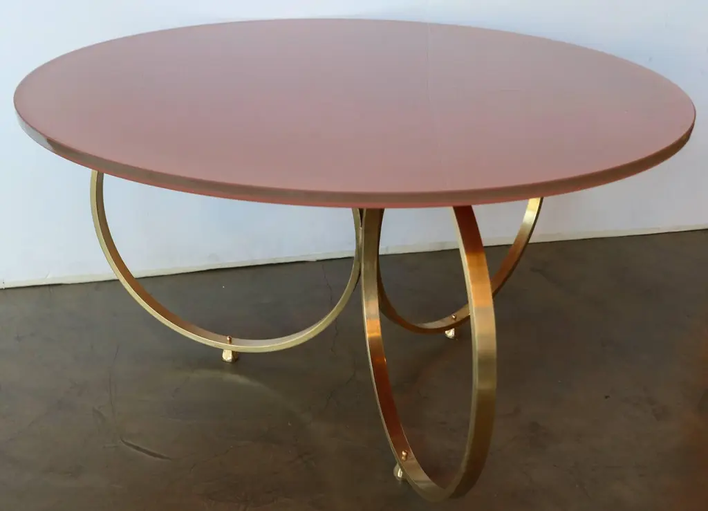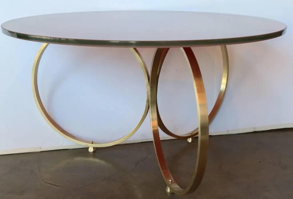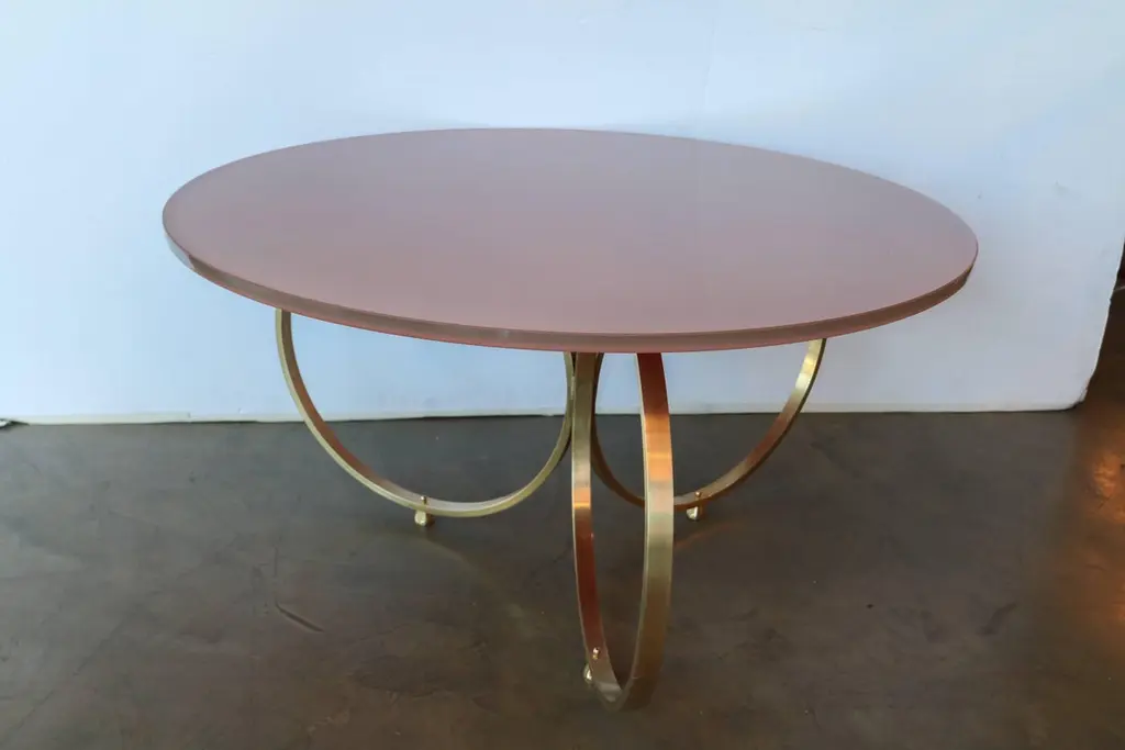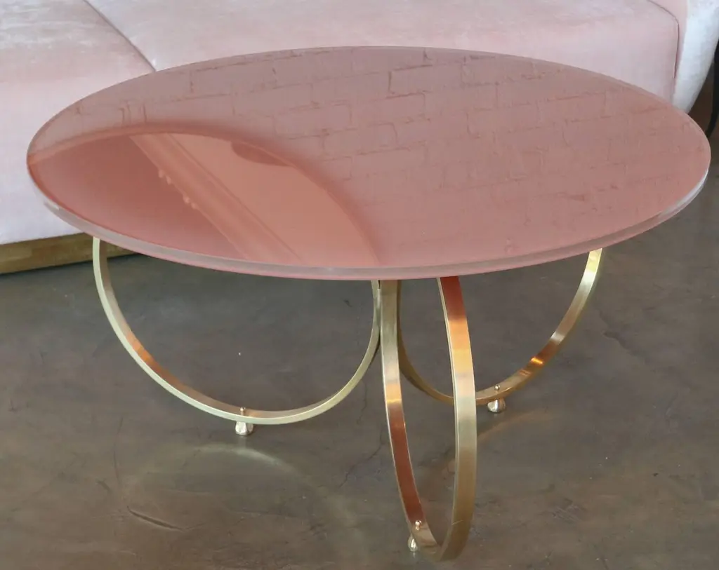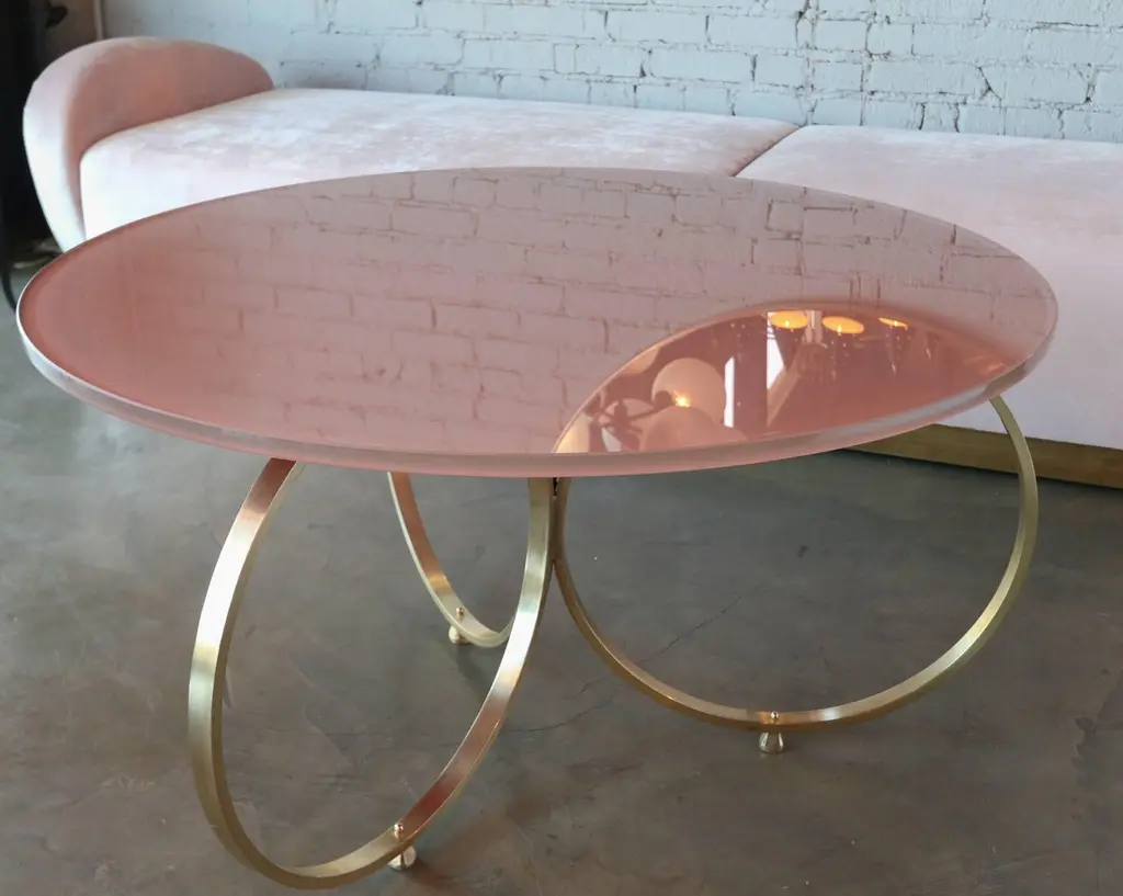 Custom brass coffee table with reverse painted apricot pink glass top and a base of three brass rings. Handmade in Los Angeles by Adesso Imports. Can be done in other colors and finishes.
