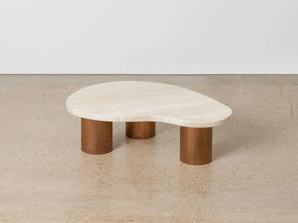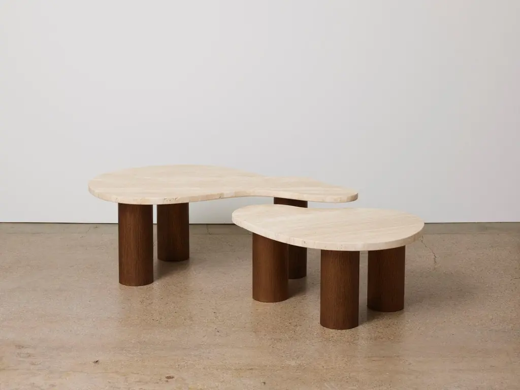 Set of 2 Andrea and Luca coffee table by Umberto Bellardi RicciDimensions: Andrea: D 94 x W 71 x H 28 cm.Luca: D 140 x W 86.5 x H 32 cm.Materials: Travertine, bronze legs.Umberto Bellardi Ricci is an Italian sculptor and architect based in New York City, practicing across London, Mexico, and New York. His work revolves around the interplay of art and design while exploring the spatial aspects of sculpture and social sciences through the medium of architecture. Umberto initially started with geometric abstraction largely interpreted in cast concrete, influenced by his Japanese mentor and Mexican modernism, as he founded an acclaimed sculptural project in Las Pozas, the surrealist garden in central Mexico. Since he relocated to New York, he has been focusing on a series of folded steel and brass sculptures, that often incorporate reflective light sources. While he still works with abstract compositions, pairing ready-made materials with crafted wood and rubber details, his latest furniture pieces explore the dialogue between contrasting raw construction elements, such as I-beams or concrete blocks, and refined textures like marble and glass. Having taught architecture for many years at the Architectural Association in London and at the Cornell University in New York, he designed the home for Turner Price laureate Laure Prouvost in Hackney, and has recently been commissioned to make objects and furniture for Jenna Lyons’ studio in Soho.