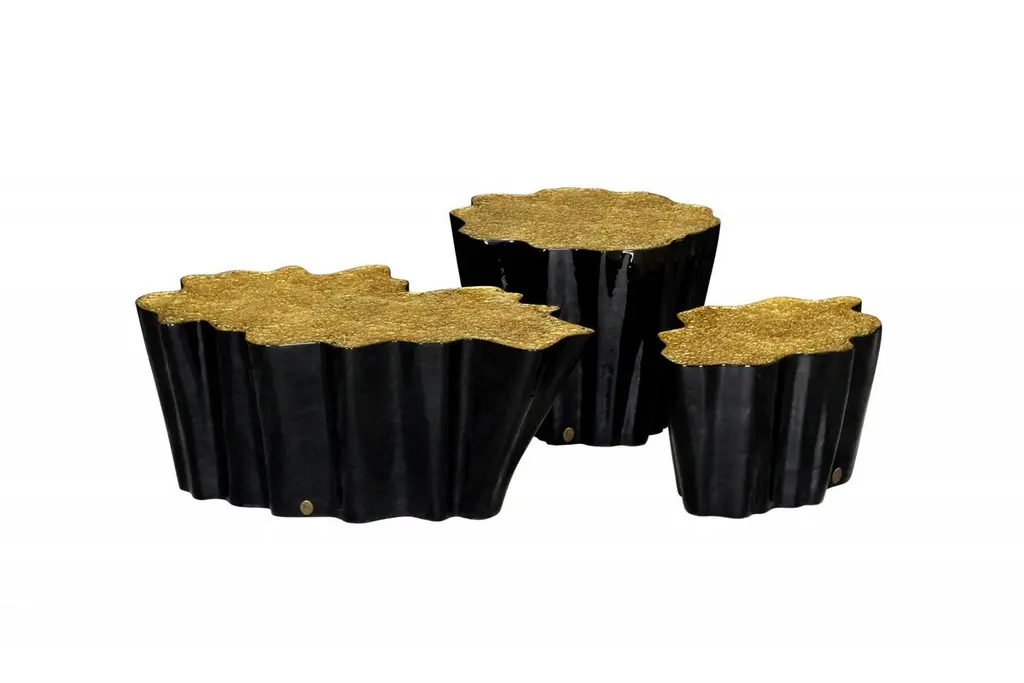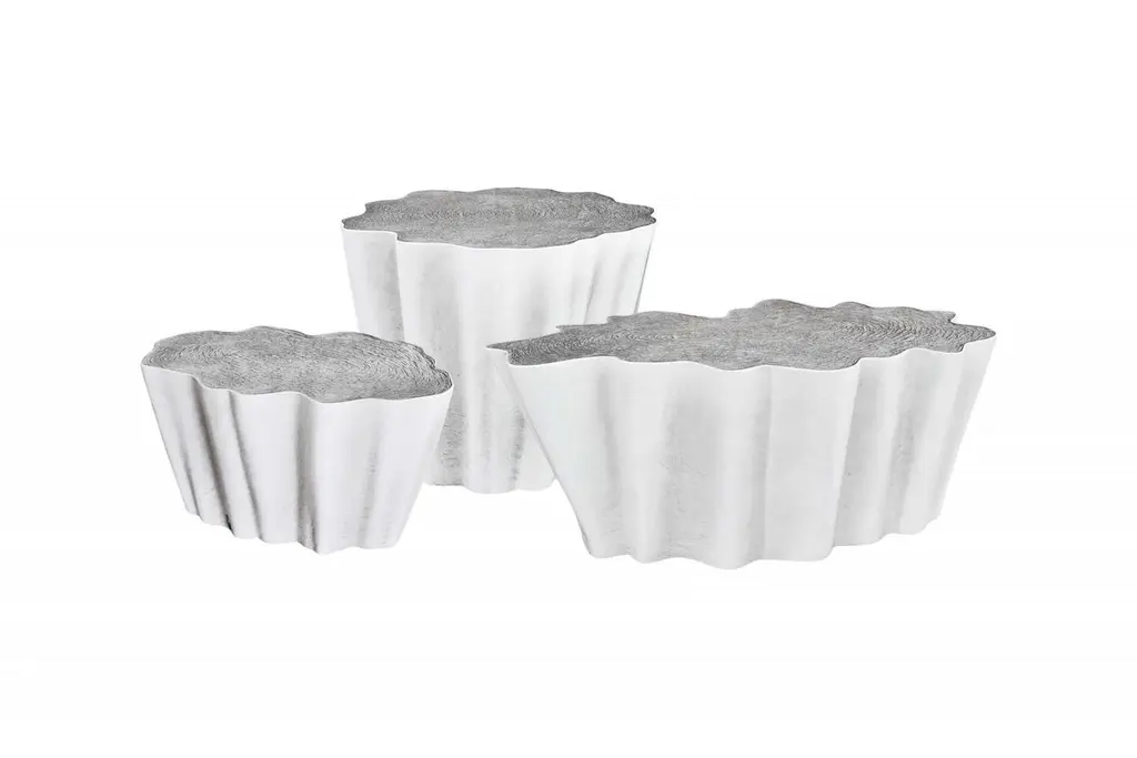 This set of three contemporary low tables draws inspiration from the natural beauty of tree trunk cross-sections. Each table is uniquely crafted from resin, reinforced with fiberglass, and meticulously finished with a handmade silver leaf technique. The combination of these materials ensures exceptional durability and scratch resistance.Designed with modern living in mind, these tables are perfect for homes with pets or busy households, as they resist scratching and staining while requiring no maintenance. The freeform design adds an organic, sculptural element to any space, making this set both a functional and artistic addition to your home.Table A (Taller)Dimensions (cm): 55 x 52 x 40Dimensions (in): 21.7 x 20.5 x 15.7Weight: 10 kg 22 lbB (Larger)Dimensions (cm): 82 x 54 x 35Dimensions (in): 32.3 x 21.3 x 13.8Weight: 12 kg 26.5 lbsC(Smaller)Dimensions (cm): 55 x 35 x 31Dimensions (in): 21.7 x 13.8 x 12.2Weight: 7 kg 15.4 lbs. We do our best to expedite production and to ship and deliver product within the listed lead time, however current lead times might be longer due to global shipping backlog and delays. These delays are out of our control and cannot be a reason to cancel an order.