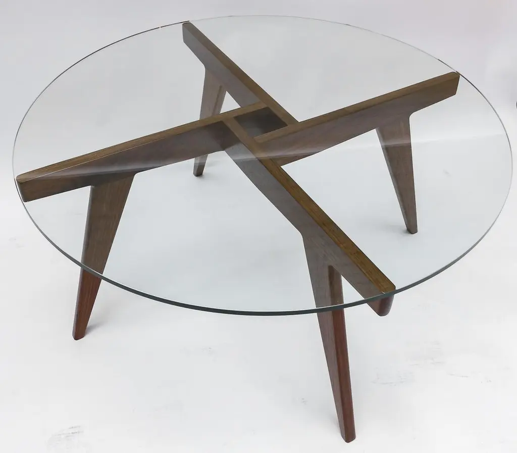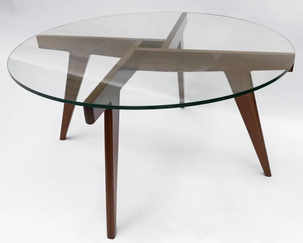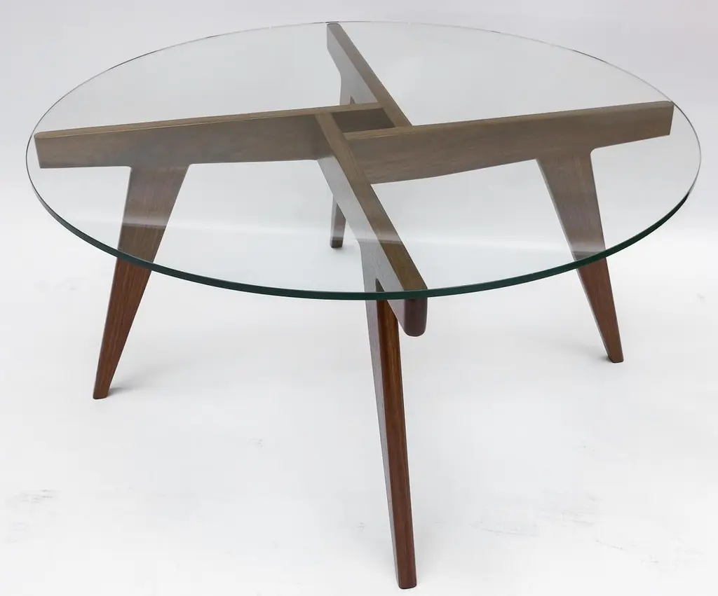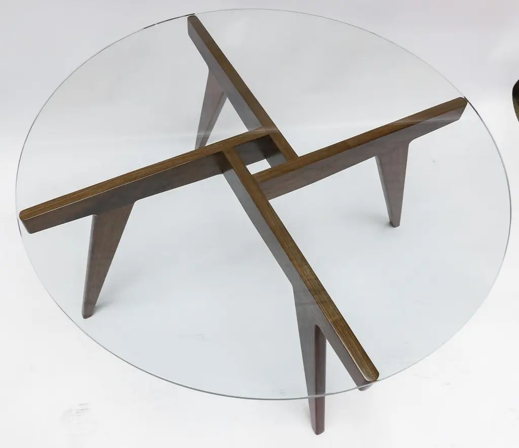 Custom midcentury style coffee table with American walnut geometric base and round glass top. Made in Los Angeles by Adesso Imports. Can be done in different sizes, woods and finishes.