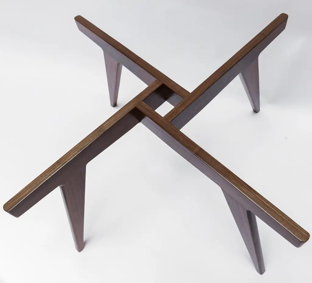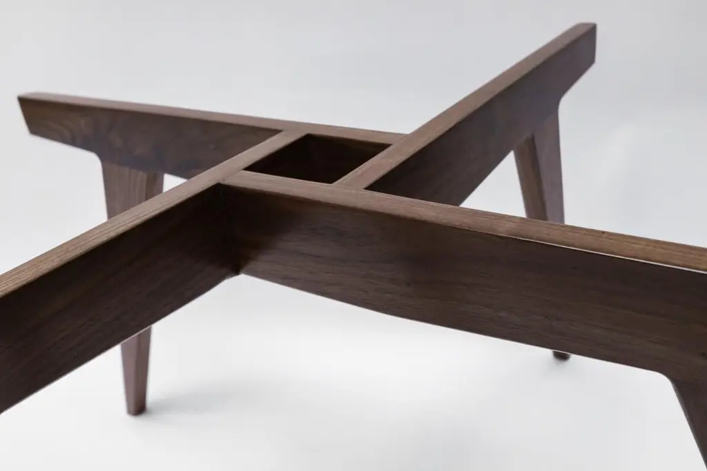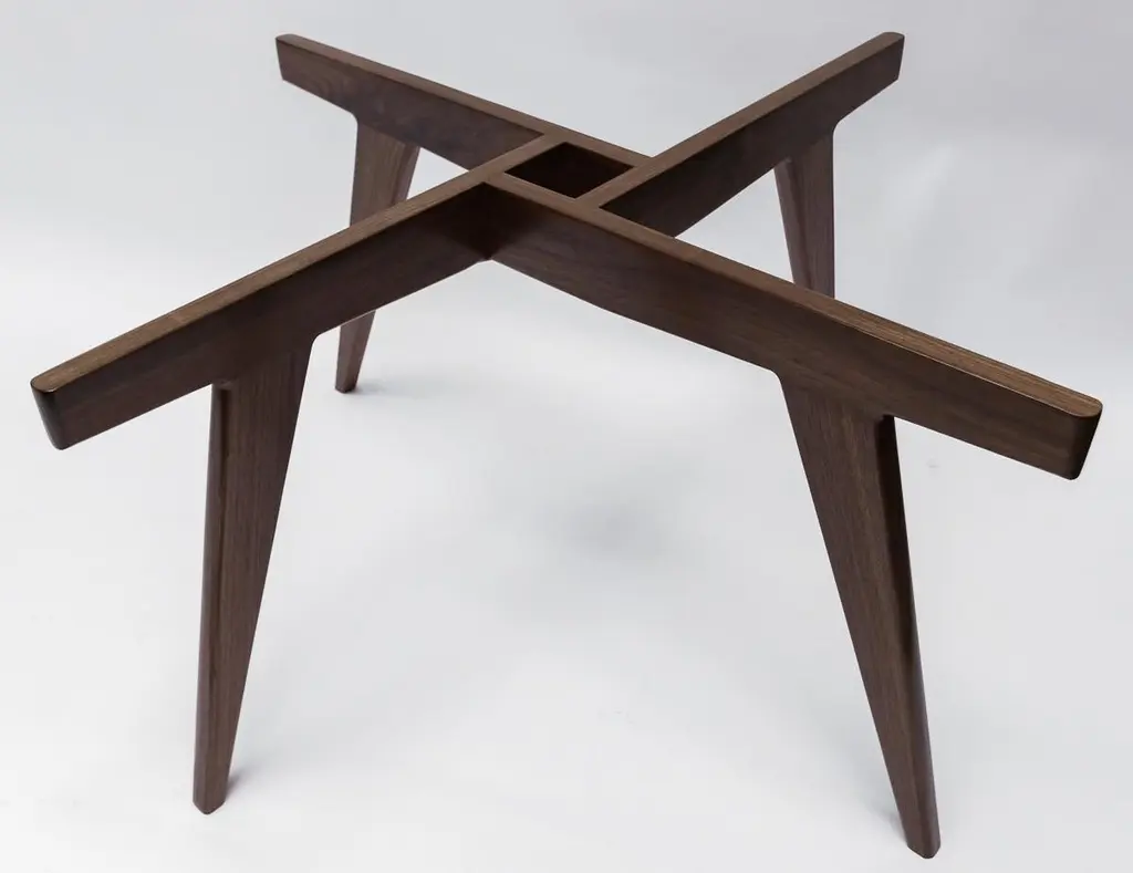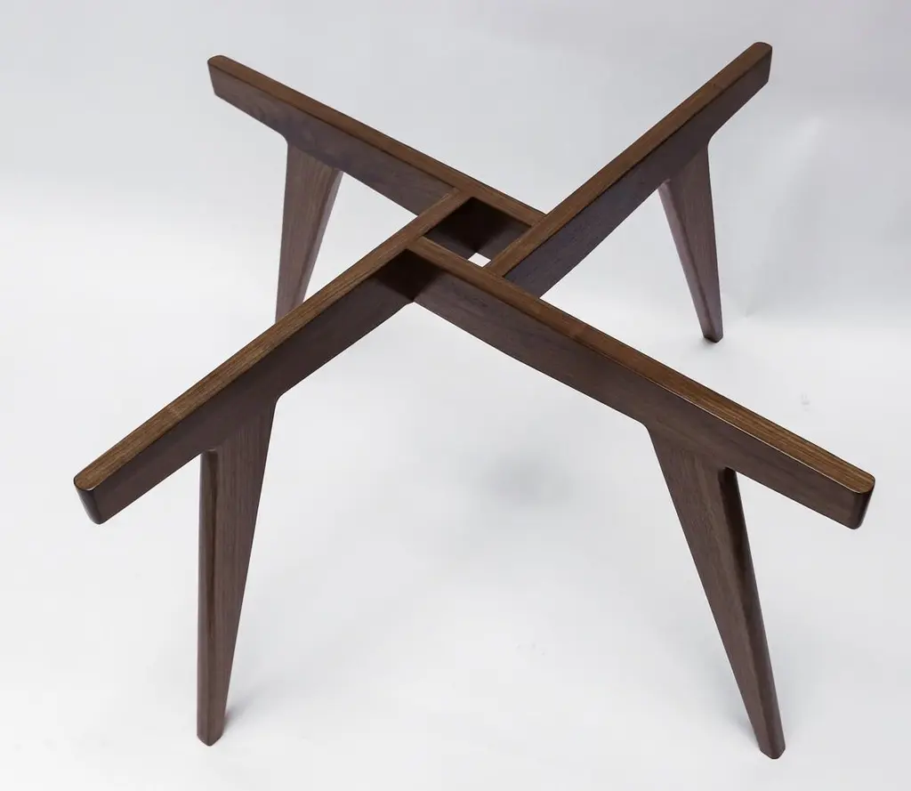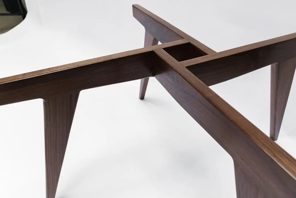 Custom midcentury style coffee table with American walnut geometric base and round glass top. Made in Los Angeles by Adesso Imports. Can be done in different sizes, woods and finishes.