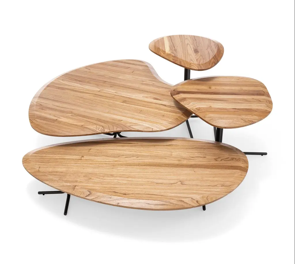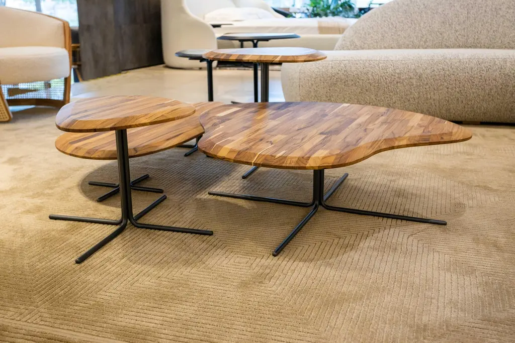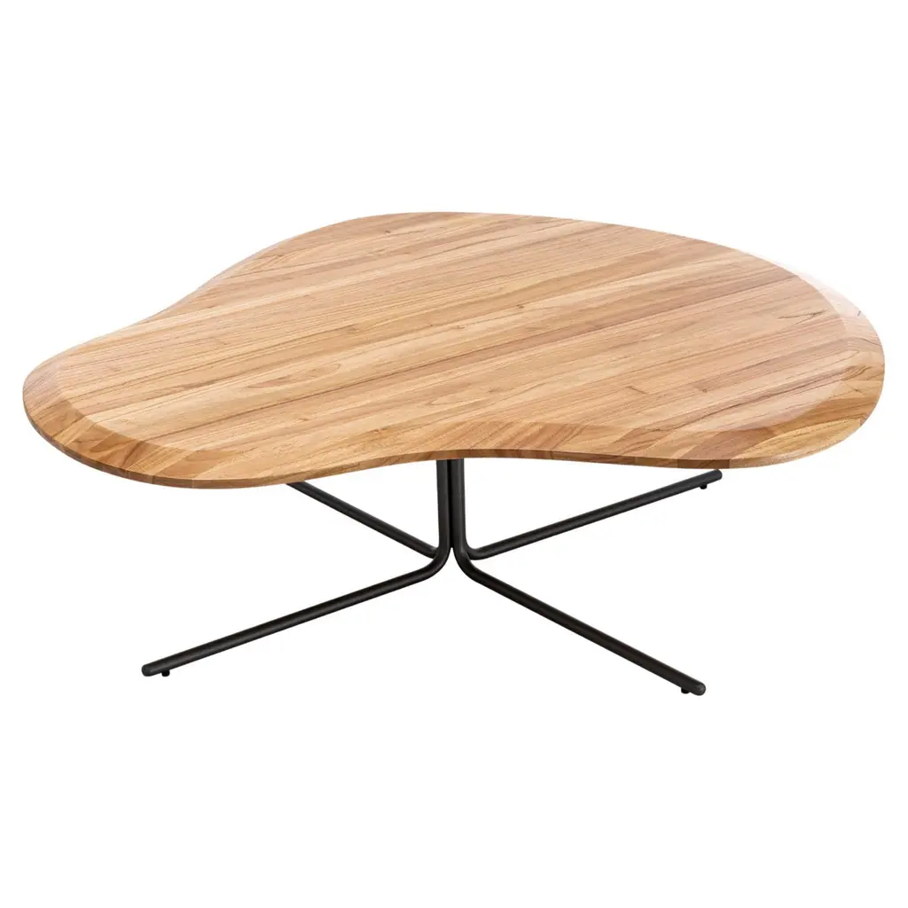 A Pantê coffee table designed by Uultis Studio with 20-Inch teak top and black metallic base. The Pantê coffee table, with its sleek 20-inch teak wood top and durable black metallic lacquer base, is a statement of contemporary design inspired by nature. Part of the Pantê series by Uultis, this coffee table is characterized by its organic shape, reminiscent of the jaguar’s distinctive coat pattern. The natural variations in teak wood ensure each table is entirely unique, with a matte, velvety teak touch finish that highlights the wood’s natural beauty and texture.Perfect for modern living rooms, lounge areas, or commercial spaces, the Pantê coffee table combines functionality with striking design. Its compact size makes it ideal for serving as a centerpiece or accent table, offering a convenient surface for beverages, books, or decor. Pair it with other Pantê series tables for a cohesive, layered look that enhances the versatility and aesthetic of your space.Designed for both residential and commercial use, this table embodies Uultis’ commitment to sustainability and craftsmanship. The black metallic lacquered base adds stability and a contemporary edge, complementing the teak top’s organic warmth. Basic assembly is required, ensuring it is quickly and easily ready for use.The Pantê coffee table is more than furniture; it’s a fusion of style, nature, and sustainability, perfect for enhancing any modern interior. Its harmonious balance of materials and form ensures it remains a timeless and practical addition to your home or workspace.
