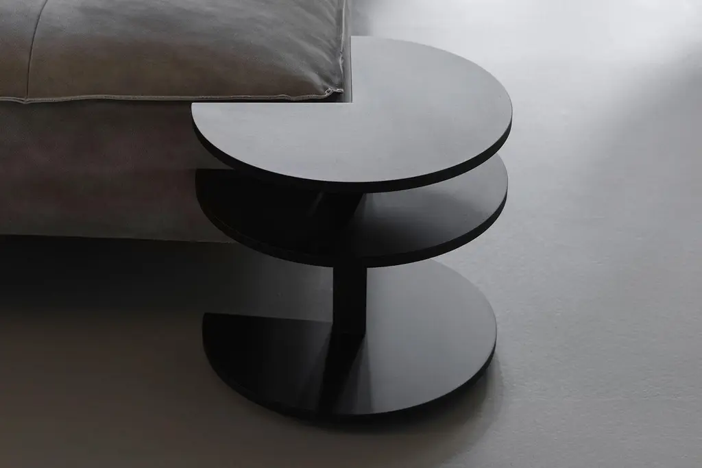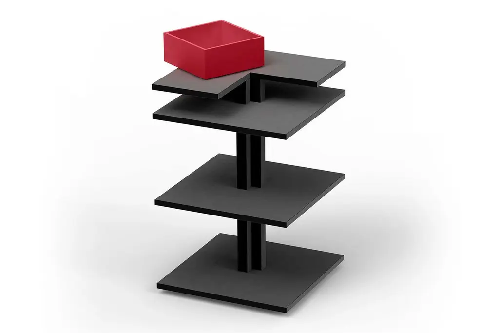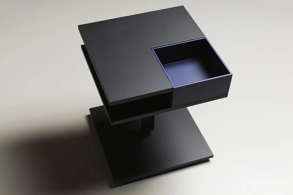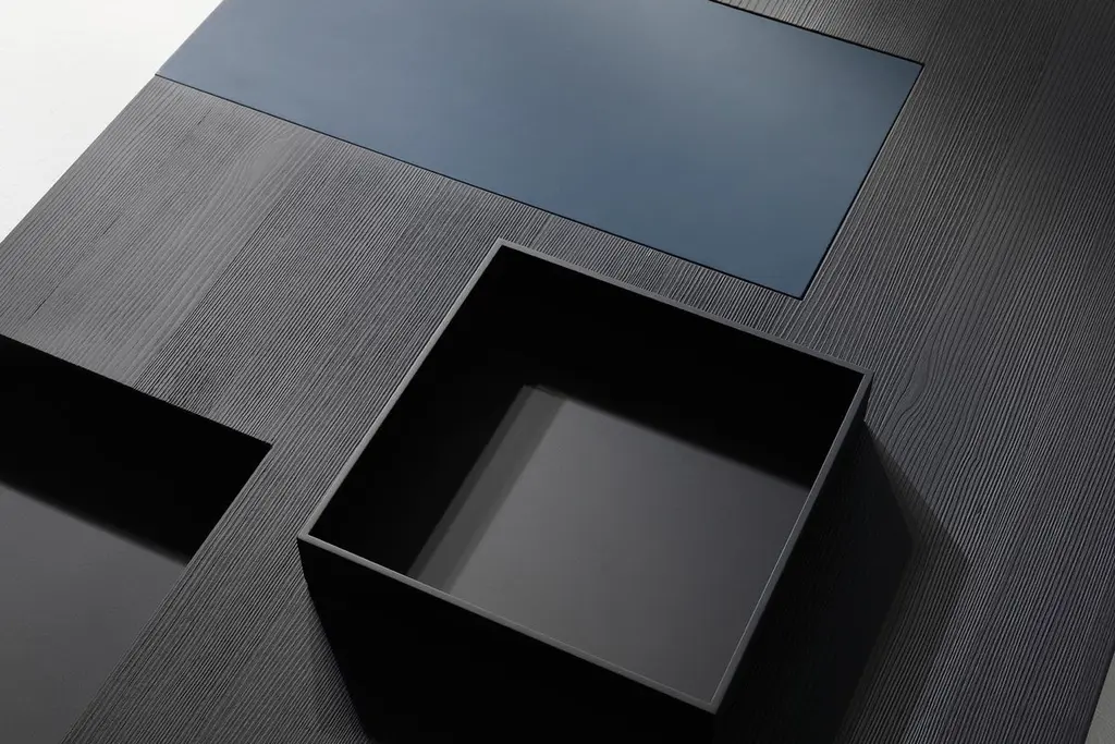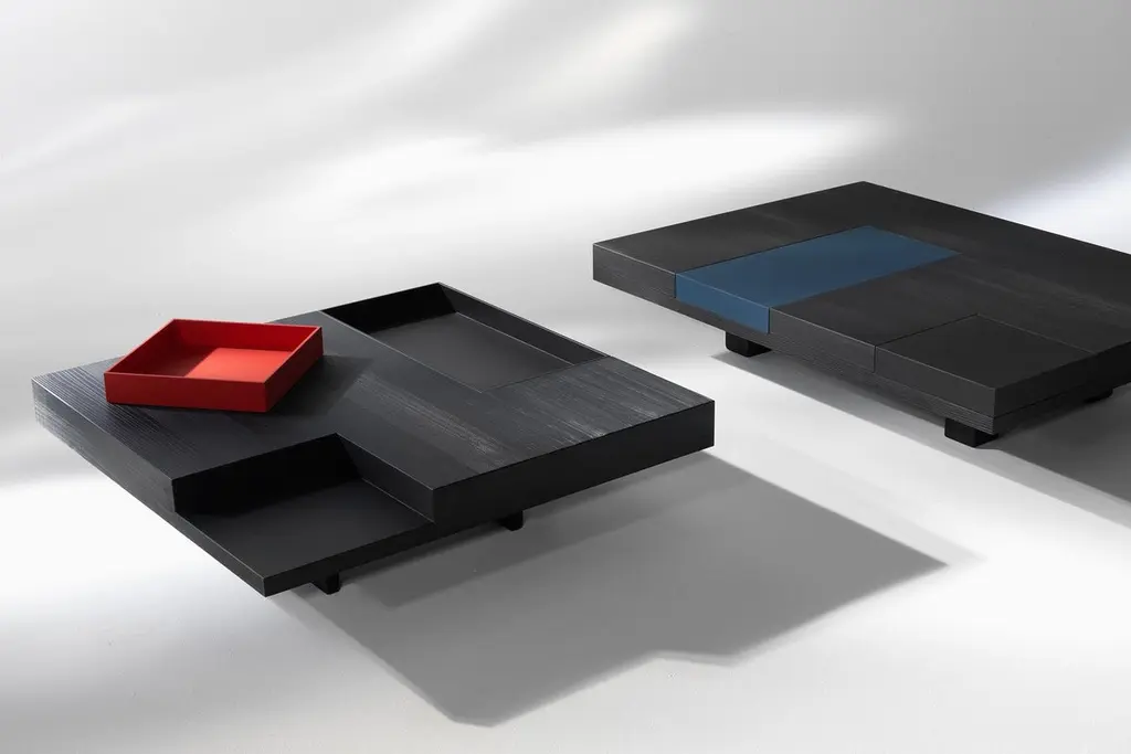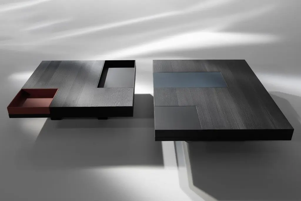 Coffee table 90×90 x H 25 and L 120 x P 90 x H 25 cmTop with housing for 2 removable lacquered trays 30×30 and 30×60.Finishes black brushed larch, black, red and blue lacquered tray.