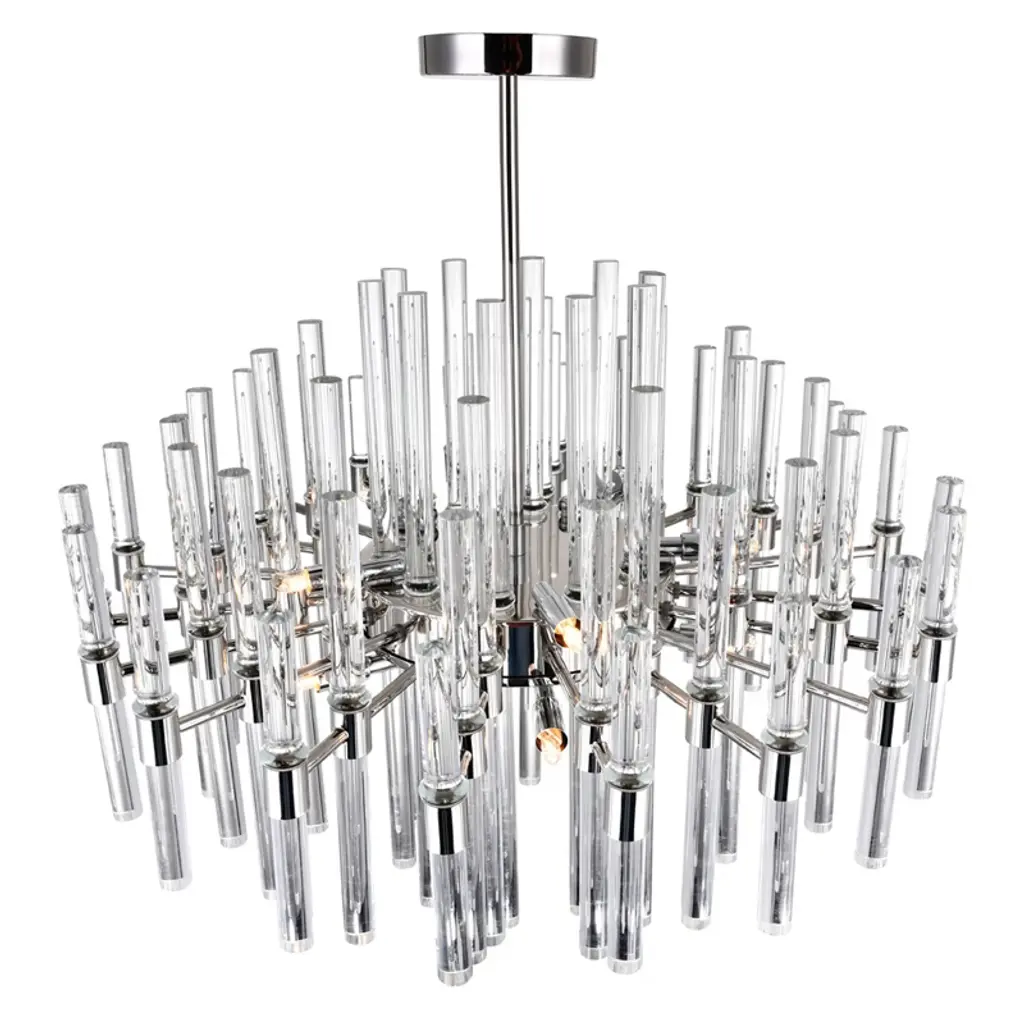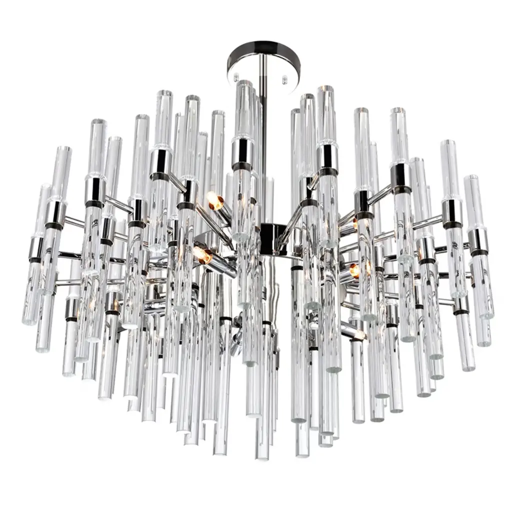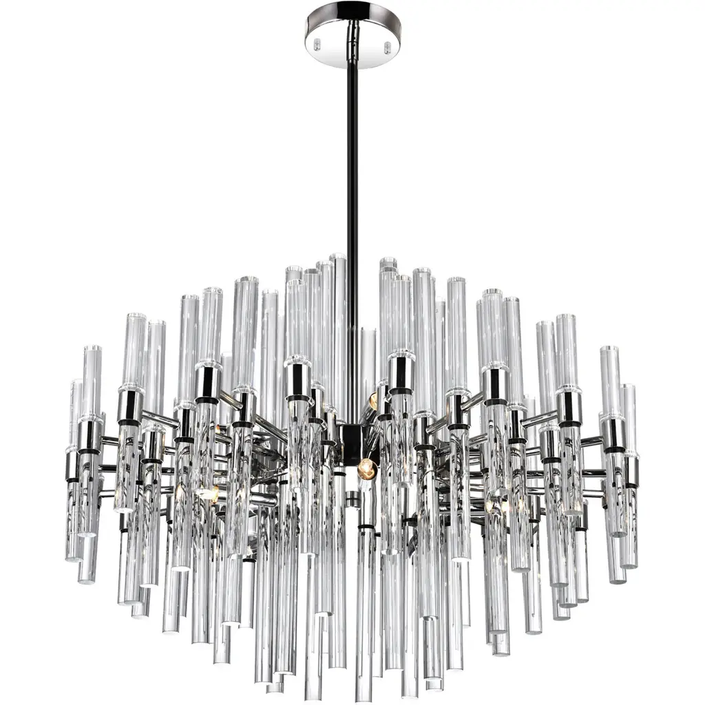 Industrial glam, rustic chic, masculine and feminine - these words accurately describe the Miroir 10 Light Chandelier. This light fixture measures 26 inches long and features clear glass tubes extending above and below a branching polished nickel central base. This genre-defying chandelier has enough depth to fill the lifeless airspace above a coffee table, a kitchen island, or a dining table