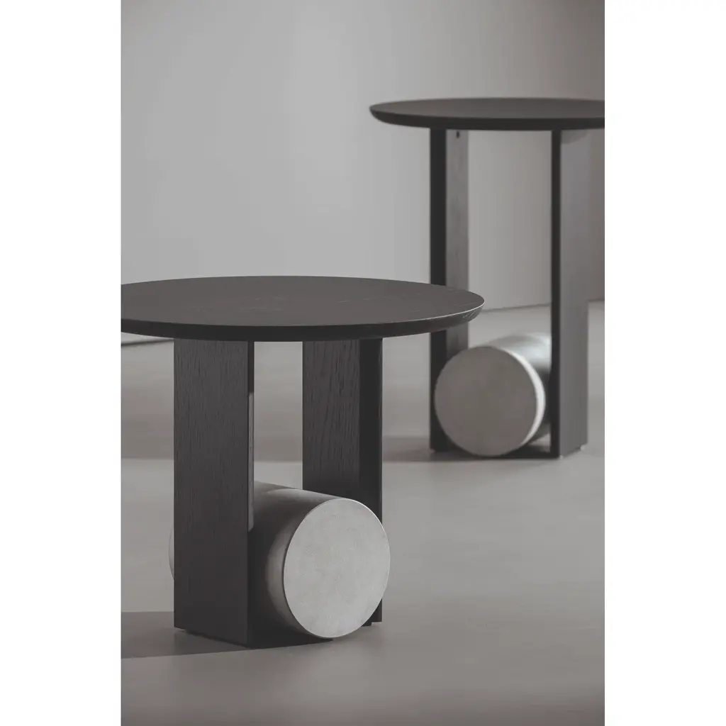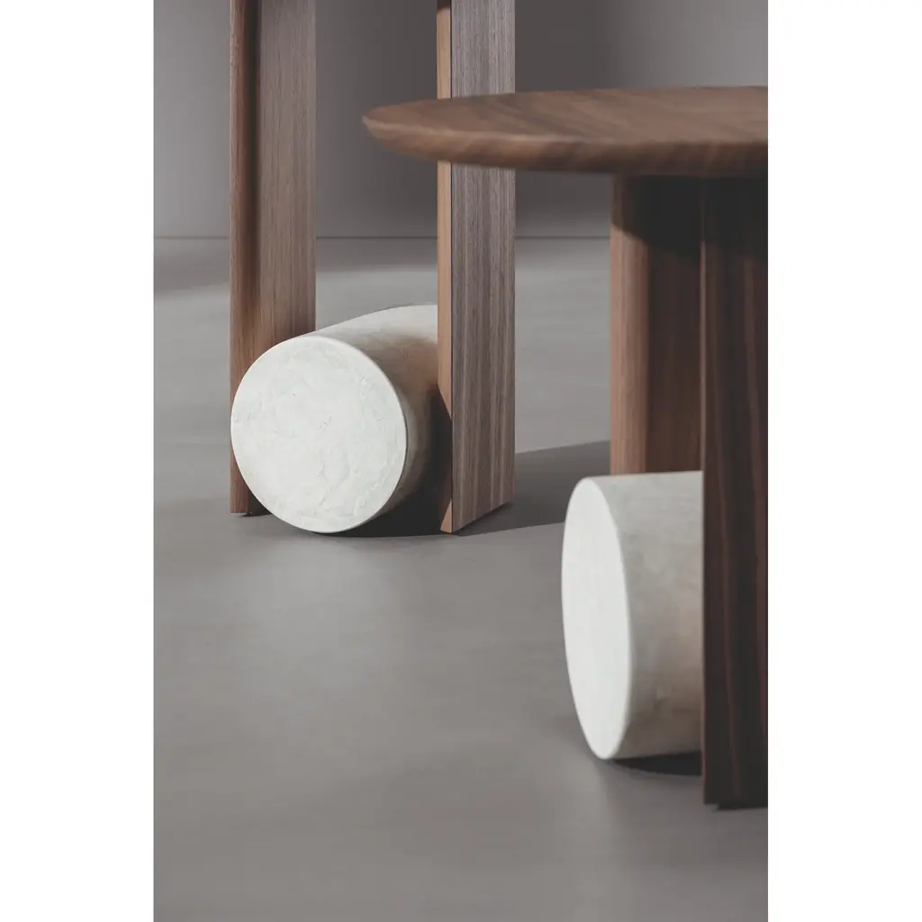 Within Element, designer Alain Gilles transforms the classic coffee table base into a characteristic element: a cylinder in concrete or travertine finish becomes the focal point of the accessory, on which the wooden structure rests. A game of perspectives gives Element the ability to change shape depending on the point of view, a characteristic shared by many products created by the Belgian designer. The coffee table is available in two different heights and in combinations of Canaletto walnut and carbon oak, which can be freely combined with concrete or marble to adapt to any context.