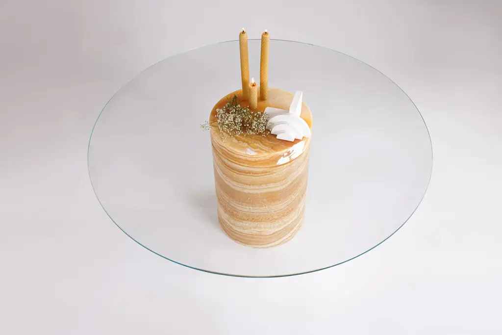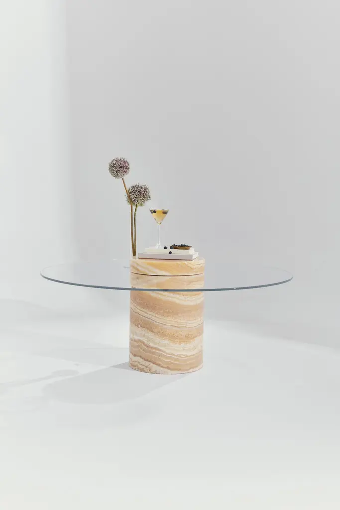 Cylindrical Honey Onyx Coffee Table With Round Clear Glass Top By Raffinato