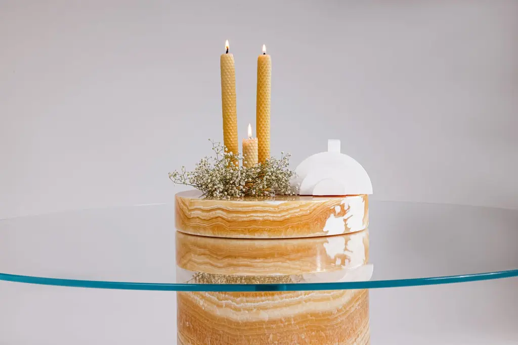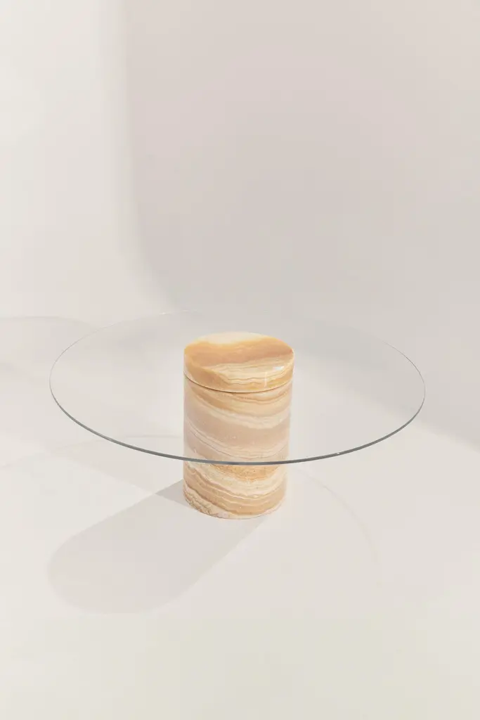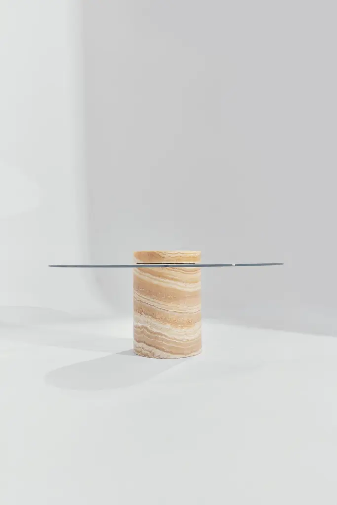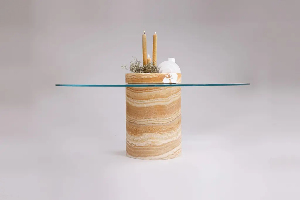 Apollo Honey Onyx Coffee Table by RAFFINATODimensions: D 100 x 100 x H 43 cm.Materials: Honey onyx and glass.This table is available in different stone options: Red Travertine, Light Travertine, Silver Travertine, Calacatta Viola, Honey Onyx, Rosso Levanto, and Brown Onyx. Please contact us.Ekho is a minimalist coffee table. The glass is surrounded by echoed rectangular volumes that rise out of four different points. Each rectangular volume is segmented into pieces that interlock like a puzzle. The Ekho coffee table showcases a well-balanced geometric form and impeccable material harmony, enriching your living area with its presence.RAFFINATO is a design brand specializing in natural stone. Inspired by the mystic nature of marbling art and the intercontinental spirit of Istanbul, designer Dicle Varsak transforms precious natural stones into outstanding design objects.RAFFINATO was created as an appreciation of the hidden gems of nature, such as marble, onyx, and travertine. The trace of time, infinite color and texture combinations, and fluid, dynamic creation are characteristic features of natural stone that ensure each design piece is unique and personalized.Our mission is to create functional and sculptural designs that enable users to establish a strong connection with the concept of beauty. Each design is the result of a refined combination of geometry, color, and texture.At the center of our work is a deep passion for design, producing high-end furniture, respecting natural stone, and revealing the unique pieces hidden within the stone.