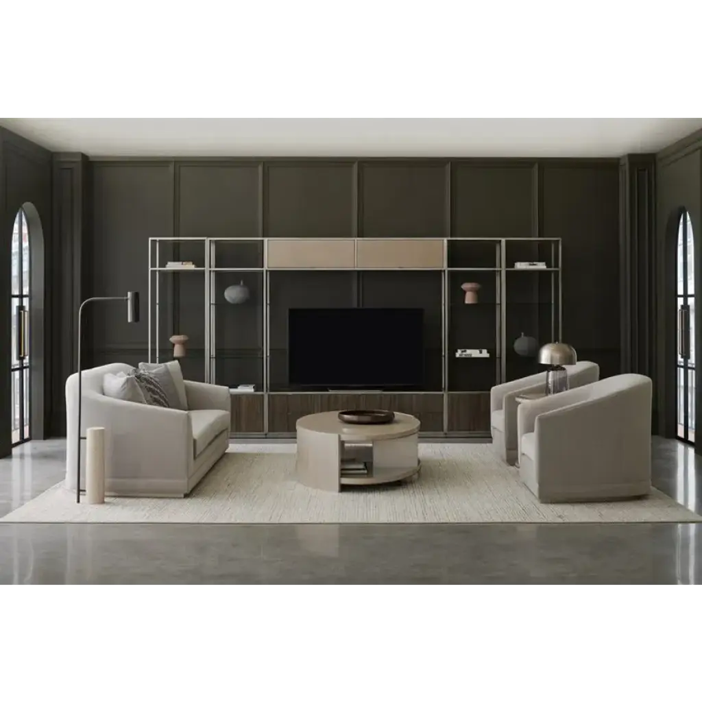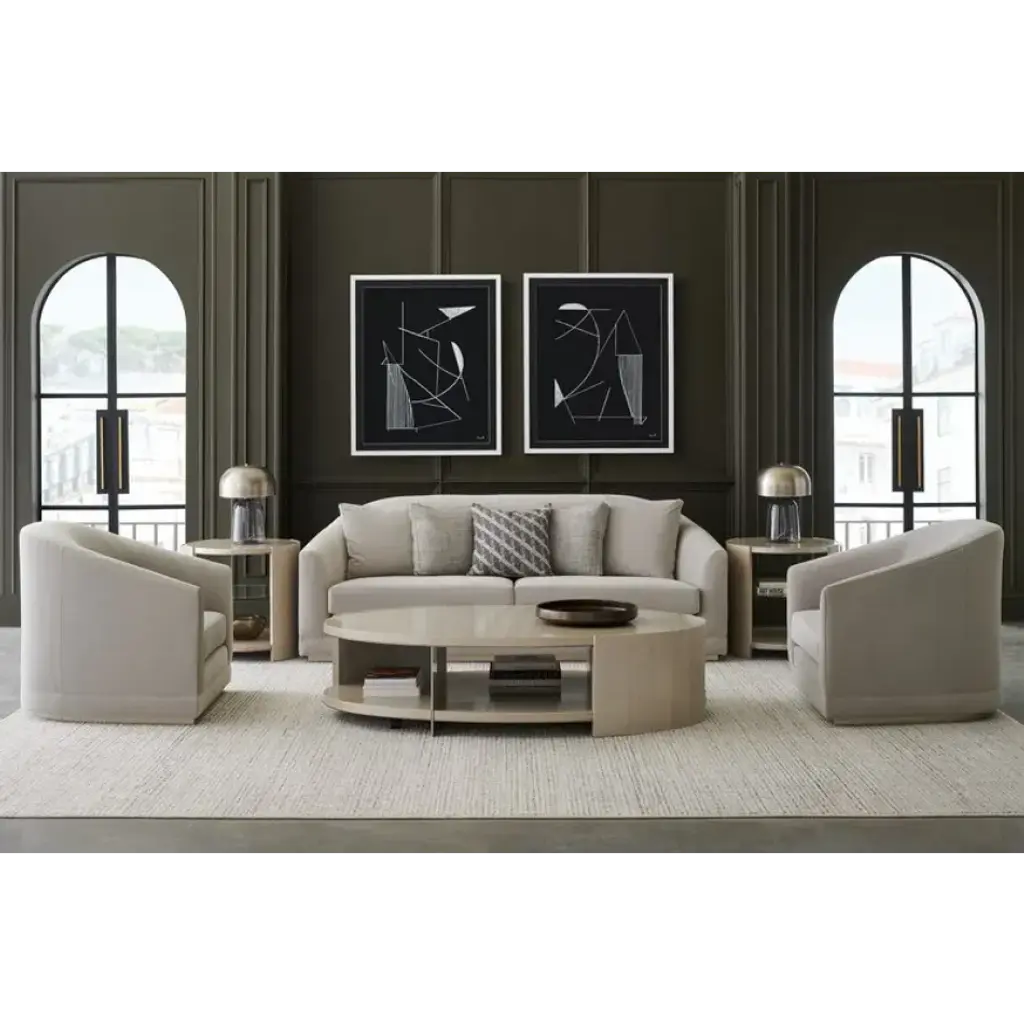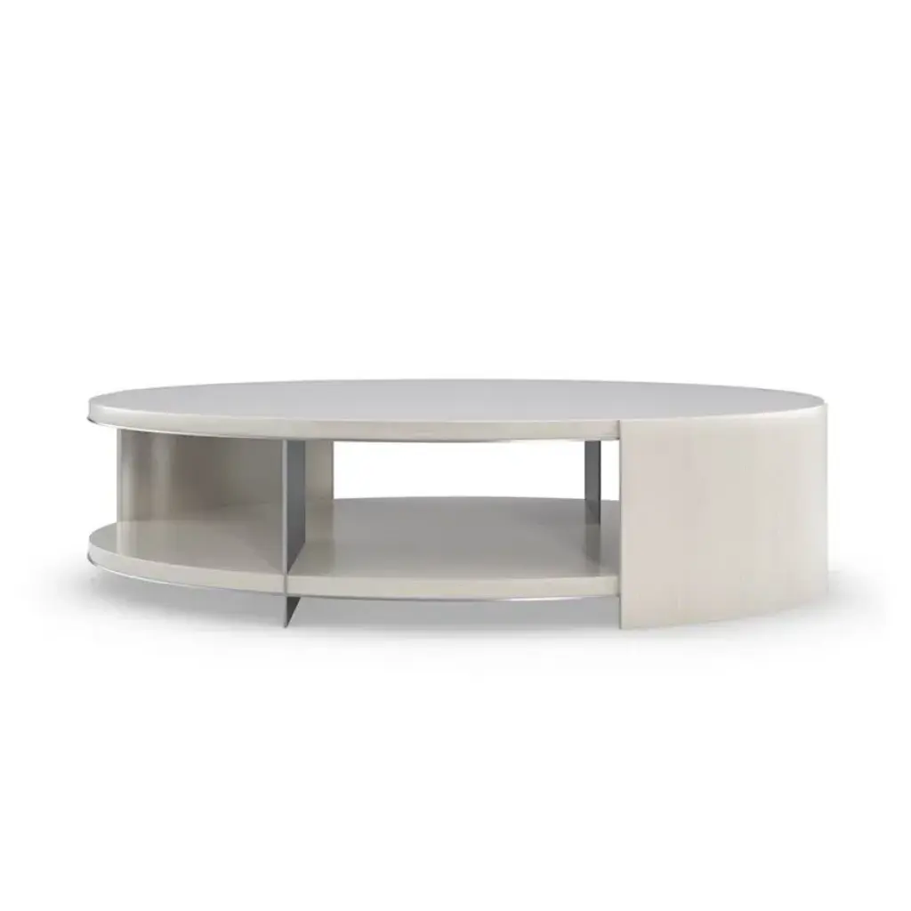 With a refined oval shape and subtle radiance, this cocktail table is a captivating addition to living interiors. Elevating its simple form, a Thunder finish gives light to the linear wood grain, accentuated by metal trim in Soft Silver paint. Like a work of art, every view brings a different perspective, with meticulously designed space for displaying books and collectibles. Hidden casters allow for ease of mobility.