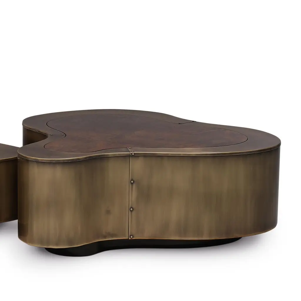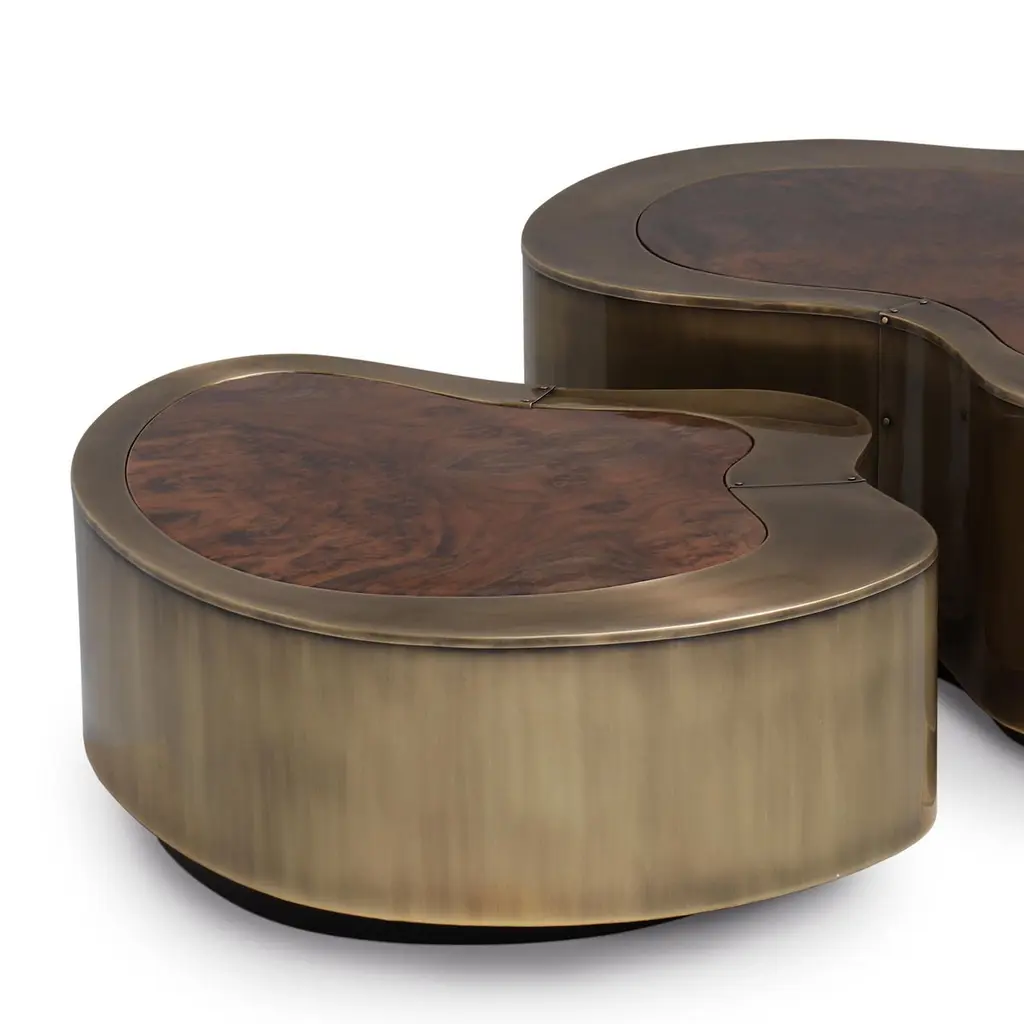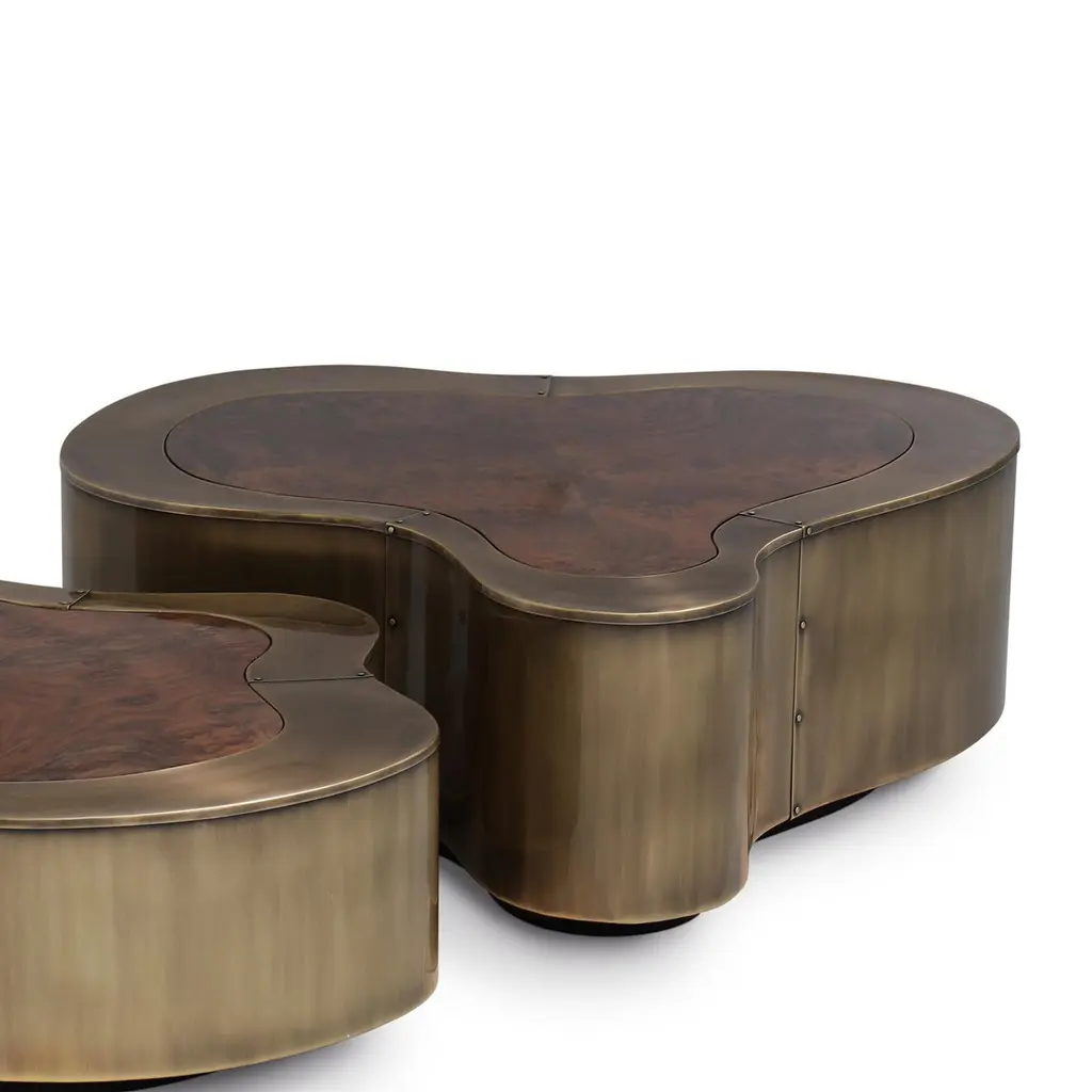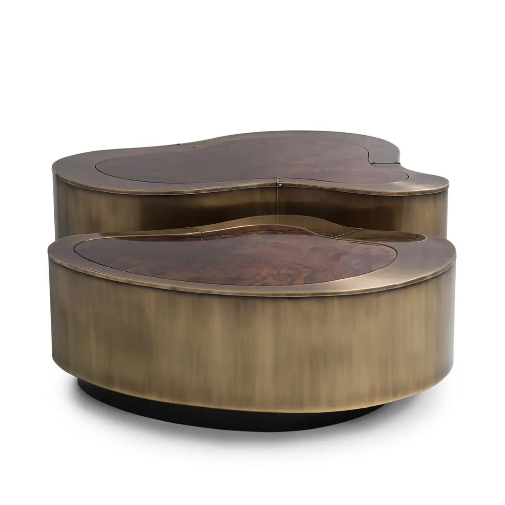 Coffee Table Dalia Antique Brass Walnut Set of 2 with wooden structure covered with handcrafted solid brass in antique finish. With curved walnut tops. With black lacquered base varnished finish.Also available in other finishes on request.Set of 2 composed with 2 coffee tables in:A/ large: L 99 x D 96 x H 37cm.B/ medium: L 88 x D 73 x H 31cm.
