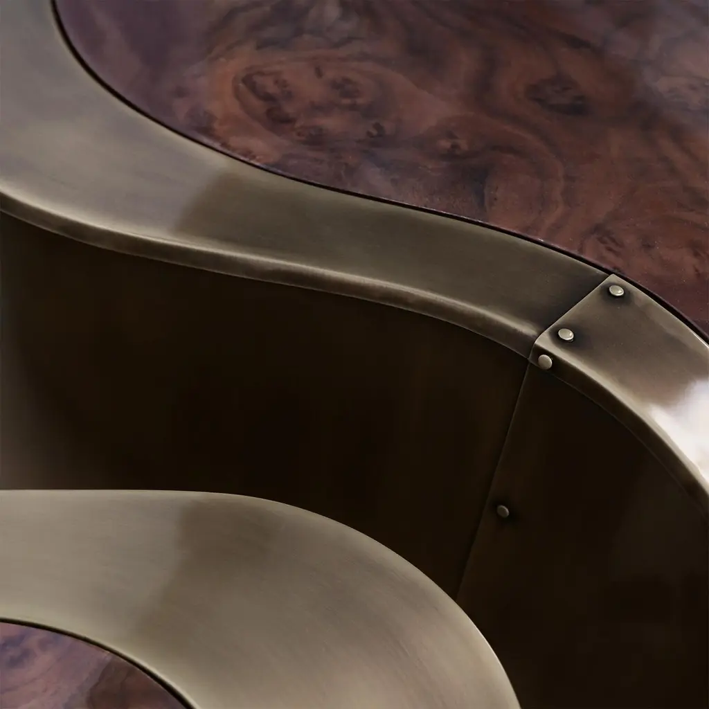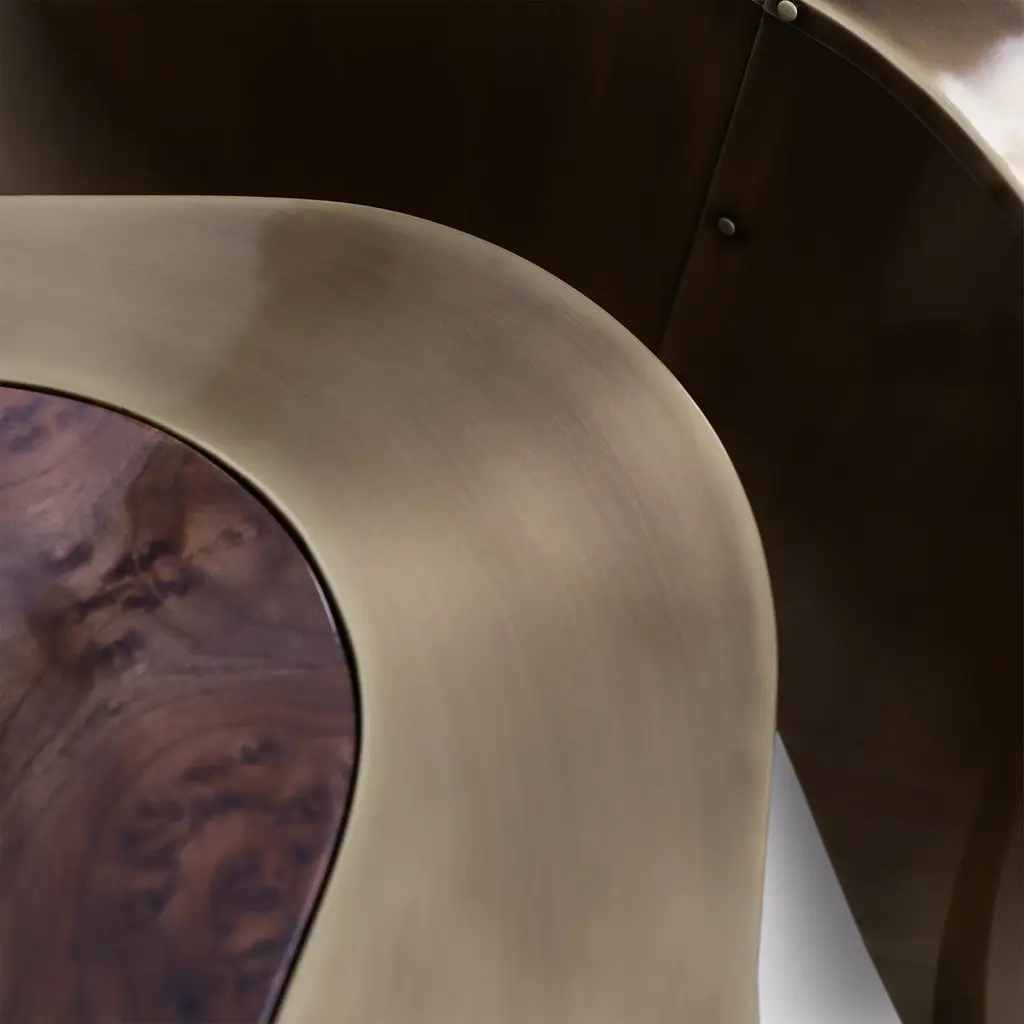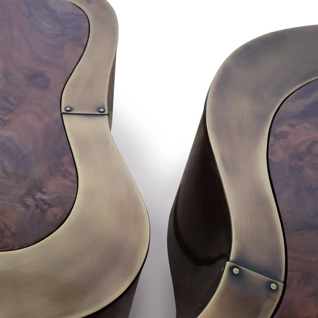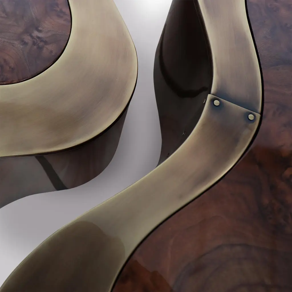 Coffee Table Dalia Antique Brass Walnut Set of 2 with wooden structure covered with handcrafted solid brass in antique finish. With curved walnut tops. With black lacquered base varnished finish.Also available in other finishes on request.Set of 2 composed with 2 coffee tables in:A/ large: L 99 x D 96 x H 37cm.B/ medium: L 88 x D 73 x H 31cm.