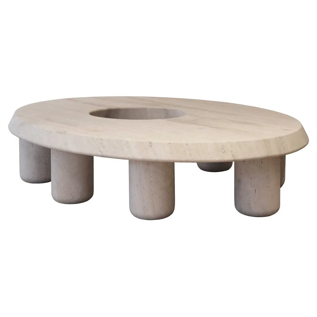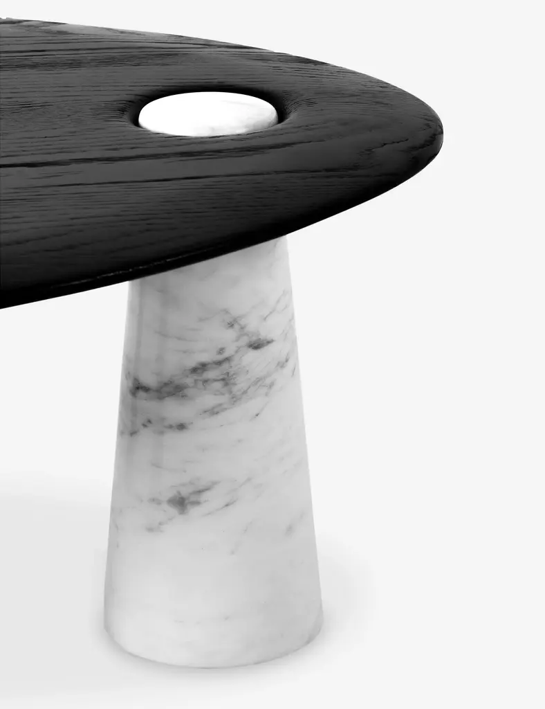 Modern edits call for a statement anchor. The Damona coffee table cuts a soft, sculptural silhouette with a solid oak top set on three marble pedestal legs with the tops exposed. The luxe materials and artful shape make this a chic living room table to center your design around.