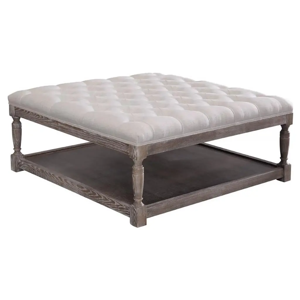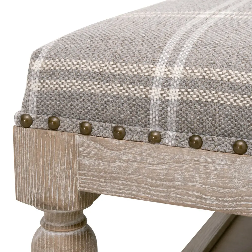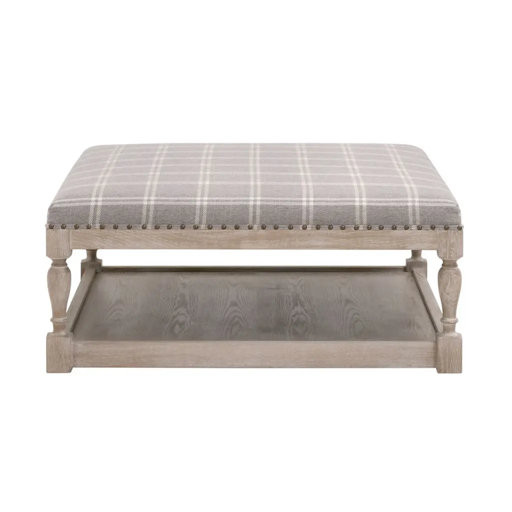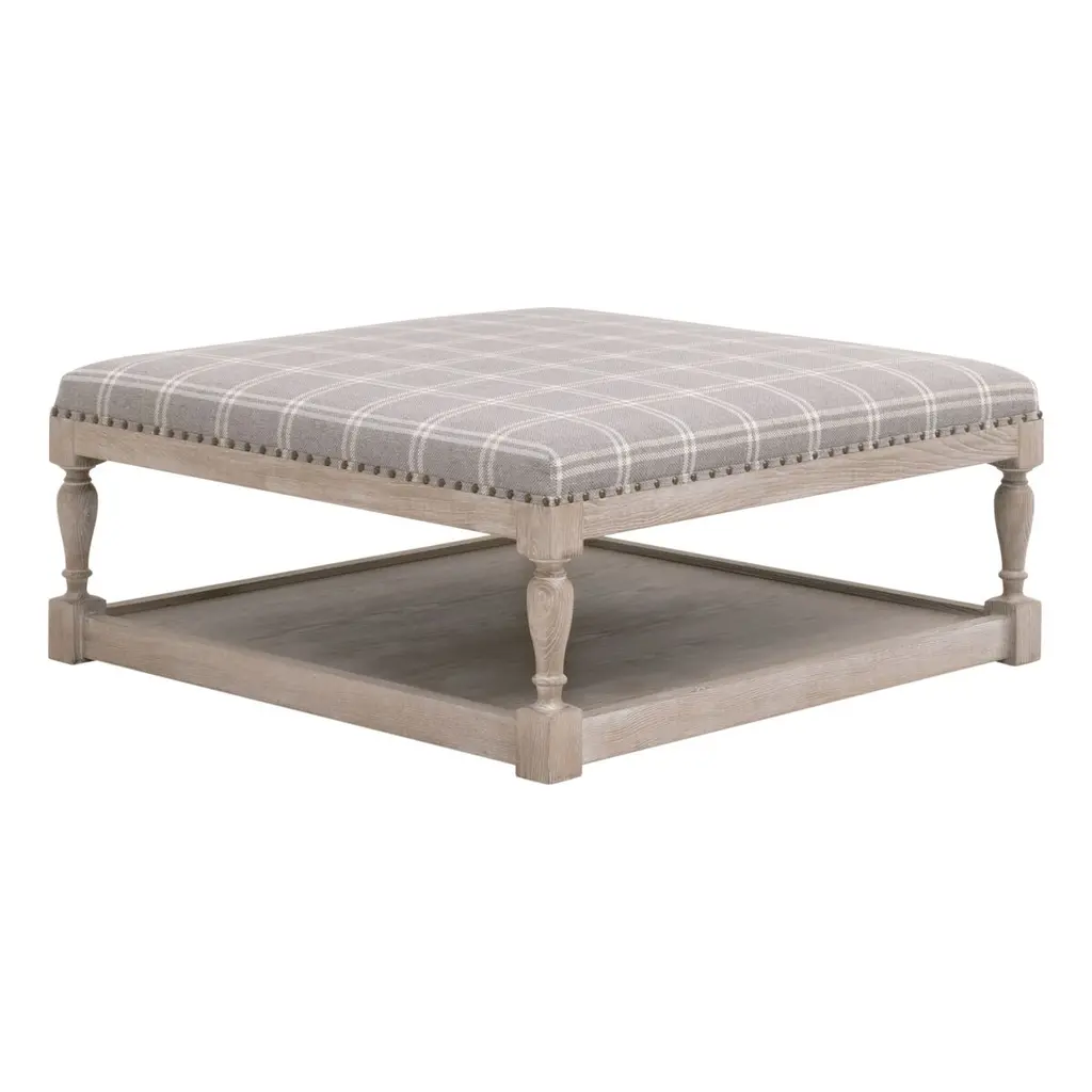 This statement-making upholstered coffee table will be the stand-out piece in your living space. It is upholstered with a performance fabric featuring a plaid pattern with nail tack detailing. Additionally, the fabric is stain-resistant to help maintain tidy appearances. The base is constructed with wood featuring turned wood detailing on the legs. The bottom of the table is solid wood and can be used as a storage shelf. Perfect for a farmhouse, traditional, or transitional home.