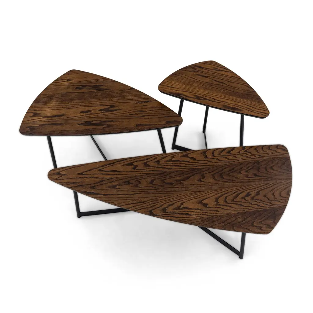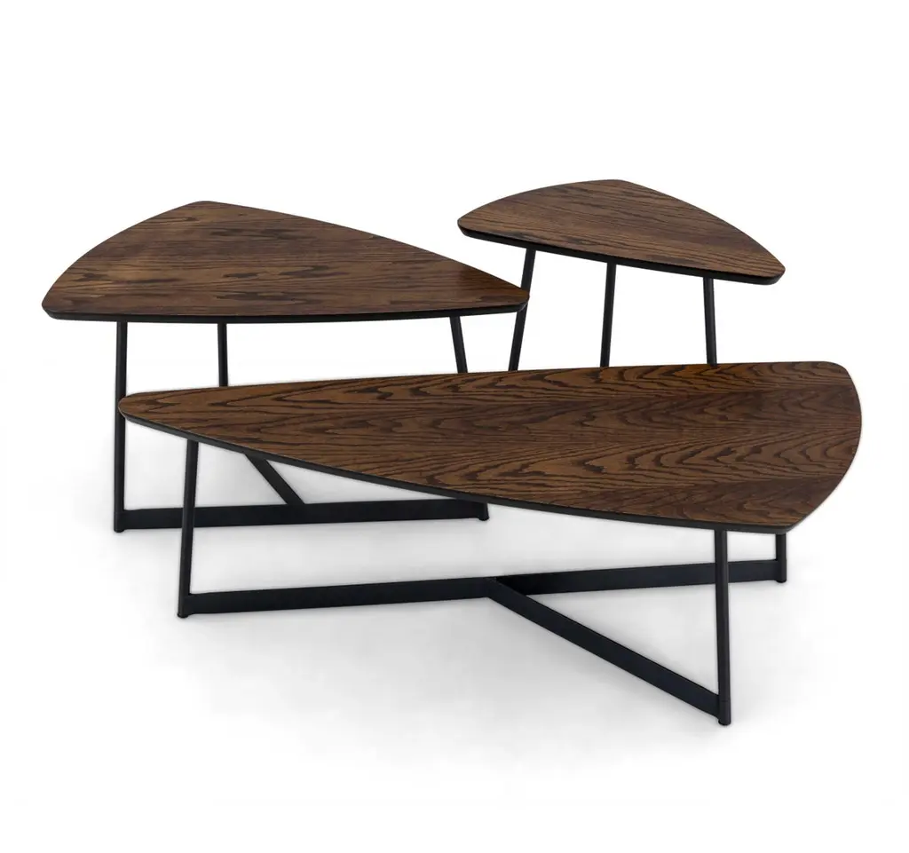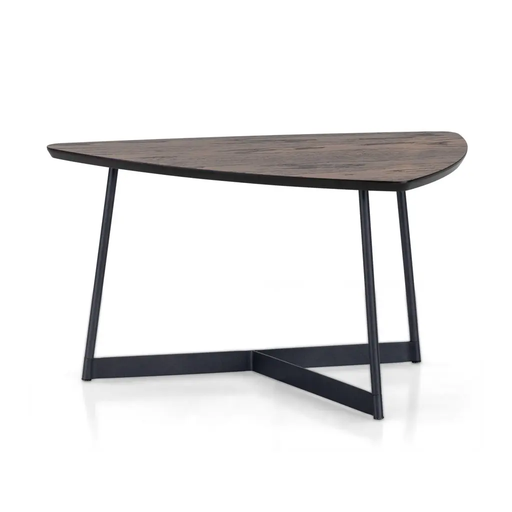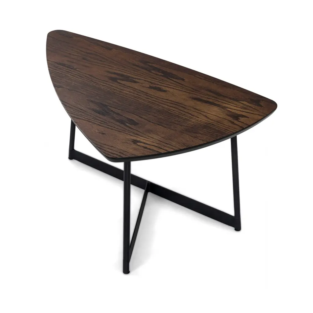 A Tria coffee table designed by Sérgio Batista for Uultis with dark oak 27-Inch veneered top and black metal base. The Tria Coffee Table, crafted with a 27-inch dark oak veneered top and a sleek black metal base, brings a bold yet minimalist aesthetic to your living space. Its unique triangular design allows for endless versatility, making it a functional centerpiece or an elegant side table. Perfect for modern or industrial-inspired interiors, this table enhances any room with its rich wood grain finish and streamlined form.Designed for both residential and commercial use, the Tria Coffee Table adapts seamlessly to a variety of settings. In a home, it can anchor a cozy seating area, provide surface space for decorative items, or hold books and beverages during gatherings. Its triangular shape also allows it to be paired with additional tables for a layered, dynamic arrangement. In a commercial environment, such as an office lounge or hotel lobby, it serves as a stylish yet practical focal point.Made with a commitment to sustainability, the Tria Coffee Table uses responsibly sourced materials and environmentally conscious practices. Its durable black metal base not only ensures stability but also complements the warm tones of the veneered top. Minimal assembly means it’s ready to elevate your space in no time. The Tria Coffee Table is more than just furniture—it’s a functional piece of art that blends style, practicality, and environmental awareness. Whether used alone or in combination with other pieces, it creates a sophisticated atmosphere that invites both comfort and modern charm.