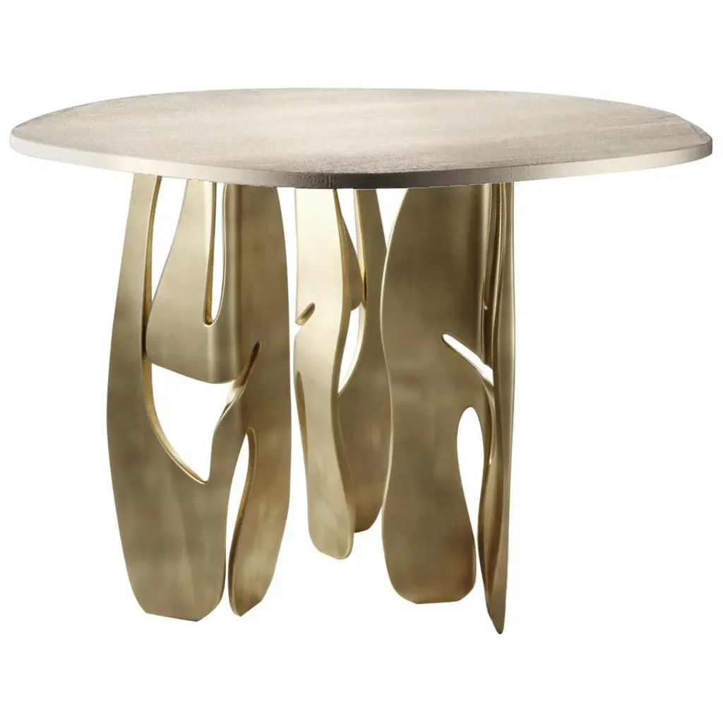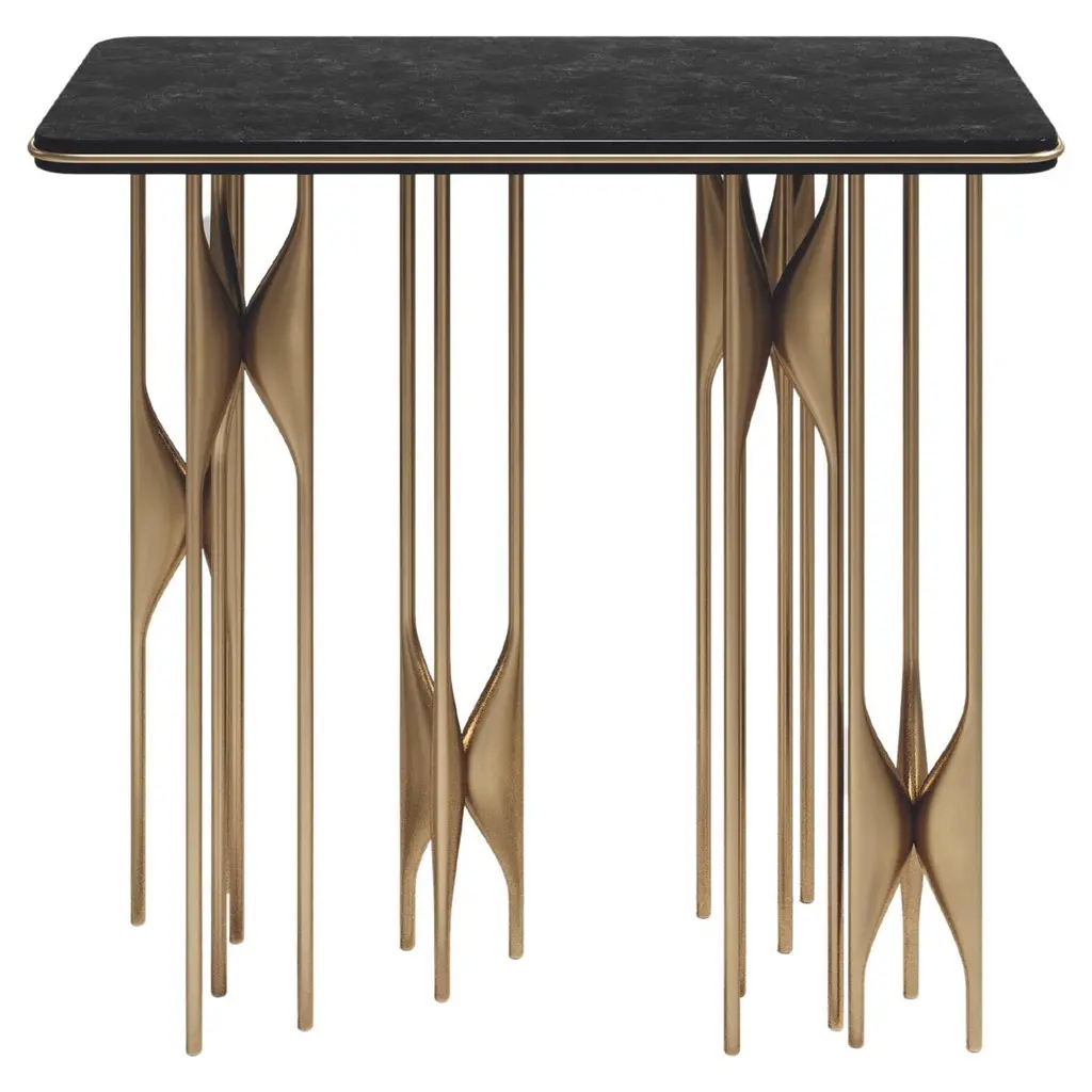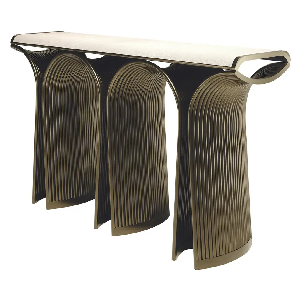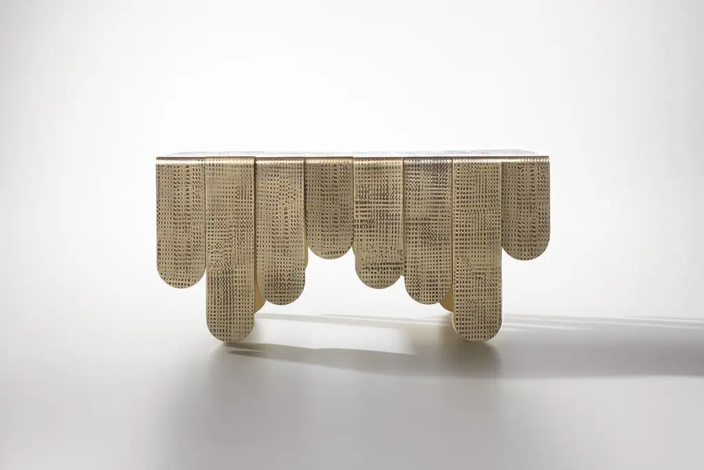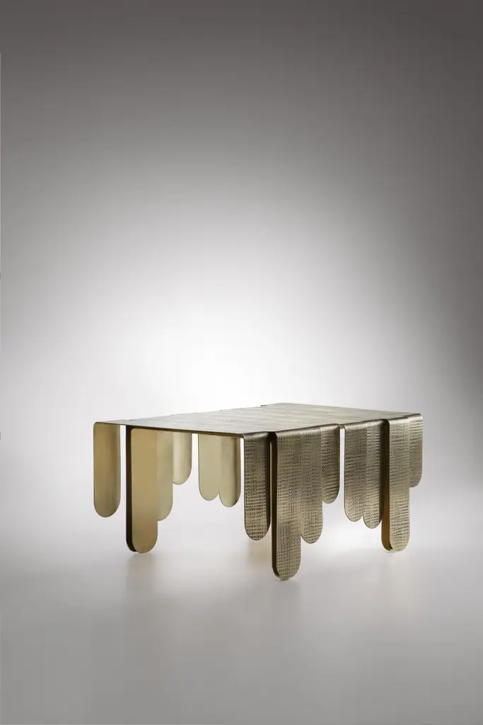Inspired by the refined, sinuous aesthetics of Art Nouveau, the Xilo coffee tablei is a veritable sculpturein metal that exalts the hand-crafted techniques and manufacturing excellence of the company.Three sheets of thick brass, rounded at the ends andof different lengths, have been folded and abutted irregularly to create rhythmic movement. Each element features a distinct weave of imprints that dissolve in delicately fading marks, in contrast to the polished brass surface.The impressions on the surface of Xilo are the memory of manual manufacturing methods, evidence of the advanced artisanal capacity of De Castelli, the fruit of tireless research into the material.The product can also be made in dimensions and finishes on request by varying the number of band modules, subject to confirmation of feasibility by De Castelli.The price is on request.