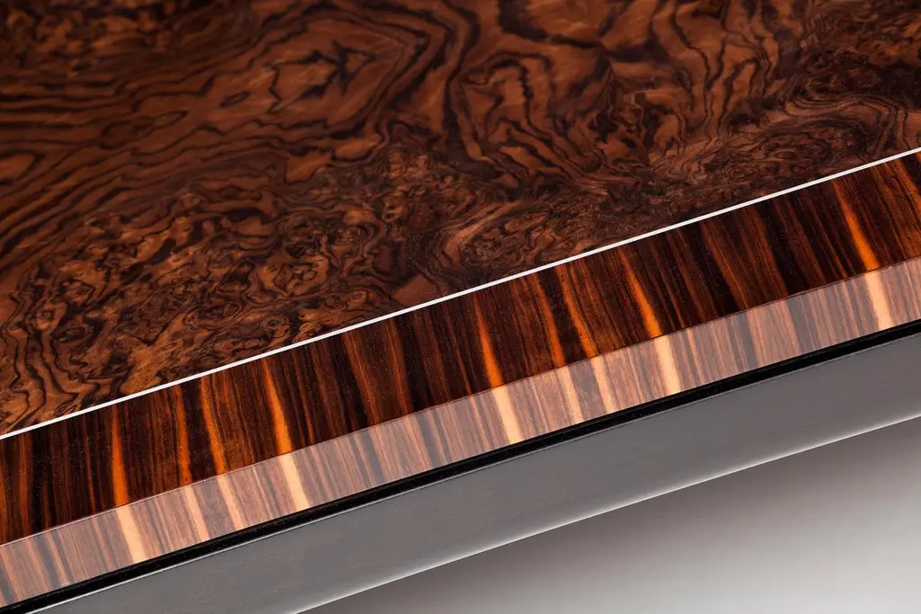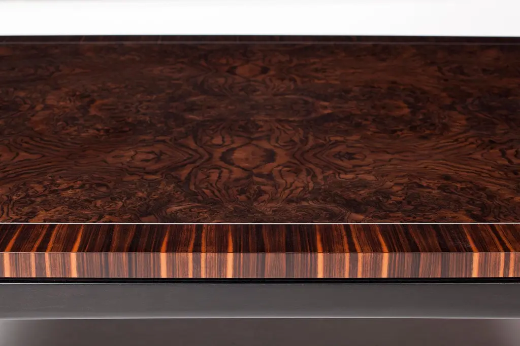 Deco Inspired Coffee Table In Macassar Ebony, Burr Walnut And Aluminium Details