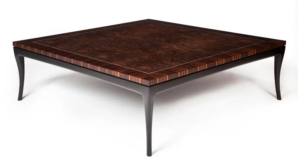 Deco-inspired large and modern coffee table in Macassar ebony and burr walnut with a white metal inlay. The tabletop sits on a blackened frame with elegantly carved black legs.Originally designed for clients with Art Deco interior styling, along with a pair of matching side tables. The complementary rich tones in Macassar ebony and burr walnut enhance the bold patterning of the veneers and the metallic, geometric detailing.The table photographed measured (1200 x 1200mm) x 450mm and would be considered quite a large coffee table. As each piece is made to order, this table can be made to any dimension requirement, and we provide direction/advice if required. Circular versions have also been commissioned by clients.Our coffee tables are finished with hard-wearing polyurethane lacquer and we provide care guidelines to each of our clients.