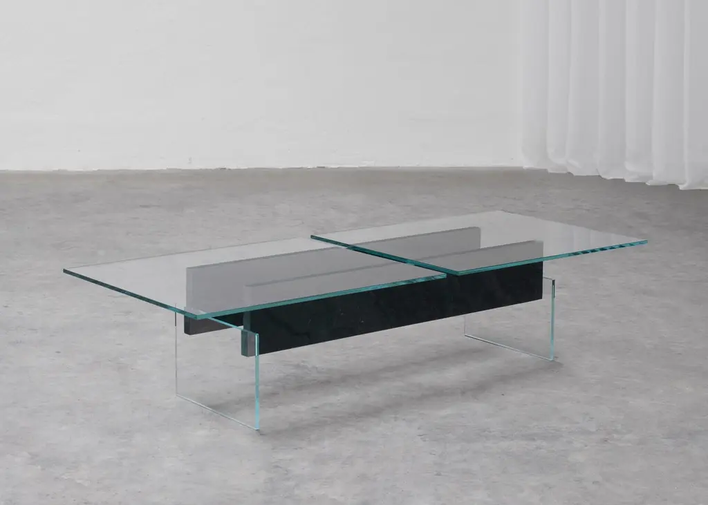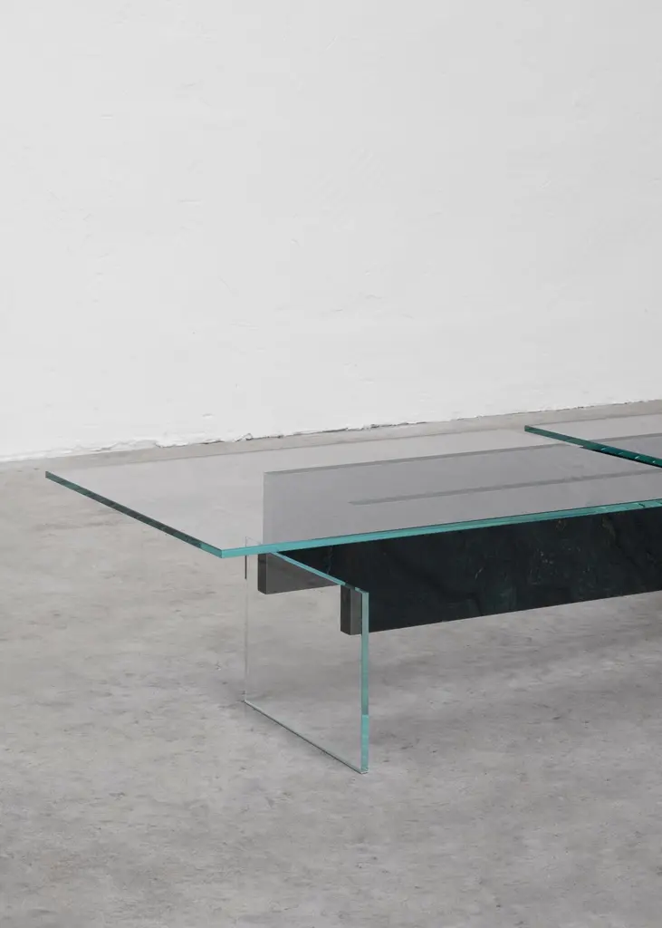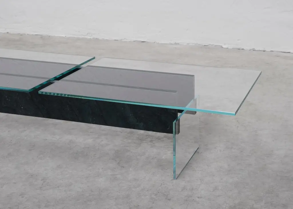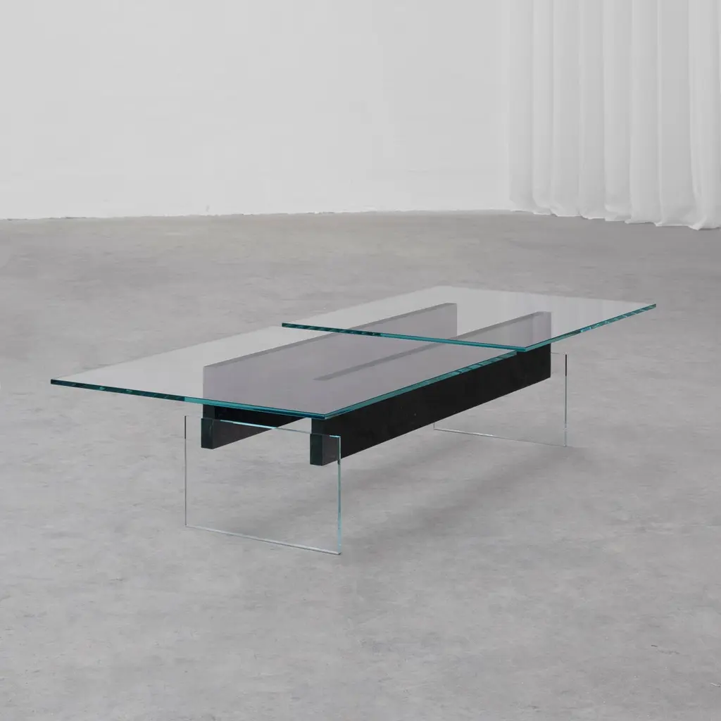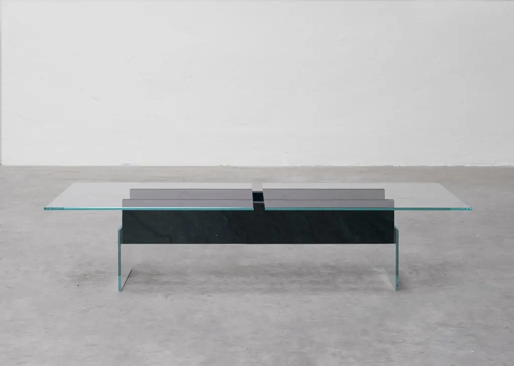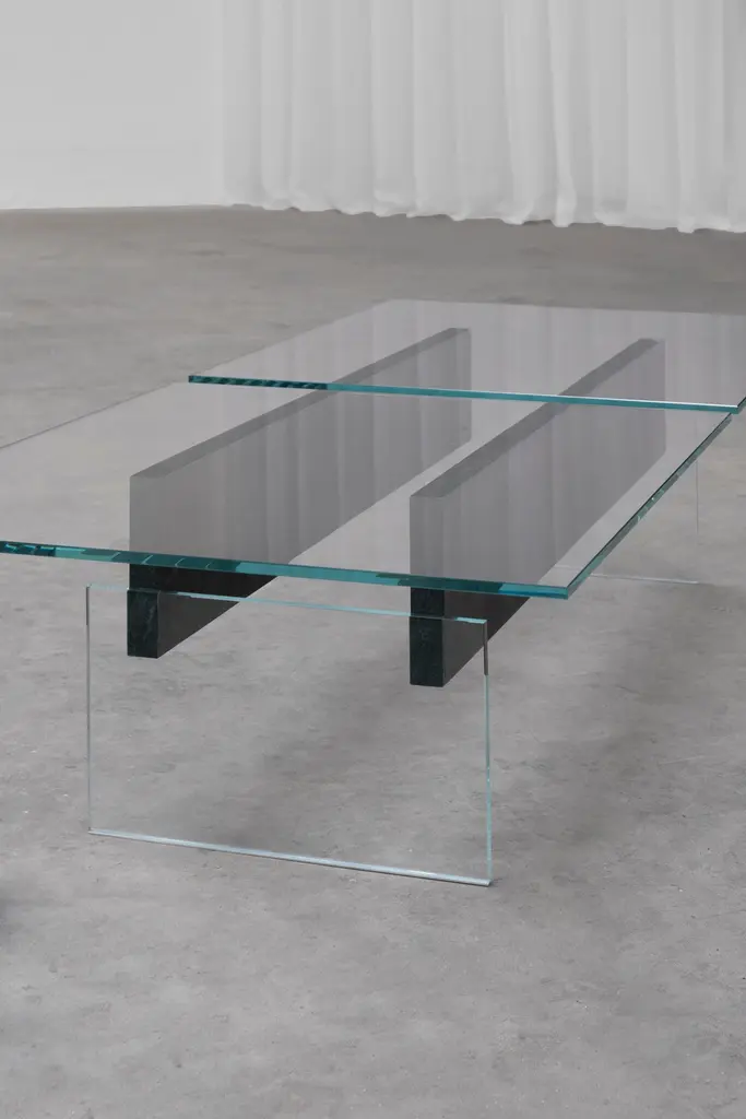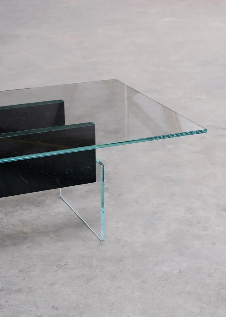 DELTA T Coffee Table Rainbow Avocado Granit by Frédéric SaulouLimited edition : 2/8 Dimensions: L 150 x W 60 x H 34 cmMaterials: White glass, Inox, Rainbow Avocado granitWeight : around 70 kgFrom one creation to another, the matter can present certain roughness and variations. Indeed, each piece is unique because of the natural appearance of the stone and its shaping. We carefully select our stones for the best result. Almost all the pieces are possible to be created made-to-measure for special sizes. The weight may vary. Please contact us.For several months, the designer Frédéric Saulou worked on the Parisian territory to exchange with local actors and create unique pieces using Meulière stone - a local stone emblematic of Paris, which was extracted from the construction site of line 18 of the future metro. of the Grand Paris Express. In the past, this stone was used to grind wheat in the region and for the construction of houses in the old Parisian countryside. “Pierre d’ici” questions the relationship between matter in space and its origin, between the earth and its extraction, in the context of the construction site of the Grand Paris Express. This set of furniture refers to the territory in full mutation between the historical context of the site and urbanization.Archaeological excavations have uncovered traces of man dating from the 5th to the 1st century BC, from the second Iron Age. Today, on this same territory, excavations have given way to other sites, such as the metro. The different pieces presented refer to these changing universes, both through the types of furniture used and in the use of the materials used.Meulière stone was recovered from the construction sites of line 18 of thefuture Grand Paris Express metro, a local resource whose quarries are now closed and are becoming difficult to exploit. The associated metal, a major element in the implementation of a construction site, symbolizes the link between the past and the present. It highlights the stone material and confirms the function of the object.The project is part of the landscape, both a vector of history and meaning. It also has made it possible to develop a common reflection around sustainability and the enhancement of local resources.In collaboration with Galerie philia, the Grand Paris Express companyand the cultural institution of the 104.Frederic Saulou's sculpted design artworks introduce a series of works coming from research and partnerships between local ateliers and designers and implemented to another scale, that of the object and contemporary creation.Frédéric Saulou is a proeminent French contemporary designer. Considered by many institutions and critics as one of the most talented designers of the new generation in France.Born in 1989, Frédéric Saulou lives and works in Rennes, France. He graduated in space and environmental design at the Institut Supérieur des Arts Appliqués (LISAA) in 2011 and in object design at the Ecole Européenne Supérieure des Beaux-Arts de Rennes (EESAB) in 2013. Frédéric will continue to perfect his experience within the Eric Gizard Associés agency and with the designer Frédéric Ruyant. In 2013, he founded the studio Frédéric Saulou Design Studio, an independent and multidisciplinary design and consulting agency that sees design as a space for research and exchange that allows him to develop a sensitive approach to forms and materials.Experimentation and research take precedence over his work in order to think of new materials and new uses. This accompanies his daily approach so that each project is conceived as a sculpture in its own right, between simplicity and technicality. His approach guides him towards a global approach but is also unique in his creations, thus creating particular interactions between the user and the object, between Industrial craftsmanship. Today Frédéric works on various projects, from objects to space, in series or limited editions and collaborates with prestigious institutions and brands such as the publishing houses Ligne Roset, Drugeot Manufacture, Brossier Saderne, Vista Alegre, Esprit Porcelaine Limoges, etc.