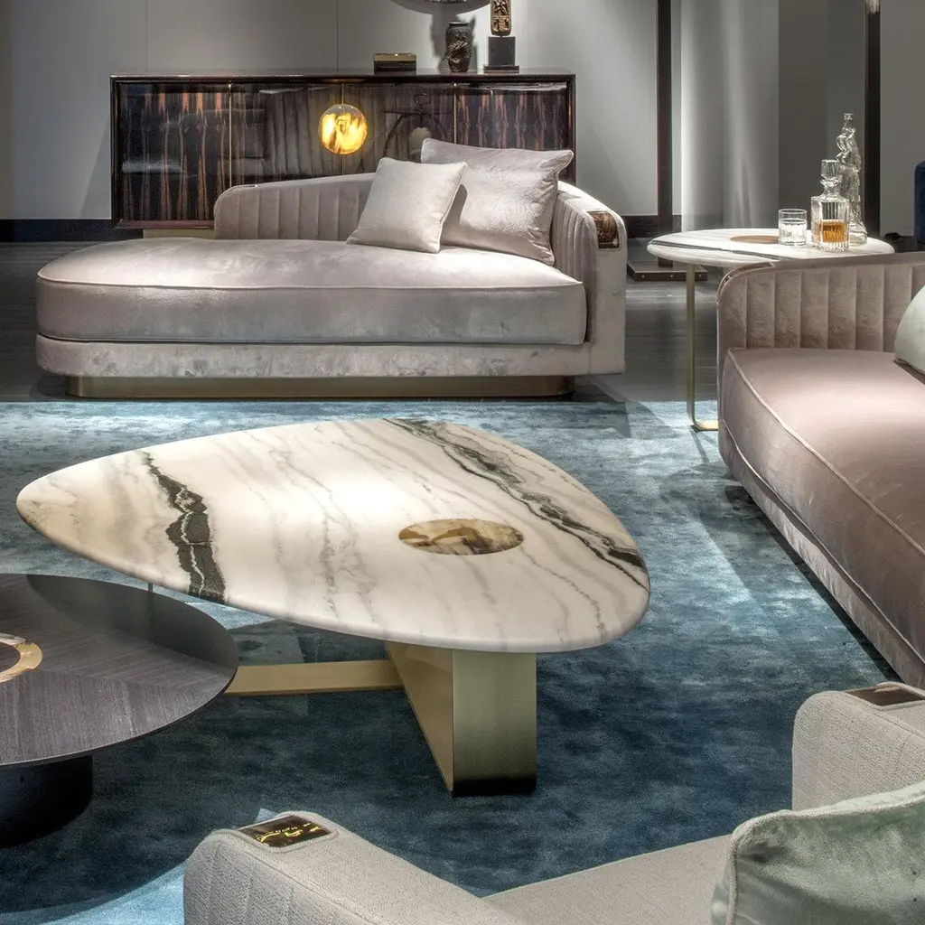 Part of a collection in which each piece is named after a Greek god, this sophisticated coffee table will imbue a modern living room with a one-of-a-kind elegant allure that comes from the bold combination of geometric volumes and the noble materials used: the bronzed-metal, three-legged structure supports a triangular top in satin-finished Dalmata marble with striking black veins over the white background that boasts a round insert in horn. Also available with a Carrara or Cartagine top and with a burnished metal base - please ask the Concierge for details and pricing with these options.