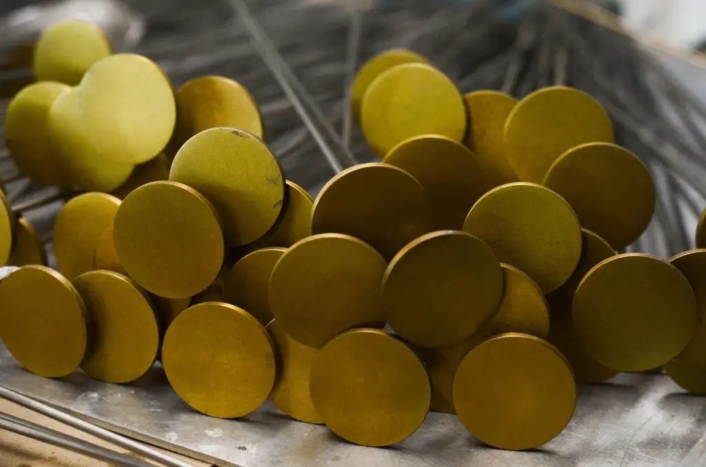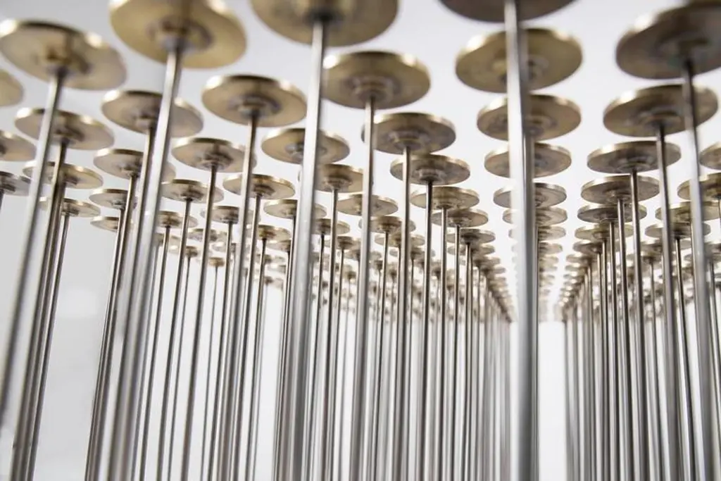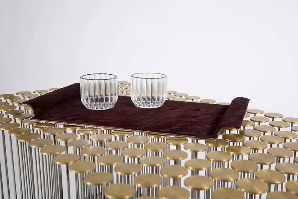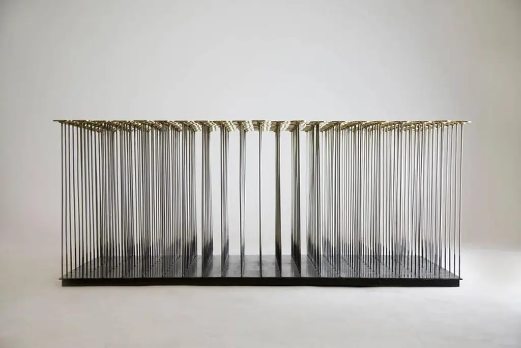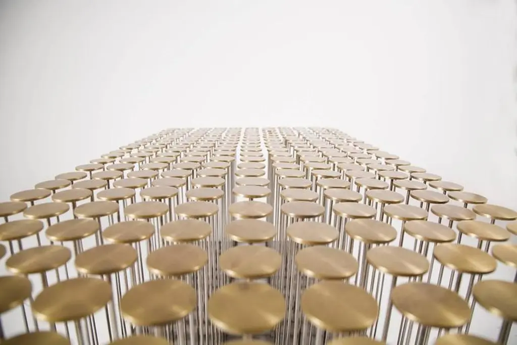 With a nod to Harry Bertoia, the Dischi table is both sculptural as it is functional. Amazingly stabile as a table surface, this piece is a willowy yet architectural statement which can also be customized into various shapes. Discs made of milled brass and a darkened stainless steel base, the stainless steel rods allow for the gentile movement of the tabletop.
