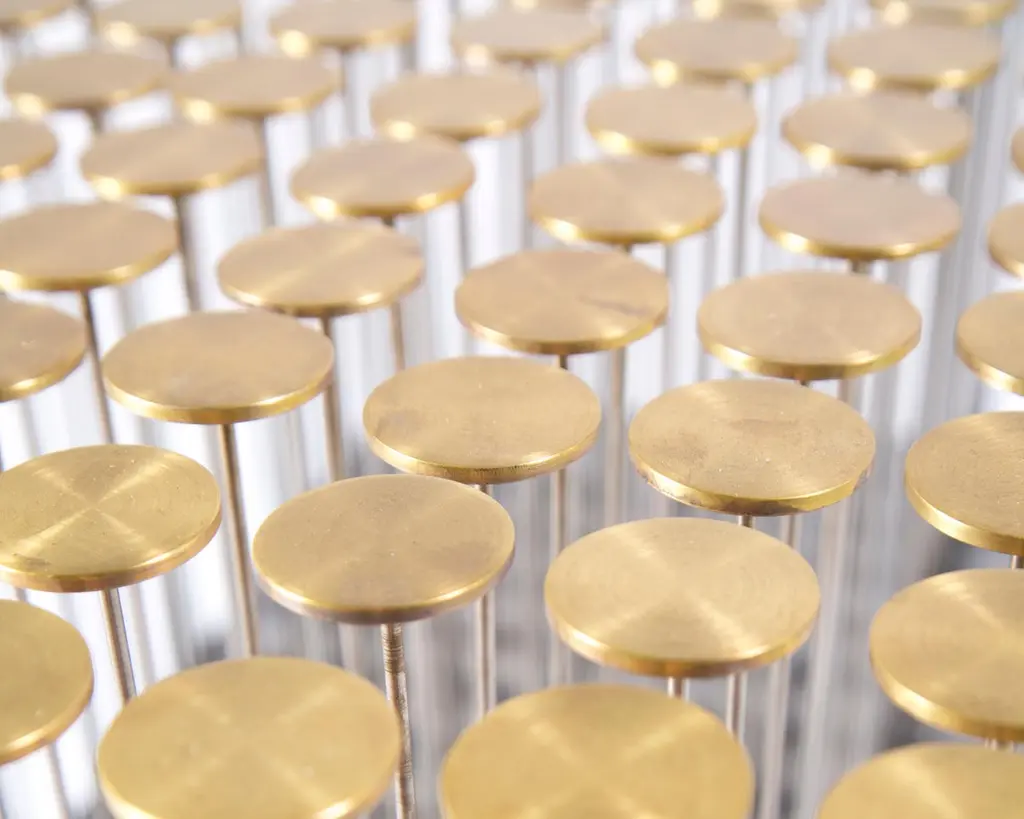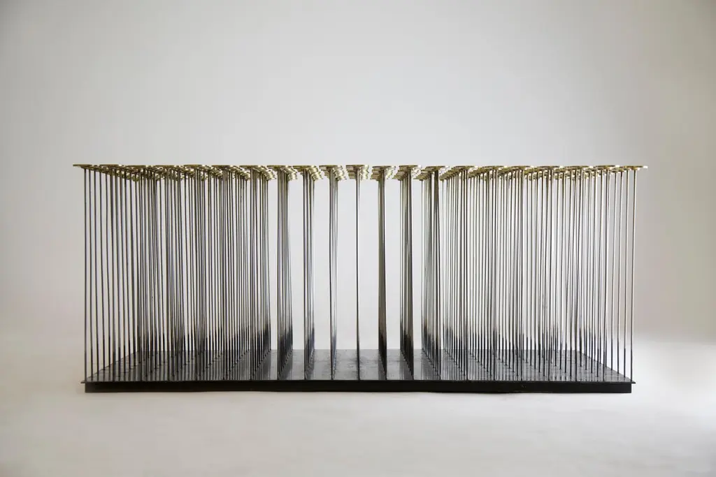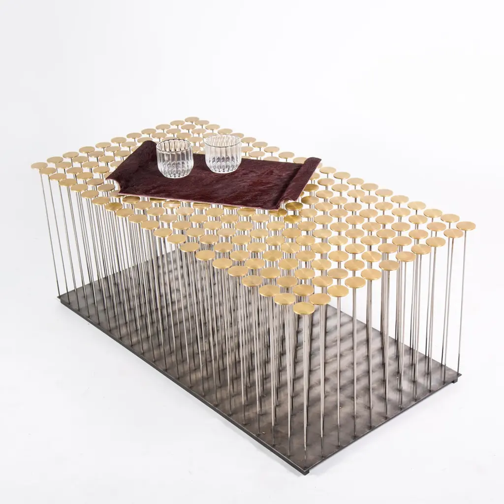 Dischi coffee table by Gentner DesignDimensions: D 90 x W 45.7 x H 35.5 cmMaterials: brass, darkened stainless steelWith a nod to Harry Bertoia, the Dischi table is both sculptural as it is functional. Amazingly stable as a table surface, this piece is a willowy yet architectural statement which can also be customized into various shapes. Discs made of milled brass and a darkened stainless steel base, the stainless steel rods allow for the gentile movement of the table top.Gentner DesignRooted in a language of sculpture, character defining details, and world renowned craftsmanship, the work is found at the crossroads of design and art.Established in 2011, the namesake furniture label is a rare combination of aesthetic dexterity and mastery of craft resulting in furniture and objects that are expressive, formal, and transcend materiality.The collection is based in metal and incorporates only natural materials such as leather, wood, and glass in unique ways, challenging our assumptions.Christopher GentnerChristopher Gentner, with a BFA in metalsmithing from the Cleveland Institute of Art and apprenticeships under sculptors and jewelers, together with dedication to craft, quickly developed his reputation nationally as a foremost authority of metal fabrication and furniture.One of his crowning achievements was the re-creation and fabrication of the Frank Lloyd Wright Robie House gates.These unique experiences are the foundation of his design philosophy which he employs in his own line of furniture, lighting, and objects.