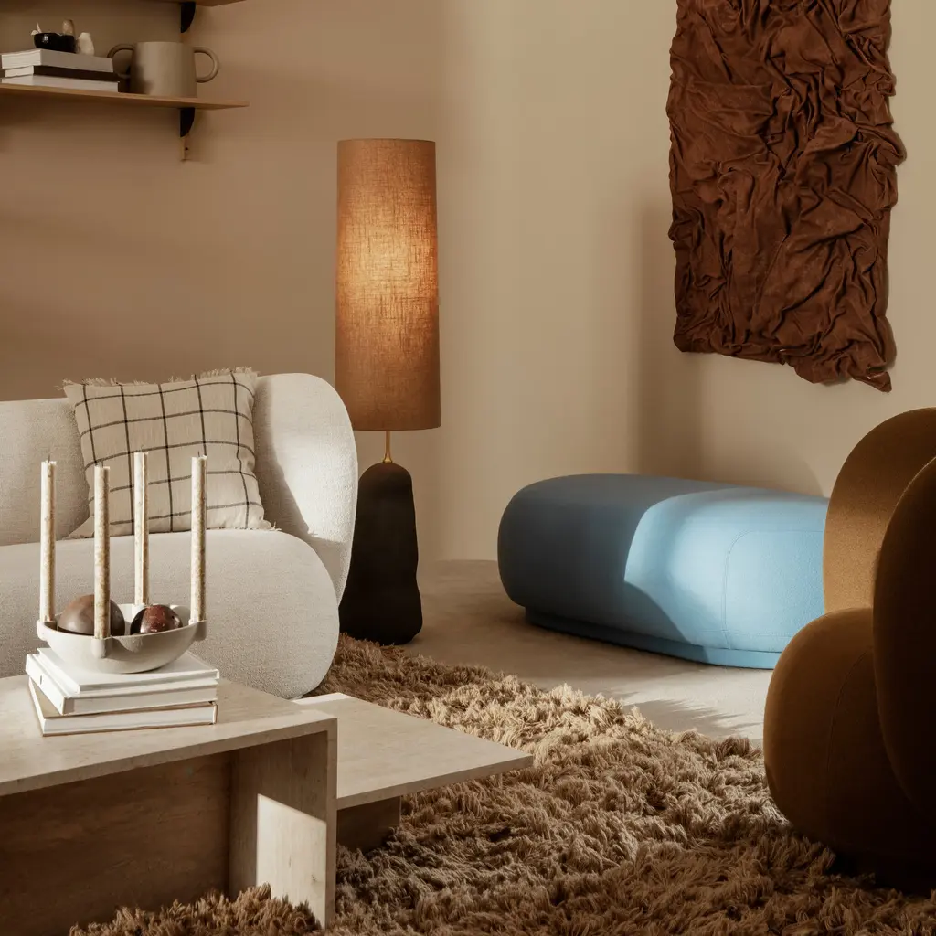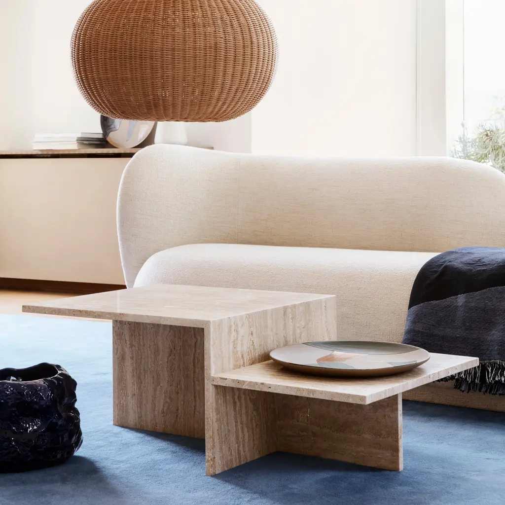 Danish design brand Ferm Living grew out of a graphic design agency and that attention to line and form linger in Distinct, a coffee table also inspired by Japanese minimalism. Exquisitely shaped from travertine, a sand-hued limestone, the spare construct creates a contrast to the richness of the stone's earthy texture. In front of a sofa or paired with a lounge chair, its geometric presence adds inimitable character to a room.
