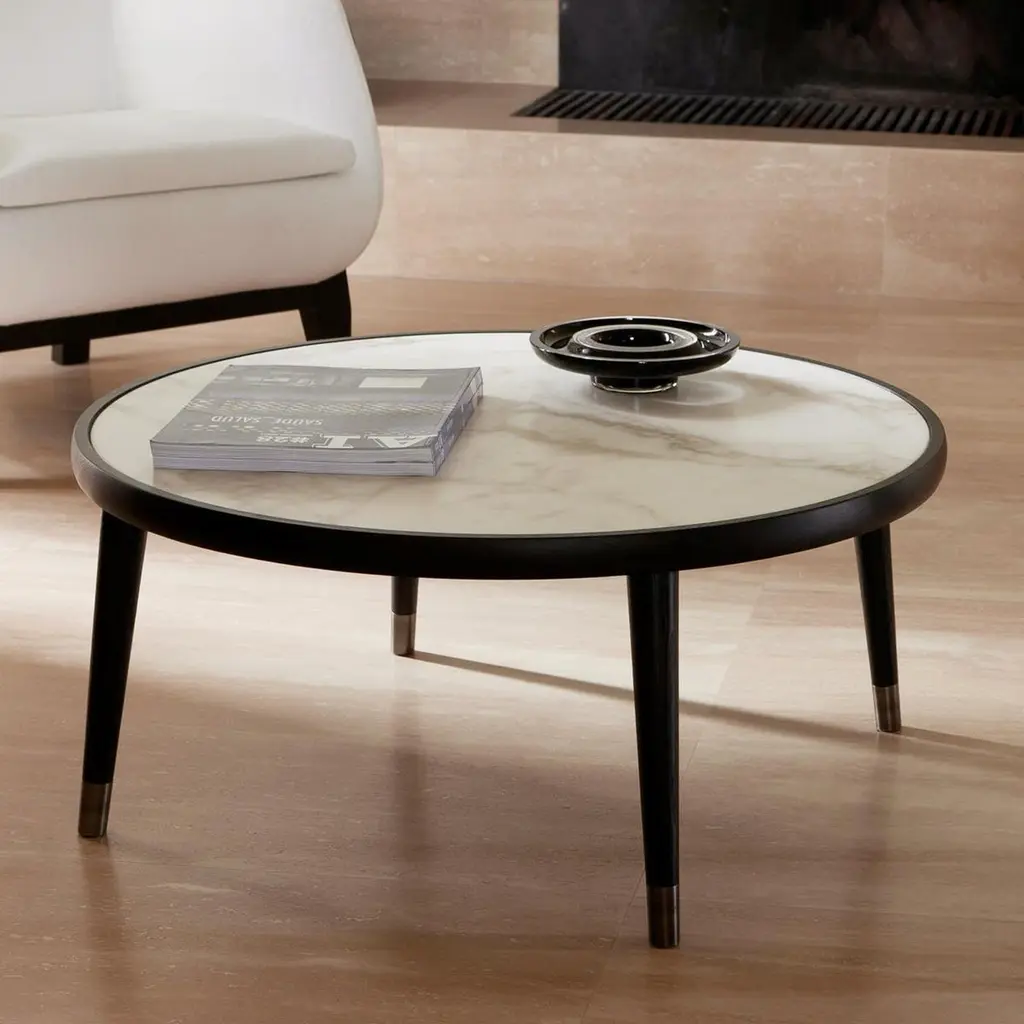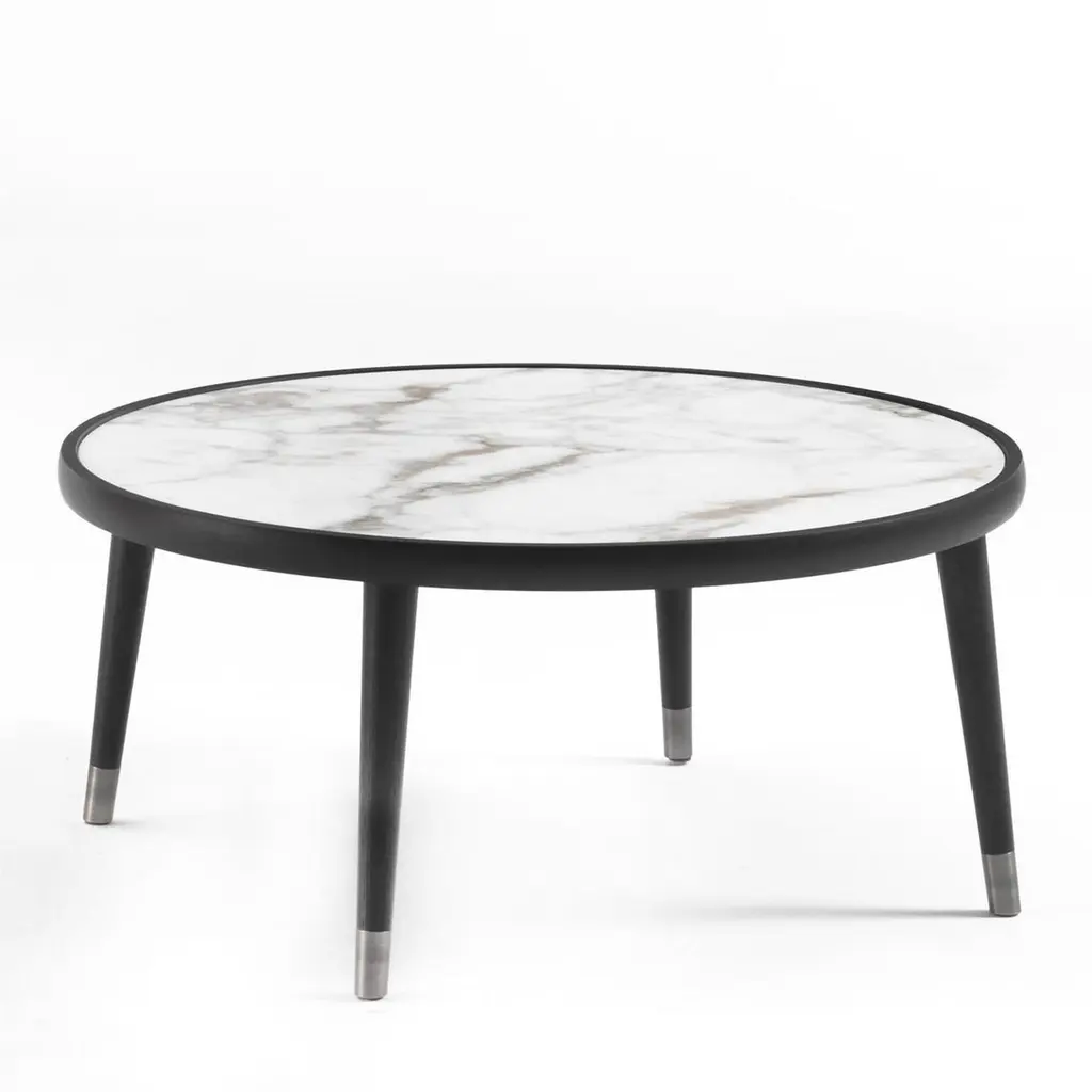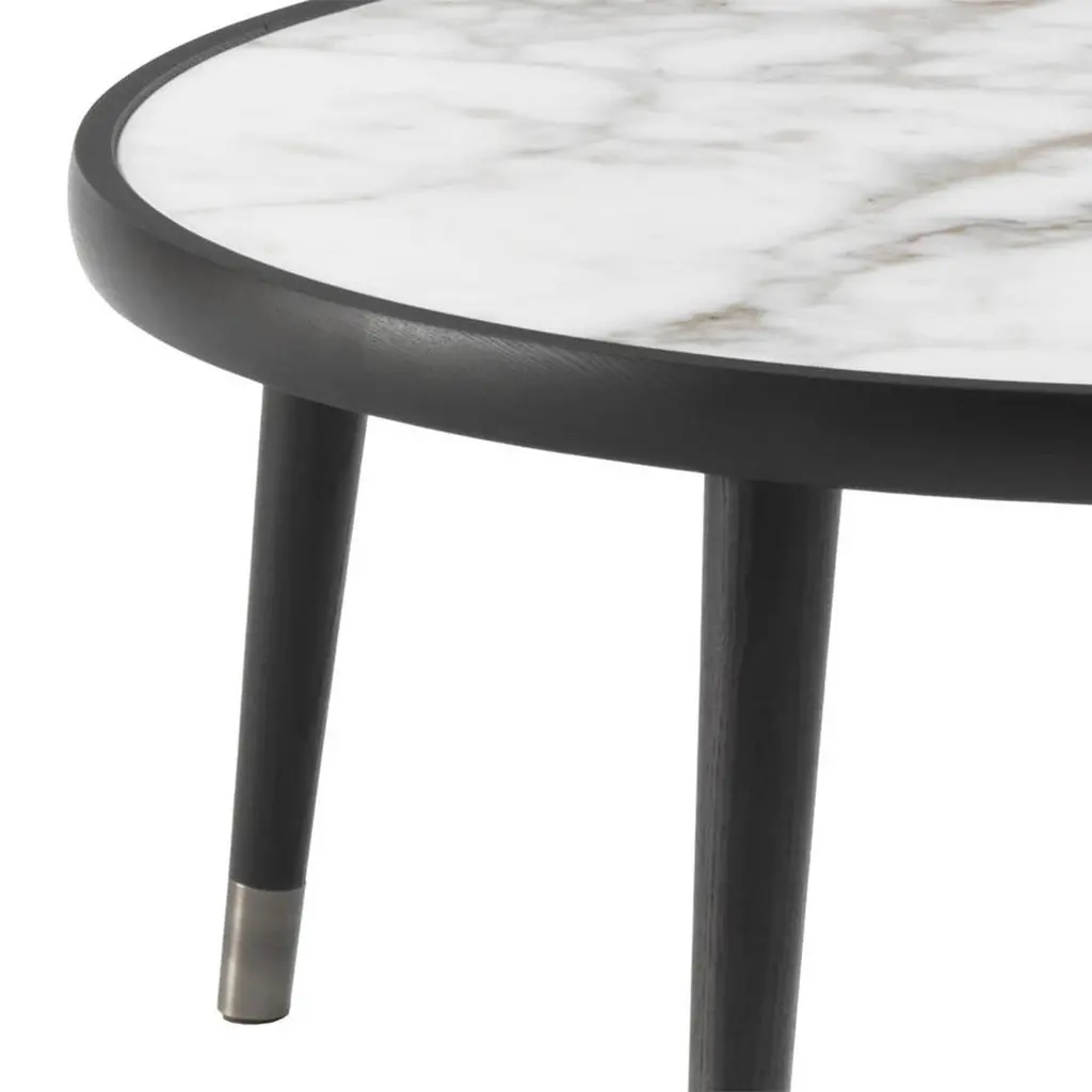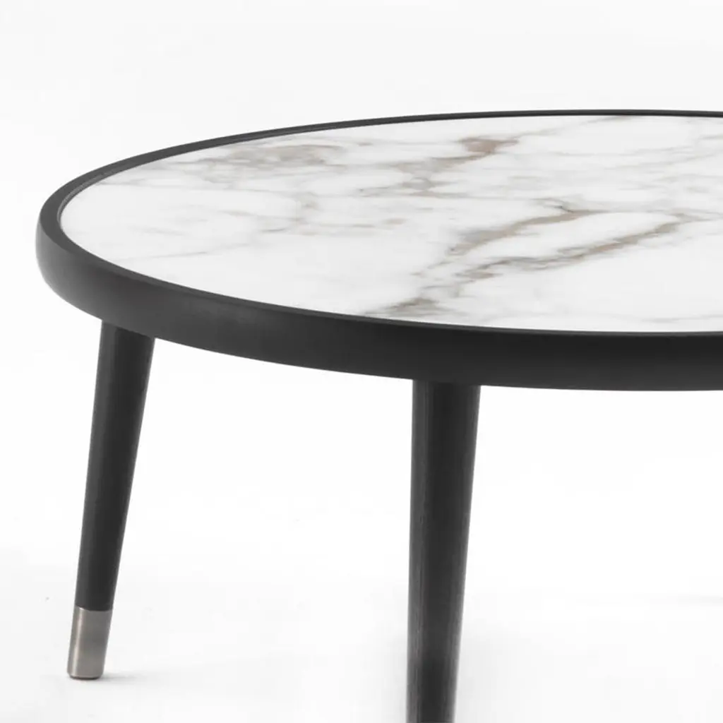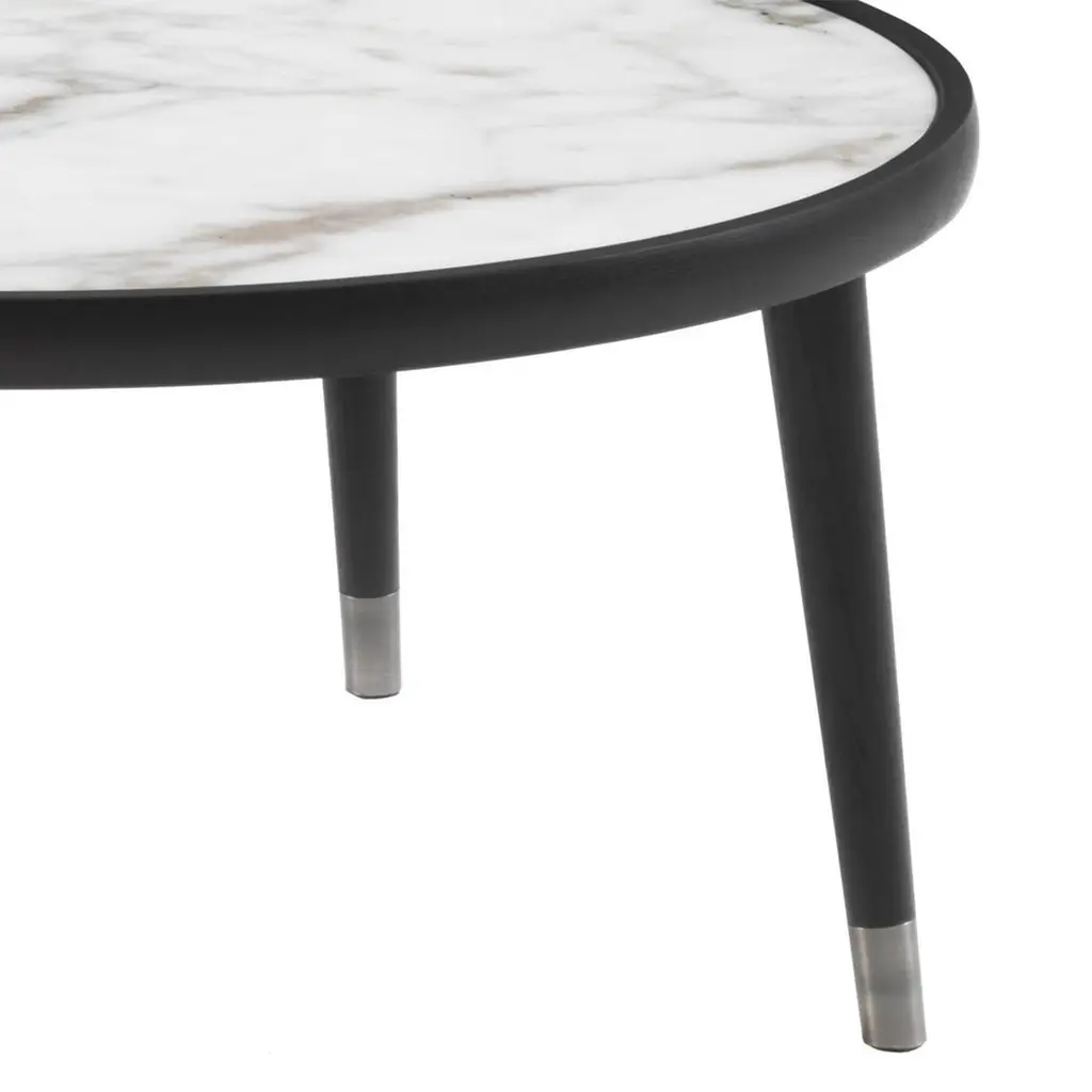 Coffee table domio marble with solid ash structure and round calacatta white marble top in black finish. With metal parts on feet.Also available on request with other marble top finishes.