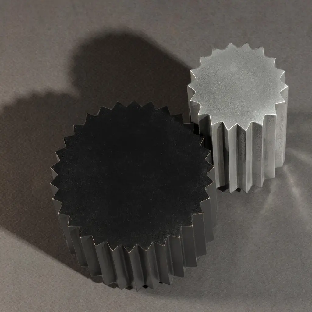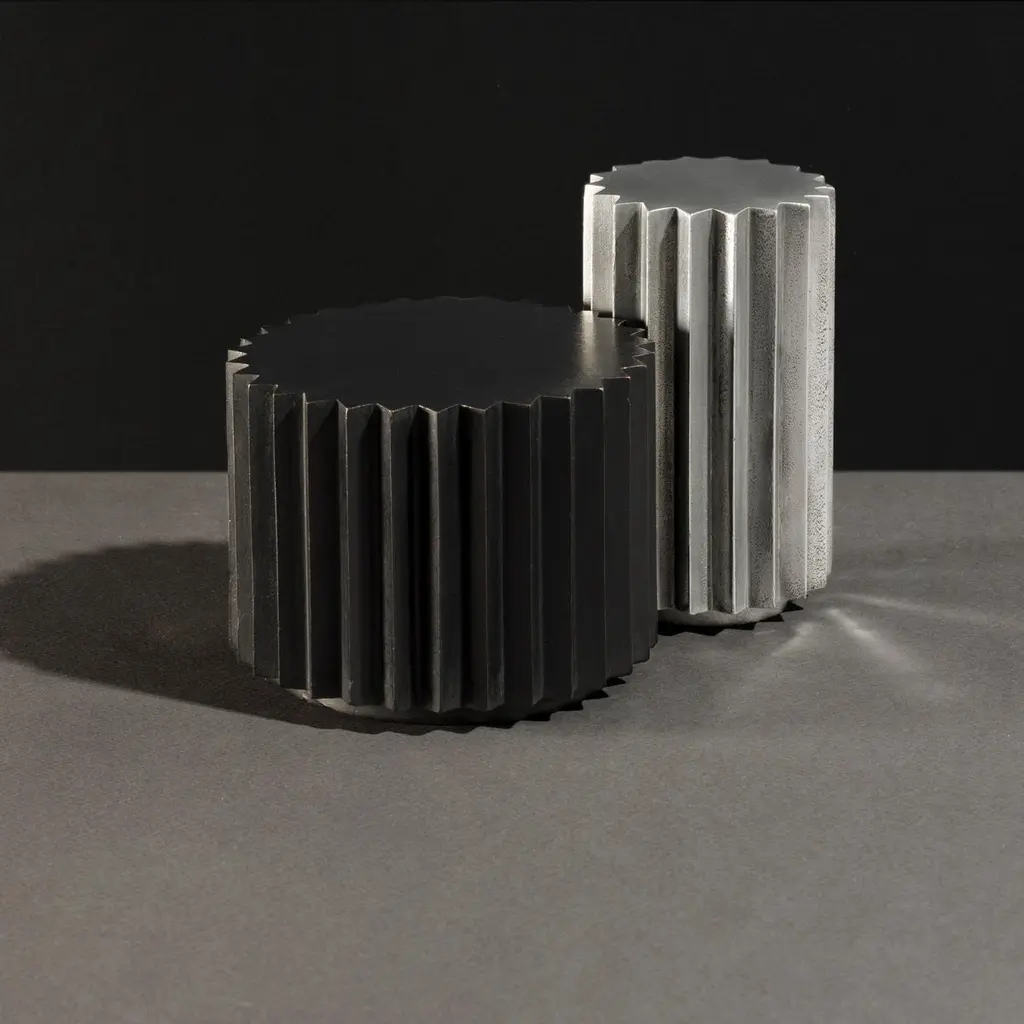 Side tables in cast bronze or aluminum of different diameters and heights that can be combined to create a coffee table. Inspired by Doric columns in Archaic architecture, the extruded multi-point stars have a different finish on each vertical face: the cast metal is polished on one side but left raw on the other. The shading is amplified by the different finishes resulting in a dramatic effect. Similar to gears, the tables can be meshed together to form a centre table set, possibly using tables of different heights and even materials.Crafted in Tuscany, Italy, in a foundry specialized in bronze sculptures, serving artists among the most renowned in the world.Standard materials: bronze and aluminum (polished and coarse).Standard sizes:Diameter 33.0” x Height 11.8” (L)Diameter 23.6” x Height 16.5” (M)Diameter 14.2” x Height 23.6” (S)This listing is for a set of 2 pieces with the medium table in blackened bronze and small table in aluminum. For other combinations or single tables please see the dedicated listings or contact Fred&Juul. About Fred&Juul:Fred&Juul renew traditions by making customs and techniques reappear from the past while applying fine Italian craftsmanship to contemporary design. Founded by Italian-Dutch architects’ duo Federico Minarelli and Julie Janssen, the brand explores the possibilities of producing designs that are versatile and elegant while being exclusively handcrafted by local artisans from traditional materials like brass and solid wood. Fred&Juul’s design philosophy is aimed at sustainability and contrasting the throw-away society by creating pieces that will last, both for their exceptional quality and for their timeless appearance.Every piece is manufactured in small specialized workshops scattered around Tuscany. The designers manage the entire production process and have a direct relationship with the craftsmen and women, who are involved in the design process from the early stages. The result is contemporary collection that conjures up the refined artistry of centuries old craftsmanship.