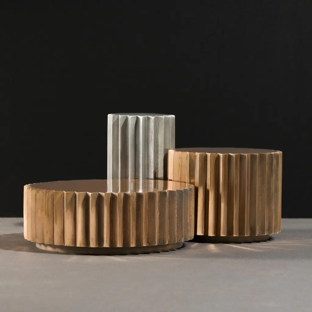 Side tables in cast bronze or aluminum of different diameters and heights that can be combined to create a coffee table. Inspired by Doric columns in archaic architecture, the extruded multi-point stars have a different finish on each vertical face: the cast metal is polished on one side but left raw on the other. The shading is amplified by the different finishes resulting in a dramatic effect. Similar to gears, the tables can be meshed together to form a center table set, possibly using tables of different heights and even materials.Crafted in Tuscany, Italy, in a foundry specialized in bronze sculptures, serving artists among the most renowned in the world.Standard materials: bronze and aluminum (polished and coarse).Standard sizes:D 33.0” x H 11.8” (L)D 25.2” x H 16.5” (M)D 14.2” x H 23.6” (S)This listing is for a set of 3 pieces with the large and medium table in oxidized bronze and blackened bronze and the small table in aluminum. For other combinations or single tables please see the dedicated listings or contact Fred&Juul.About Fred&Juul:Fred&Juul renew traditions by making customs and techniques reappear from the past while applying fine Italian craftsmanship to contemporary design. Founded by Italian-Dutch architects’ duo Federico Minarelli and Julie Janssen, the brand explores the possibilities of producing designs that are versatile and elegant while being exclusively handcrafted by local artisans from traditional materials like brass and solid wood. Fred&Juul’s design philosophy is aimed at sustainability and contrasting the throw-away society by creating pieces that will last, both for their exceptional quality and for their timeless appearance.Every piece is manufactured in small specialized workshops scattered around Tuscany. The designers manage the entire production process and have a direct relationship with the craftsmen and women, who are involved in the design process from the early stages. The result is contemporary collection that conjures up the refined artistry of centuries old craftsmanship.