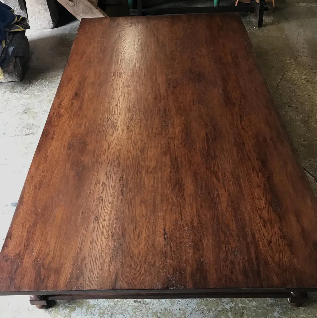 This is a Dos Gallos custom coffee table is reminiscent of an old Spanish Colonial table but with a modern outlook. This particular table was made in a very large scale 90x54, however it can be made in a smaller size as well. The legs are delicately turned and the top is hand planed and hand finished. It can be made to look more antique or contemporary depending on type of wood and finish chosen. Shown here in Oak with hand planed top and medium to heavy distress in client's custom color. Dos Gallos carry a variety of samples and finishes. All custom pieces are made in Los Angeles. Please inquire for pricing as it depends on size. Lead time is 14 weeks.CUSTOM PIECES ARE NON RETURNABLE. CUSTOM PIECES ARE A FINAL SALE