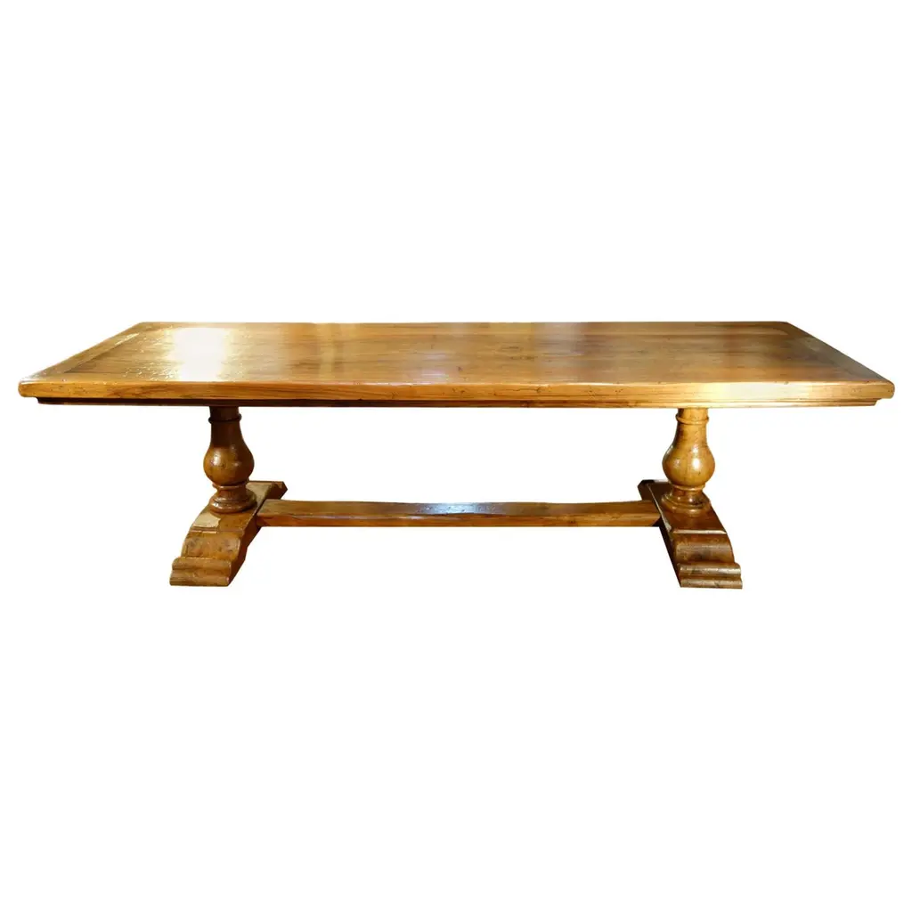 This is a Dos Gallos custom coffee table is reminiscent of an old Spanish Colonial table but with a modern outlook. The legs are delicately turned and the top is hand planed and hand finished. It can be made to look more antique or contemporary depending on type of wood and finish chosen. Shown here in Oak with hand planed top and medium to heavy distress in client's custom color. Dos Gallos carry a variety of samples and finishes. All custom pieces are made in Los Angeles. Please inquire for pricing as it depends on size. Lead time is 14 weeks.CUSTOM PIECES ARE NON RETURNABLE. CUSTOM PIECES ARE A FINAL SALE