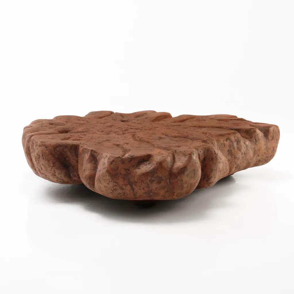 Down to Earth Coffee Table by OdditiUnique and NumberedDimensions: ⌀ 140 x H 30 cmMaterials: Onyx, Sandstone, Granite, Recycled Brick, Recycled Copper'Down to Earth' was excavated from our inner landscape, inspired by the physical immensity and powerful visuals of the Australian desert. Hand sculpted to create a red earth sedimentary stone formation, made from a composite of sandstone, onyx, granite, recycled brick and recycled copper pieces. Floating like an island of desert, this sculptural coffee table creates a surreal atmosphere, bringing a raw natural energy into your space.This is a meticulously hand sculptured product; each object will have its own unique presence and feature interesting variations in the natural materials and forms created during the artisanal process.WORLD OF ODDITIOdditi takes a curious look at the relationship between nature and humanity, exploring our inner and outer landscapes and creating objects that live between the worlds of art and design.A creative collaboration between Haydee Dowse and Jonathan Glaser, a couple in design and life, with original roots planted in Sydney and Stockholm. Odditi, as an extension of its creators, is nomadic by nature with creative spaces in Australia and Sweden.“We treat life as art and our way of living becomes connected to our way of creating. Our pieces are born from a deep inherent need to create, a natural yet undeniable process, where an idea must be brought to life”Odditi pieces are shaped by abstracting forms from nature and transforming them into surreal objects that exist between nature, and our perception of it. “We recognise the importance of our connection to nature and the positive effect it has on our lives, seeking to bring fragments of the wild natural world into our spaces.”