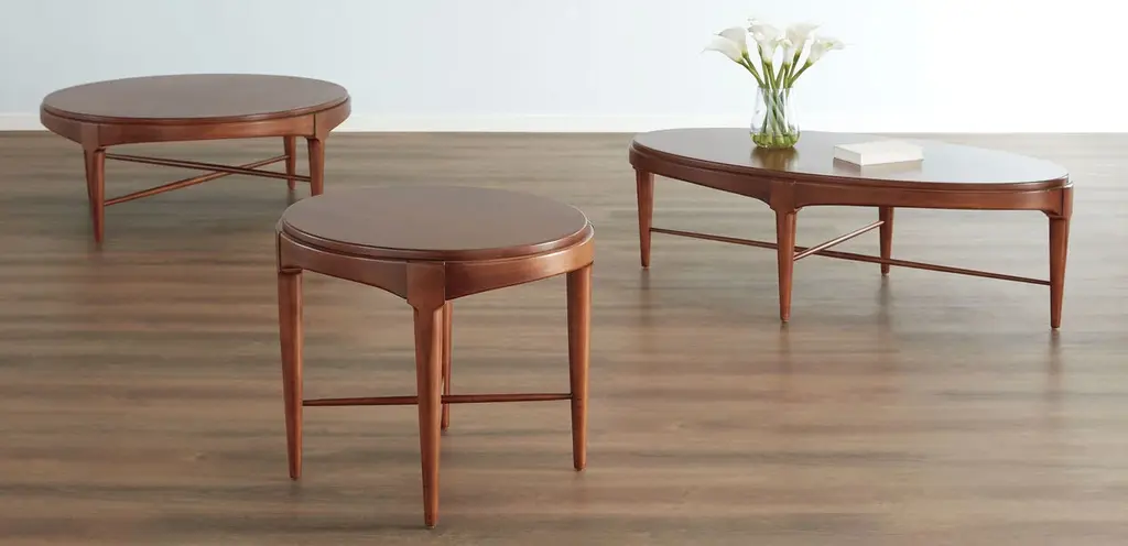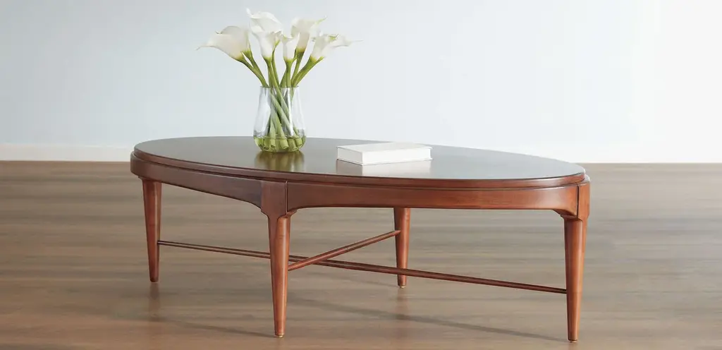 Our Draper oval coffee table is a collection of midcentury details that emphasize the era's hallmark tidy forms: soft curves, subtle aprons, floating stretchers, and slim, rounded tapered legs. Handcrafted using maple in our own workshops; choose your favorite finish.
