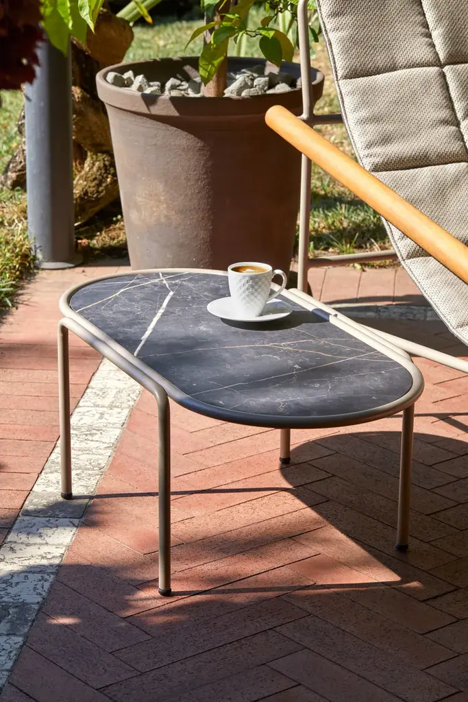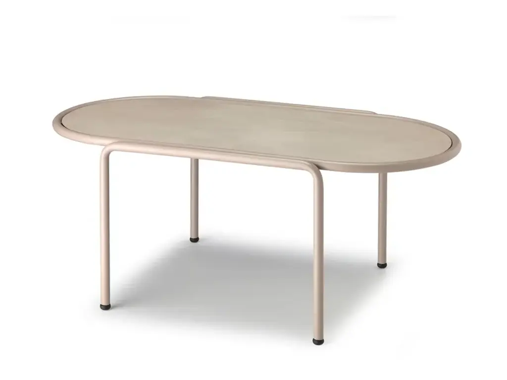Dress_Code is a oval painted metal coffee and HPL table.The concept of matching set is also borrowed from the world of fashion. DRESS_CODE includes also a family of casual coffee tables, to be used individually or in partial overlapping of heights and shapes next to the DRESS_CODE seat. Metal tops, HPL, in addition to the innovative carbonated cork, rest on the base made in coated metal with a tubular section like the armchair of the same name: to furnish our rooms dedicated to relaxing with unusual glam.“The round and square shapes and the interaction of the two, the oval shape. The circle is a symbol of continuity, of the cyclic nature of things and therefore the relationship with time, seasons, the everyday. The square represents space”. gumdesign