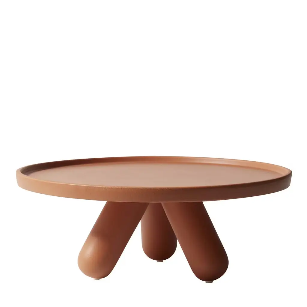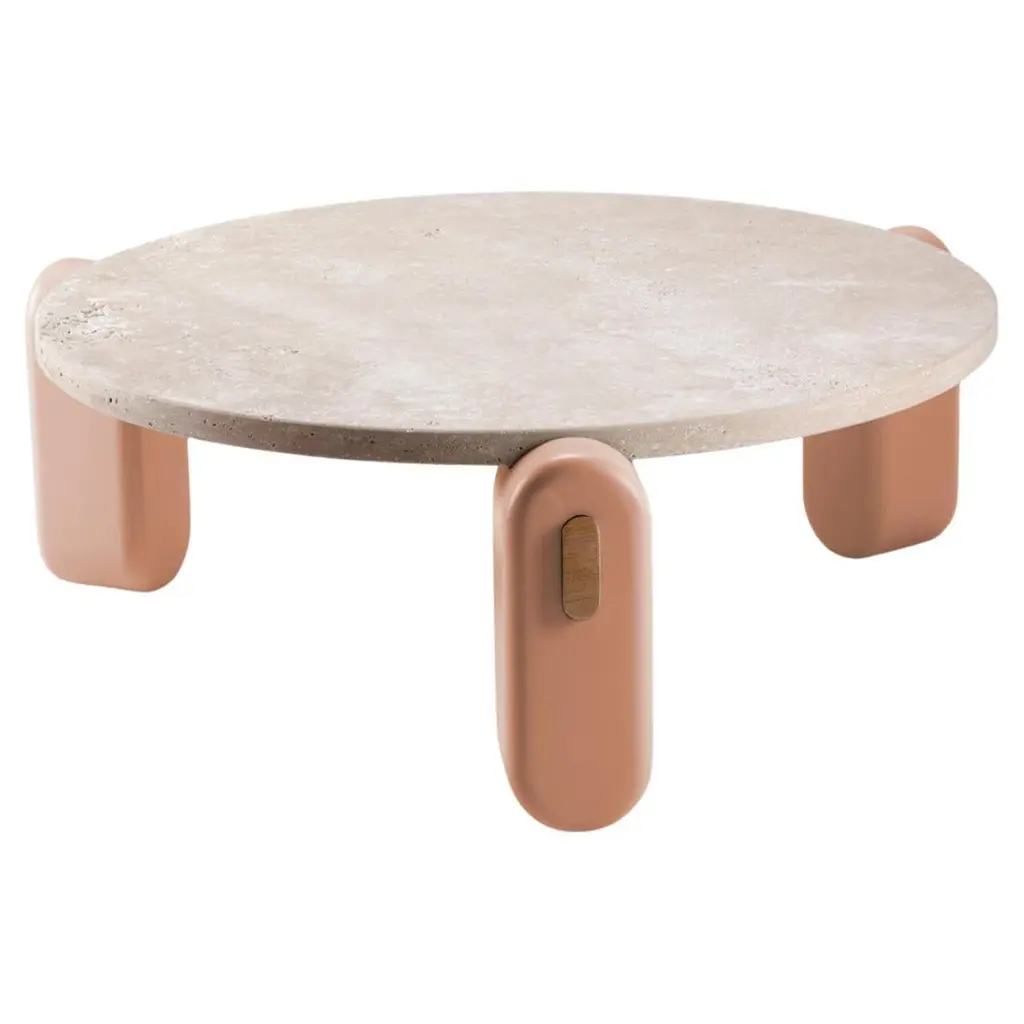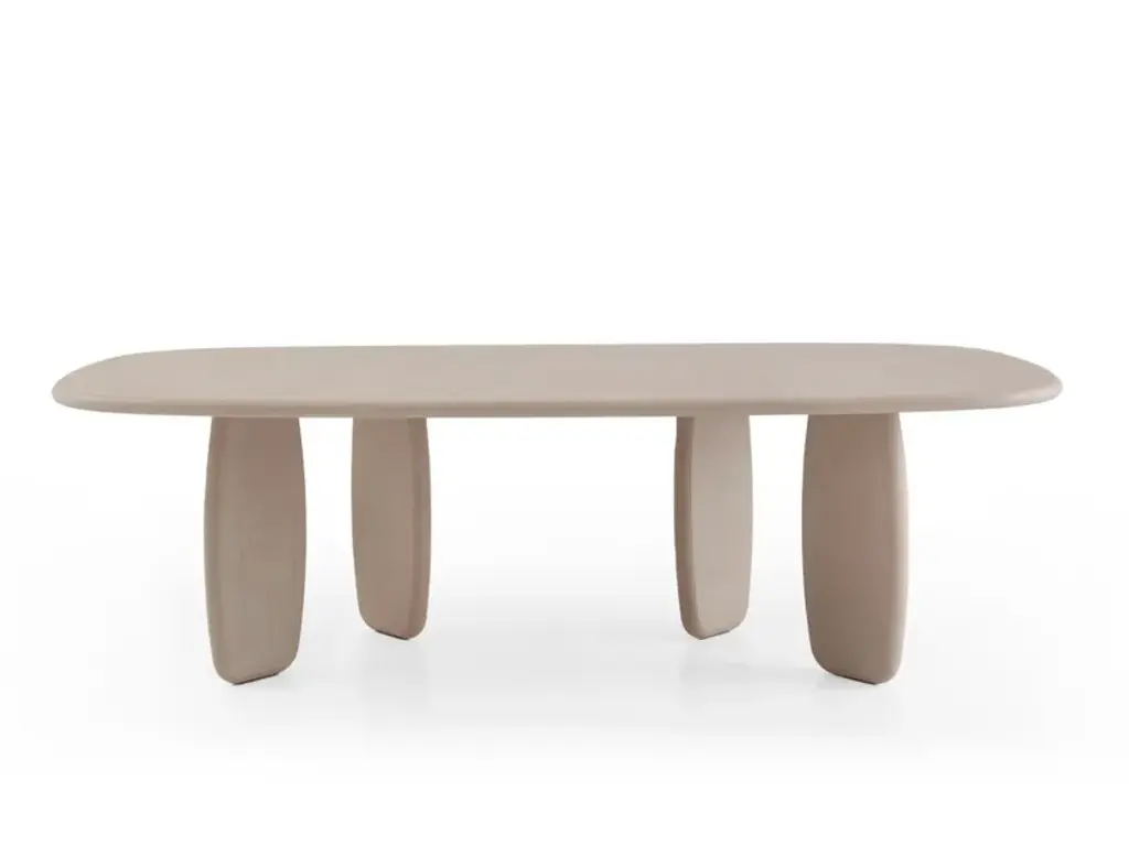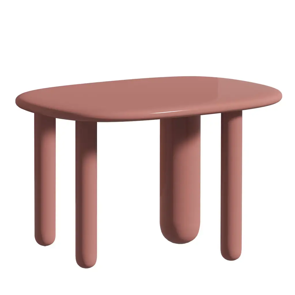 Tottori is a coffee table with an unusual three-leg base. The distinctive features of these small tables are the soft, rounded shape of the MDF top with a shaped edge, and by the generous diameter of the turned solid wood legs. The finish is a fine textured lacquer proposed in pastel shades.