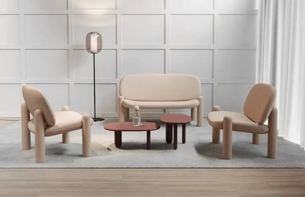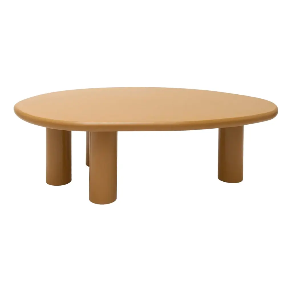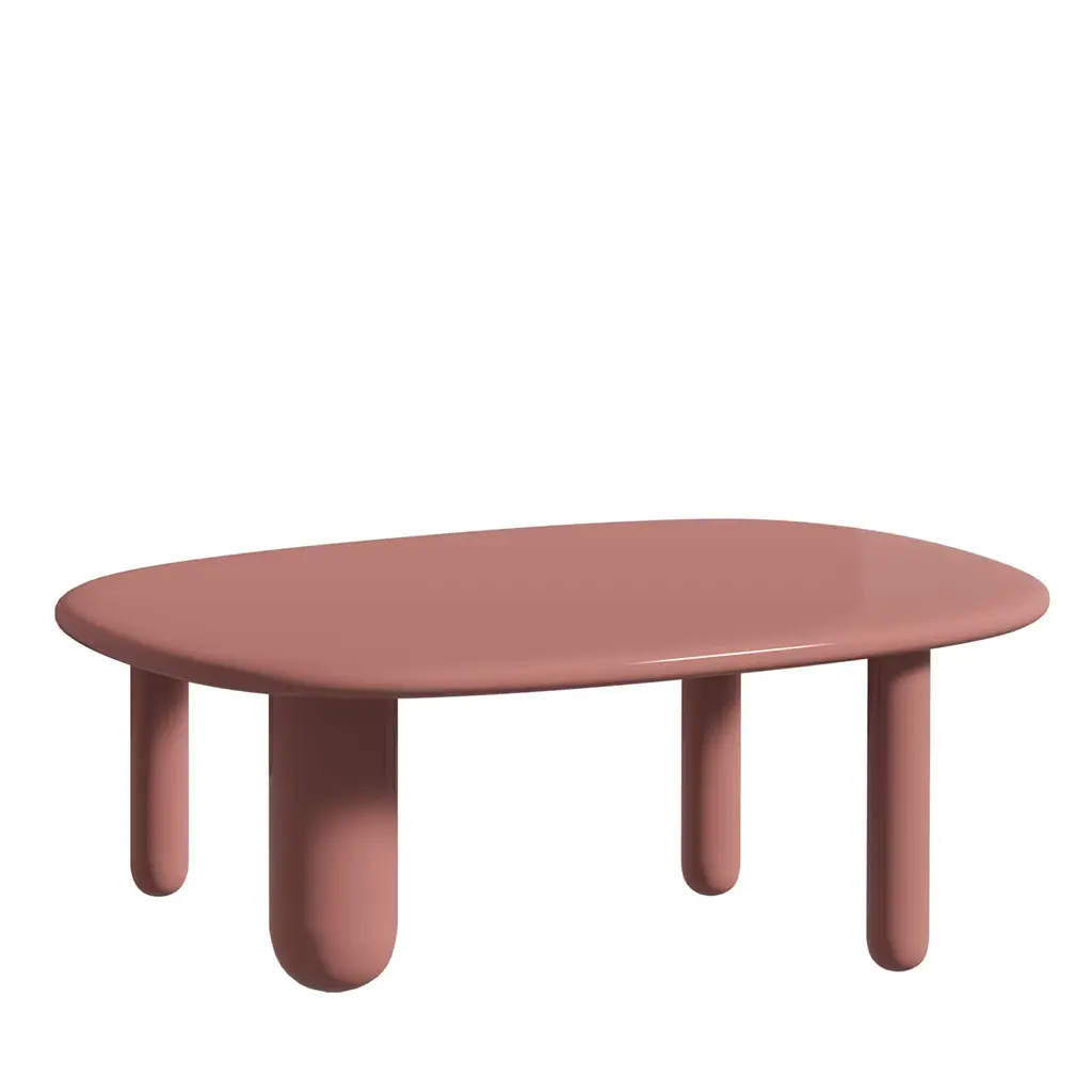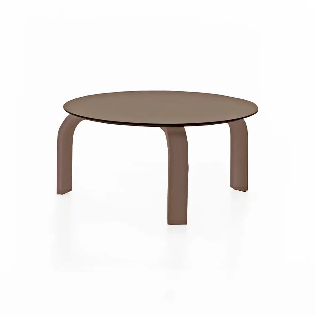 Tottori is a coffee table with an unusual three-leg base. The distinctive features of these small tables are the soft, rounded shape of the MDF top with a shaped edge, and by the generous diameter of the turned solid wood legs. The finish is a fine textured lacquer proposed in pastel shades.
