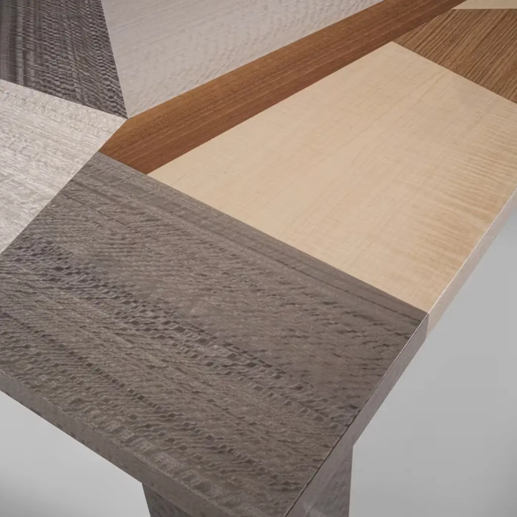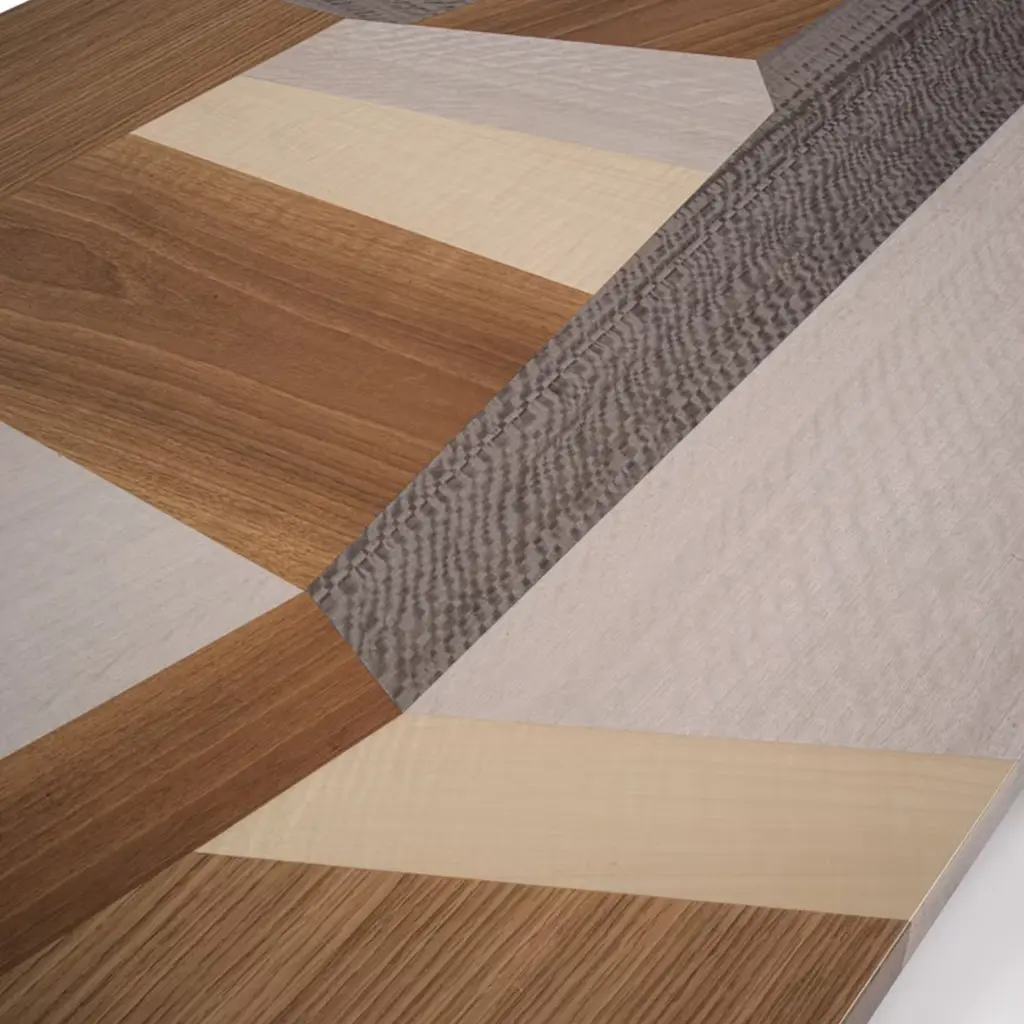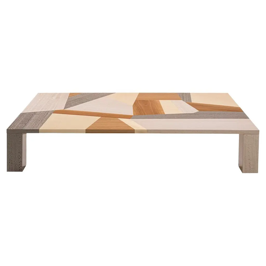 A clever arrangement of vibrant wood inlays in contrasting tones blending cool, neutral, and warm shades lends this coffee table its superb dynamism, emphasized by the inlays' sharp and irregular cut. The extremely minimalist silhouette counterbalances the daring design, where nature - with its natural grain - meets unrivaled craftsmanship. The piece is enriched with a glossy finish.